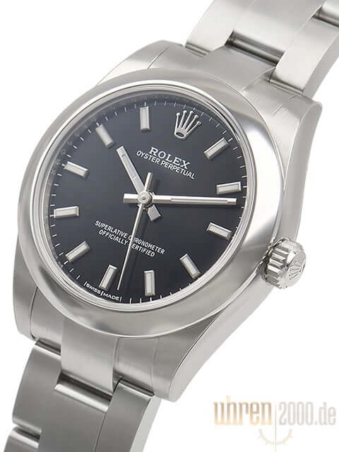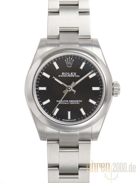 Gehäuse aus Edelstahl poliert und satiniert, Gehäusedurchmesser 31 mm, Oyster Edelstahlband poliert und satiniert mit Faltschließe, schwarzes Zifferblatt mit aufgesetzten Indizes, Rolex Manufakturkaliber 2231, Saphirglas, Wasserdicht bis 10 bar.