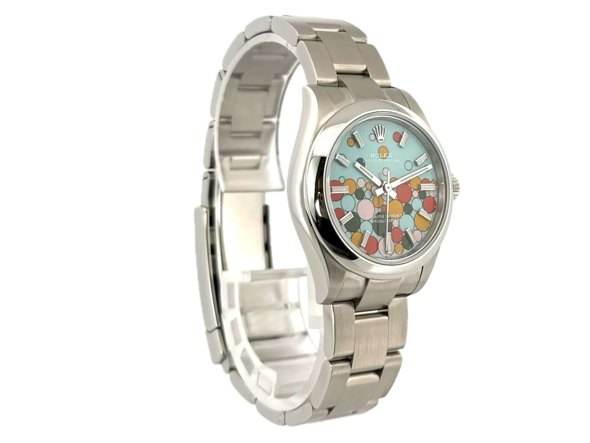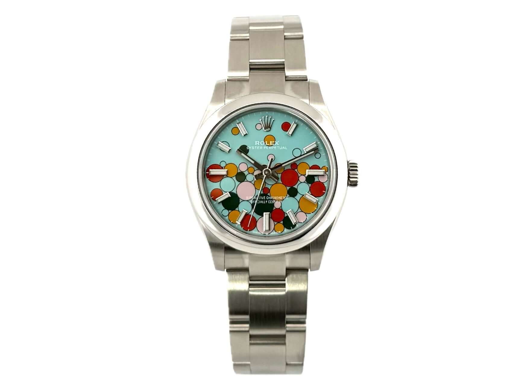 Gehäuse aus Edelstahl poliert und satiniert, Gehäusedurchmesser 31 mm, Oyster Edelstahlband poliert und satiniert mit Faltschließe, türkisblau Celebration Zifferblatt mit aufgesetzten Leuchtindizes, Leuchtzeiger, Automatik, Rolex Manufakturkaliber 2232, 55 Stunden Gangreserve, Chronometer, Saphirglas, Wasserdicht bis 10 bar.