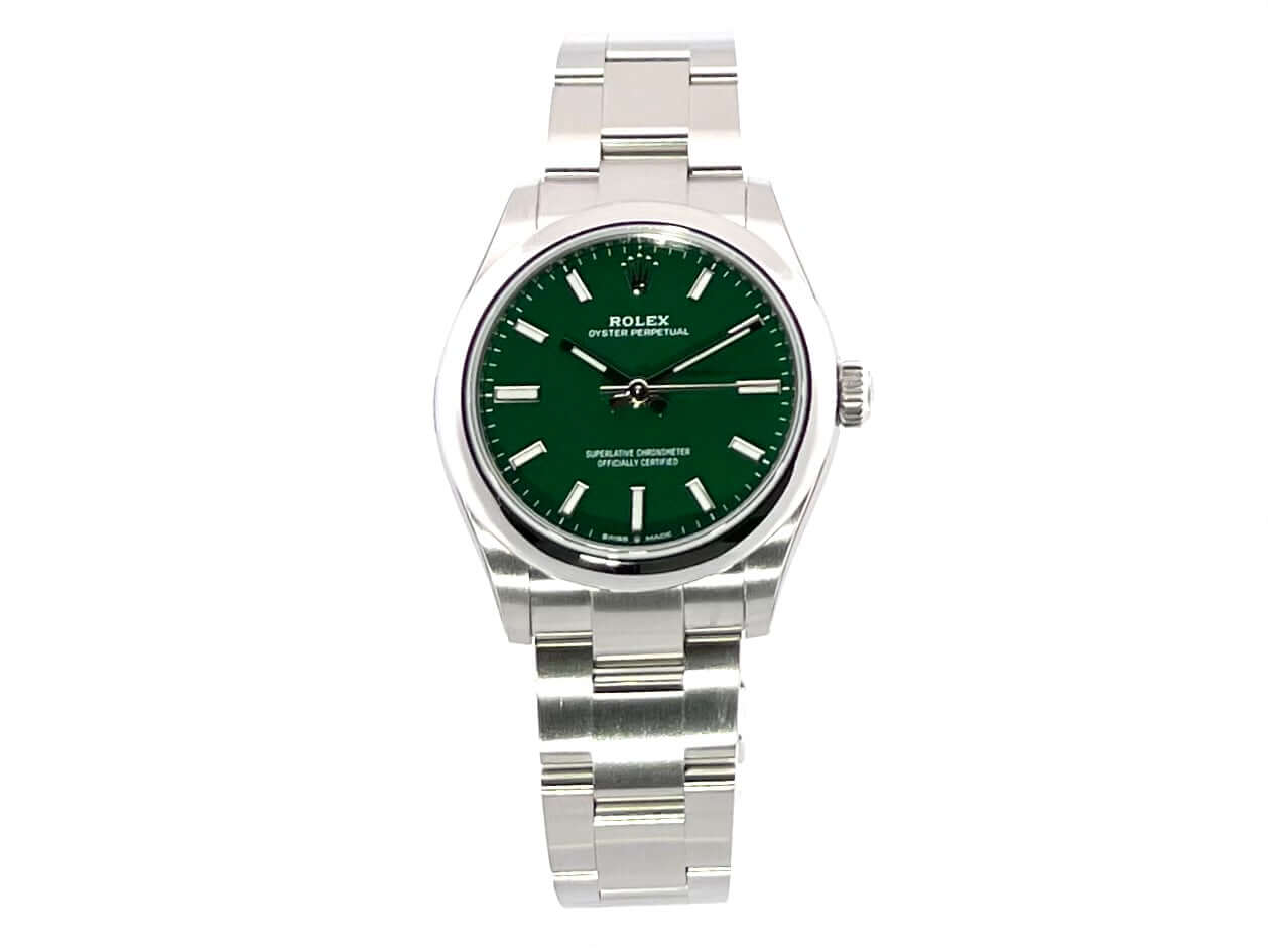 Gehäuse aus Edelstahl poliert und satiniert, Gehäusedurchmesser 31 mm, Oyster Edelstahlband poliert und satiniert mit Faltschließe, grünes Zifferblatt mit aufgesetzten Indizes, Automatik, Rolex Manufakturkaliber 2232, 55 Stunden Gangreserve, Chronometer, Saphirglas, wasserdicht bis 10 bar.