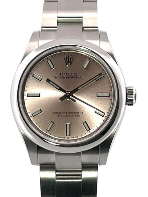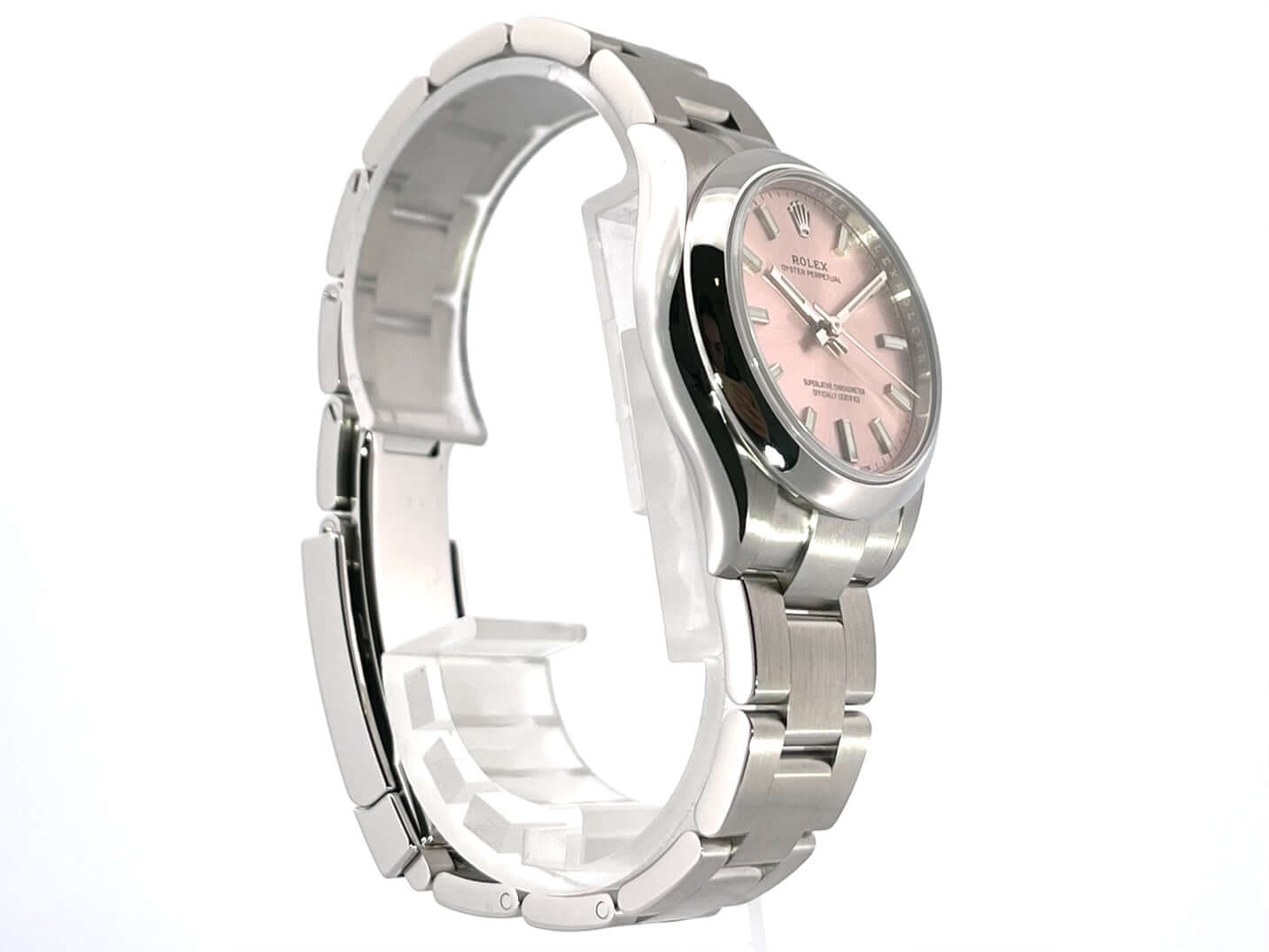 Gehäuse aus Edelstahl poliert und satiniert, Gehäusedurchmesser 31 mm, Oyster Edelstahlband poliert und satiniert mit Faltschließe, pinkfarbenes Zifferblatt mit aufgesetzten Leuchtindizes, Leuchtzeiger, Automatik, Rolex Manufakturkaliber 2232, 55 Stunden Gangreserve, Chronometer, Saphirglas, Wasserdicht bis 10 bar.
