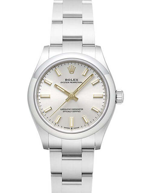 Gehäuse aus Edelstahl poliert und satiniert, Gehäusedurchmesser 31 mm, Oyster Edelstahlband poliert und satiniert mit Faltschließe, silberfarbenes Zifferblatt mit aufgesetzten Indizes, Automatik, Rolex Manufakturkaliber 2232, 55 Stunden Gangreserve, Chronometer, Saphirglas, wasserdicht bis 10 bar.