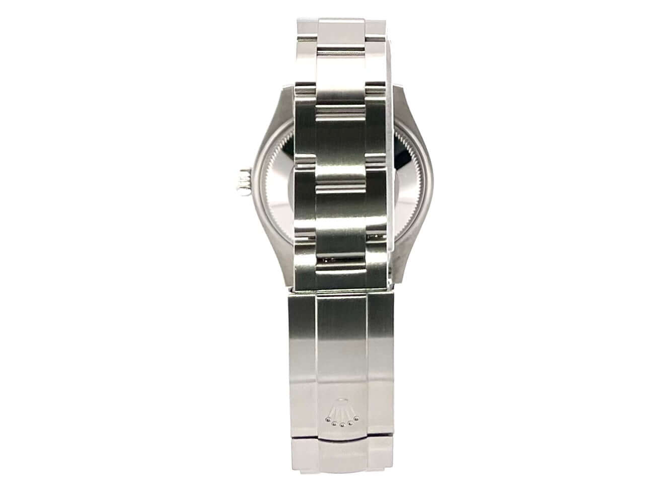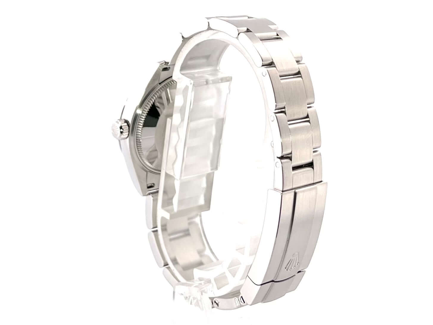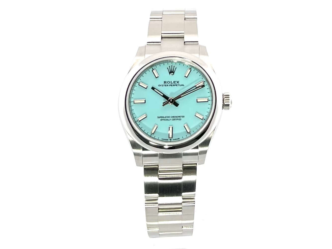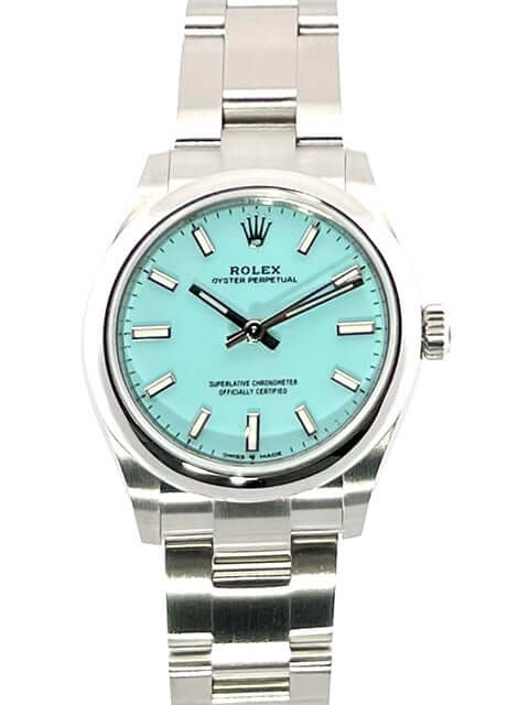 Gehäuse aus Edelstahl poliert und satiniert, Gehäusedurchmesser 31 mm, Oyster Edelstahlband poliert und satiniert mit Faltschließe, türkisblaues Zifferblatt mit aufgesetzten Indizes, Automatik, Rolex Manufakturkaliber 2232, 55 Stunden Gangreserve, Chronometer, Saphirglas, Wasserdicht bis 10 bar.