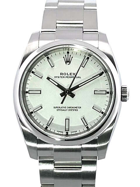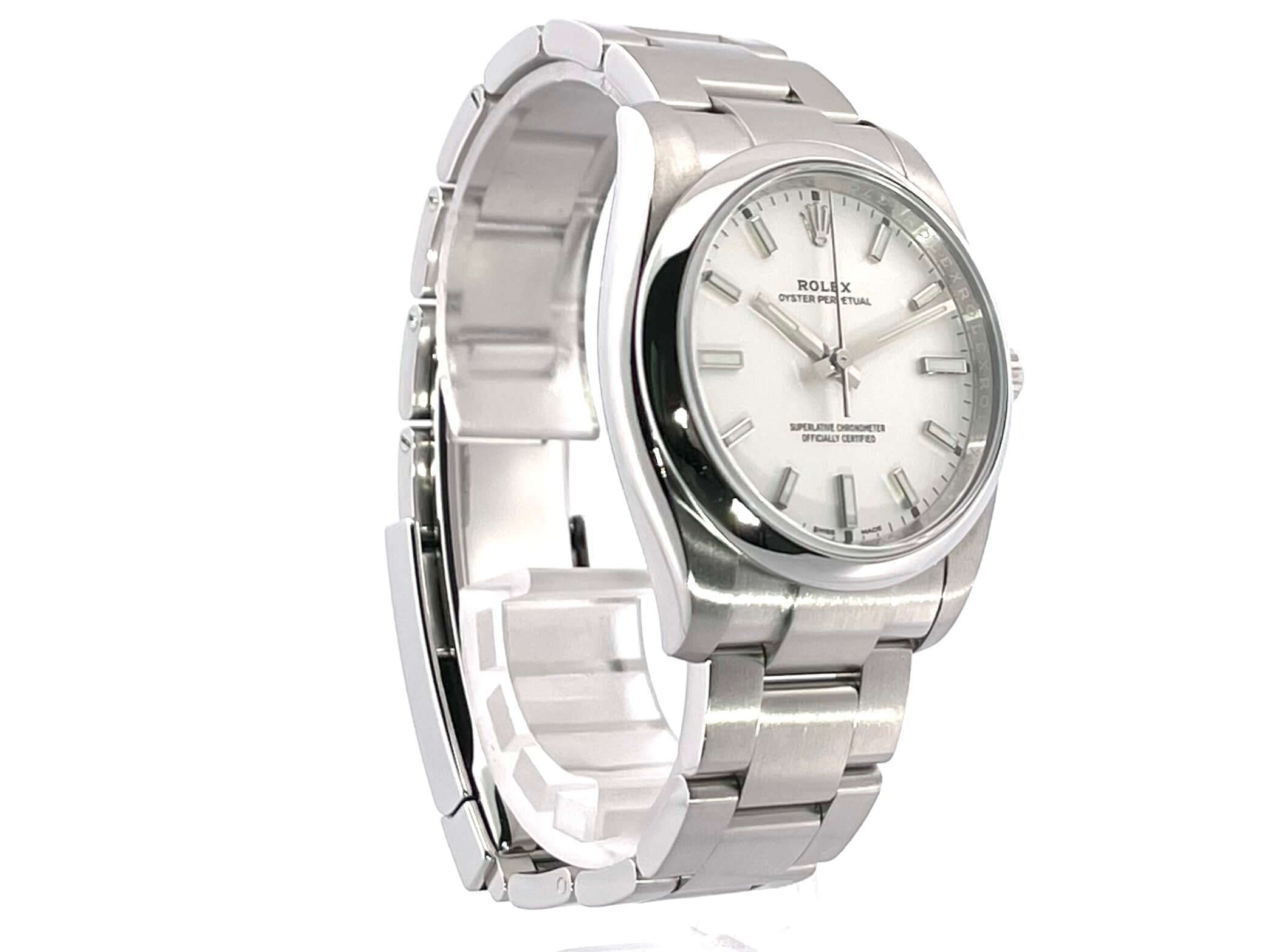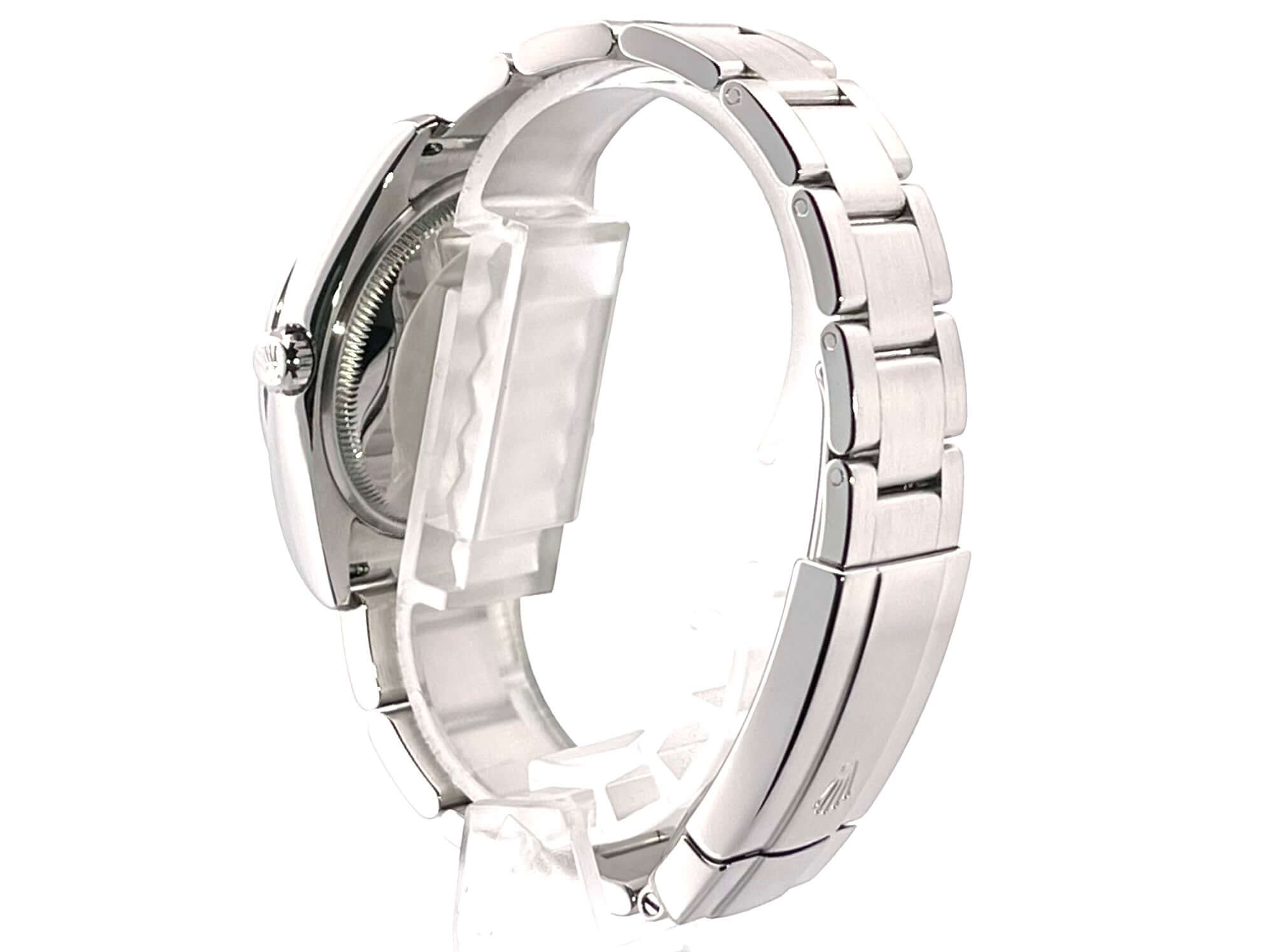 Gehäuse aus Edelstahl, Gehäusedurchmesser 34 mm, polierte Edelstahl Lünette, Oyster Edelstahlband poliert und satiniert mit Faltschließe, weißes Zifferblatt mit aufgesetzten Leuchtindizes, Leuchtzeiger, Automatik, Rolex Manufakturkaliber 3130, 48 Stunden Gangreserve, Saphirglas, Wasserdicht bis zu 10 bar.