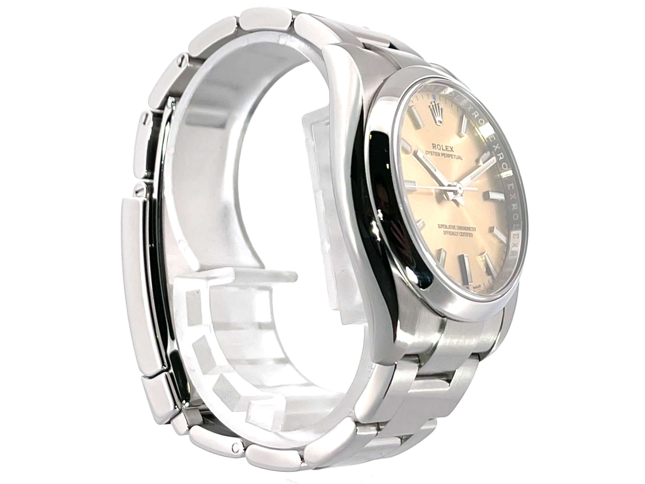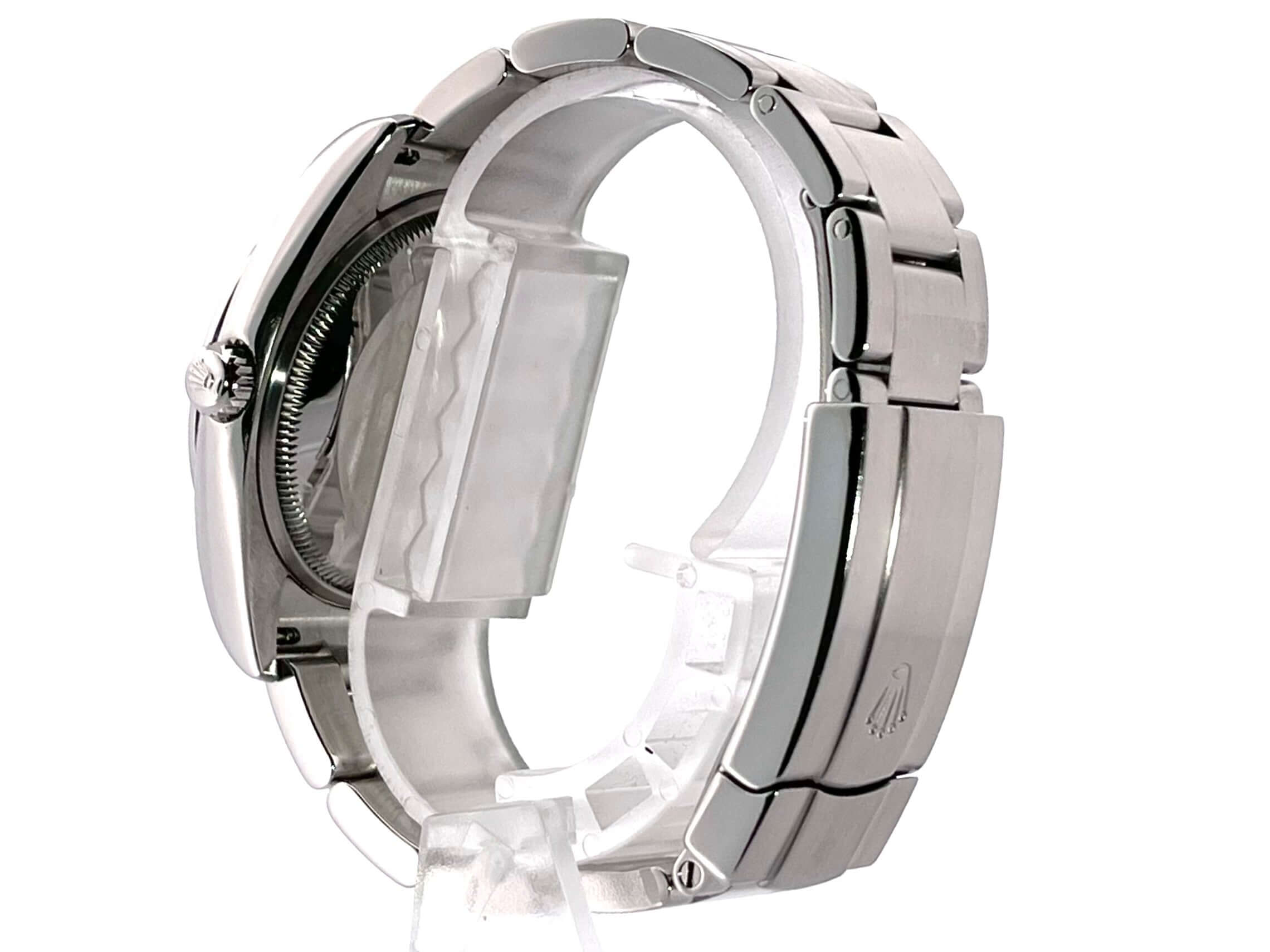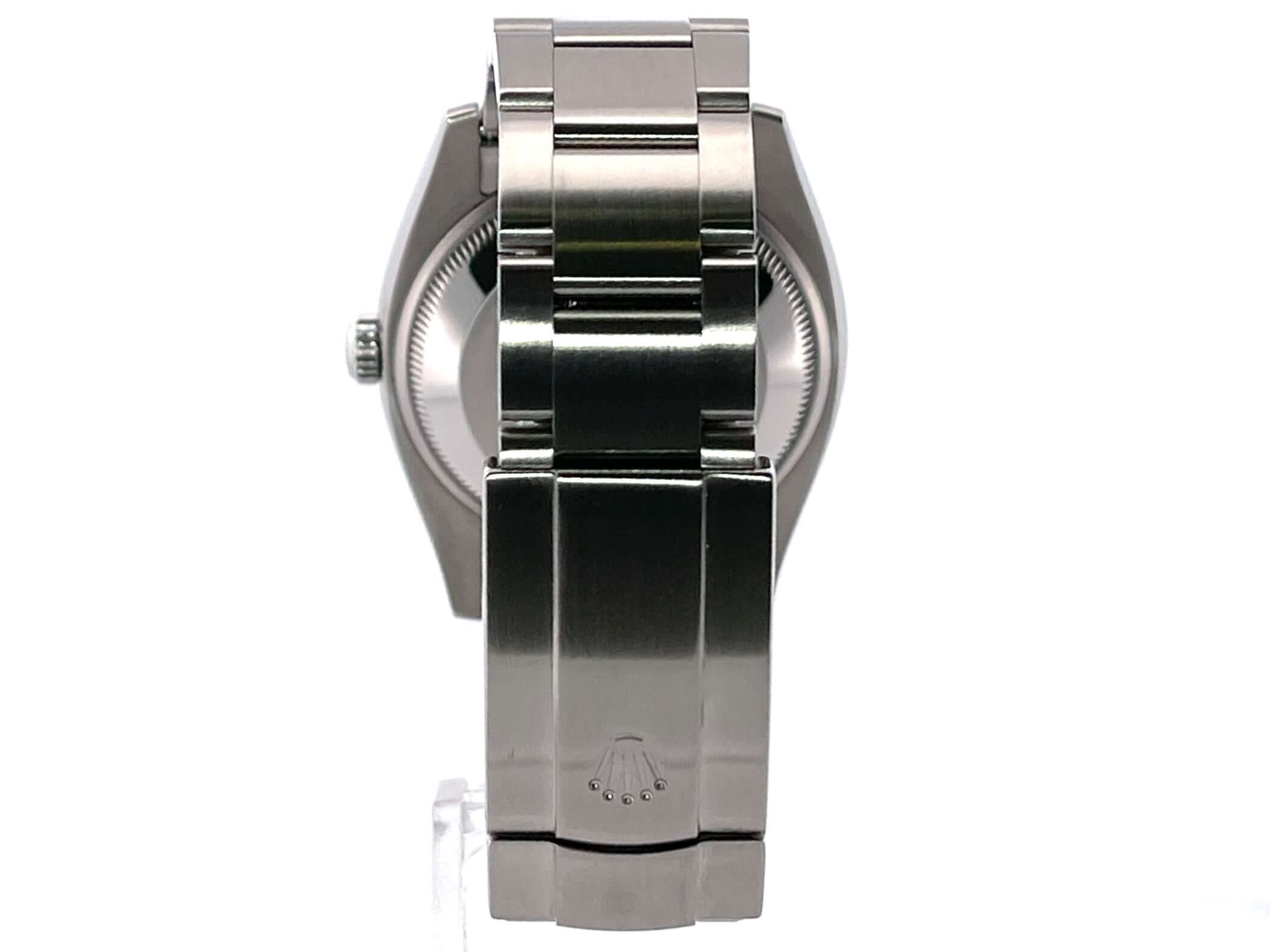 Gehäuse aus Edelstahl, Gehäusedurchmesser 34 mm, Oyster Edelstahl Armband poliert und satiniert mit Faltschließe, white grape Zifferblatt mit aufgesetzten Leuchtindizes, Automatik, Rolex Manufakturkaliber, Saphirglas, Wasserdicht bis zu 10 bar.