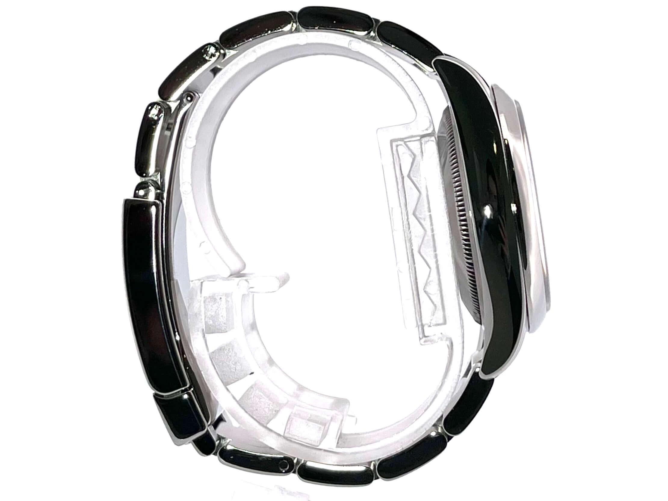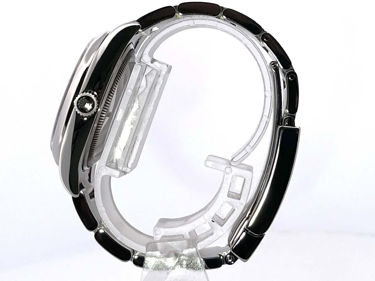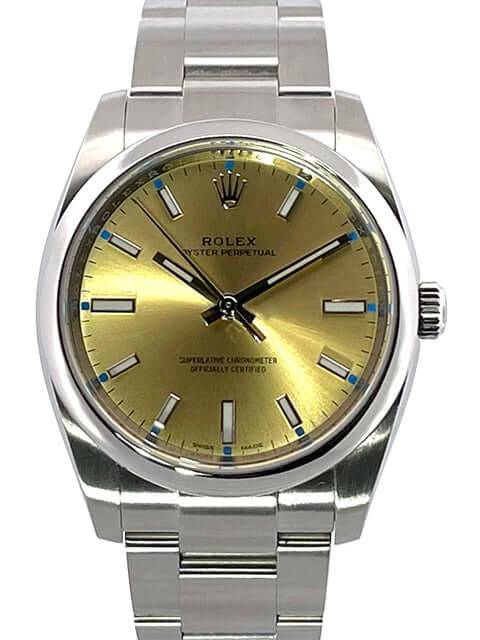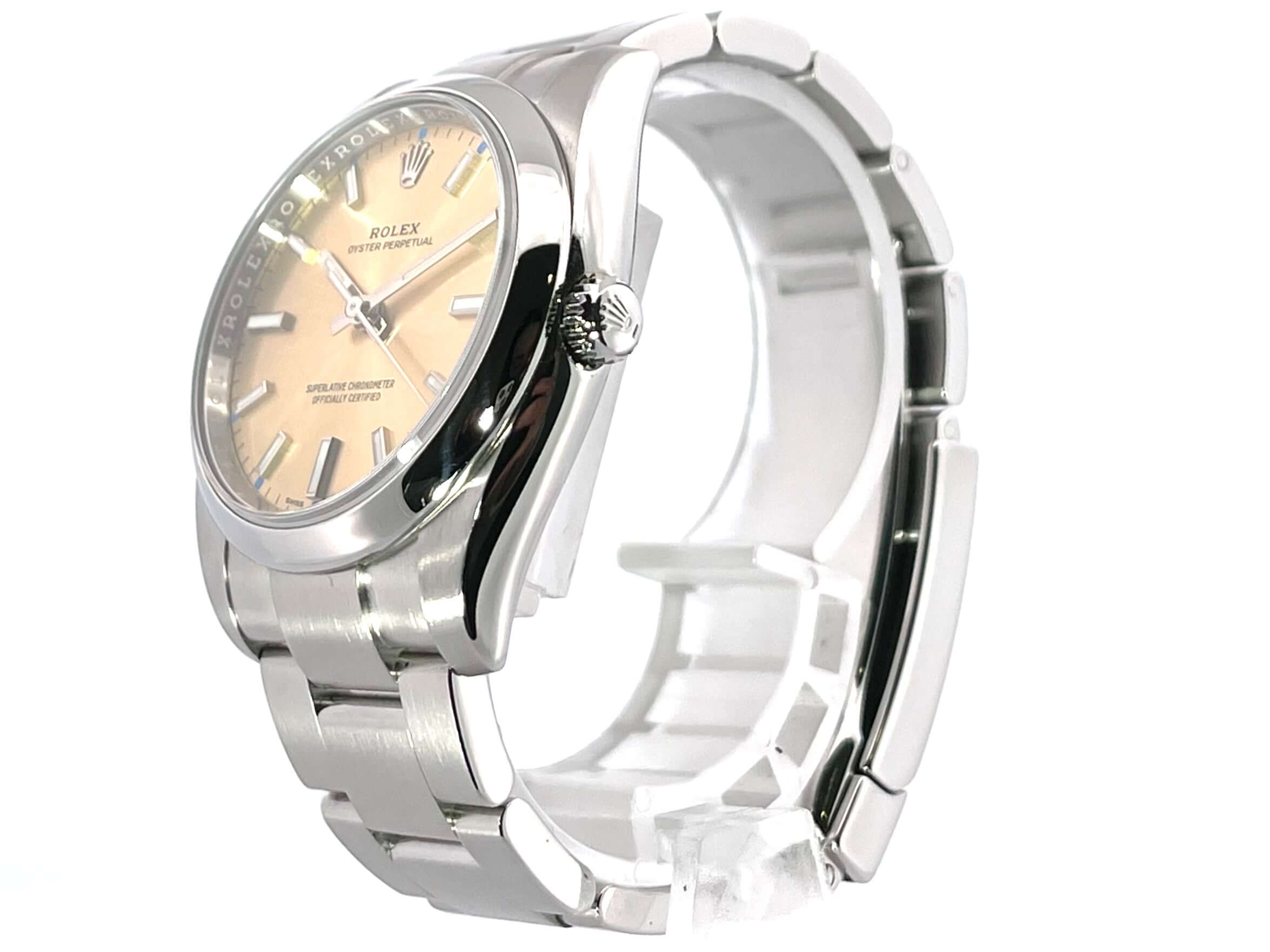Gehäuse aus Edelstahl, Gehäusedurchmesser 34 mm, Oyster Edelstahl Armband poliert und satiniert mit Faltschließe, white grape Zifferblatt mit aufgesetzten Leuchtindizes, Automatik, Rolex Manufakturkaliber, Saphirglas, Wasserdicht bis zu 10 bar.