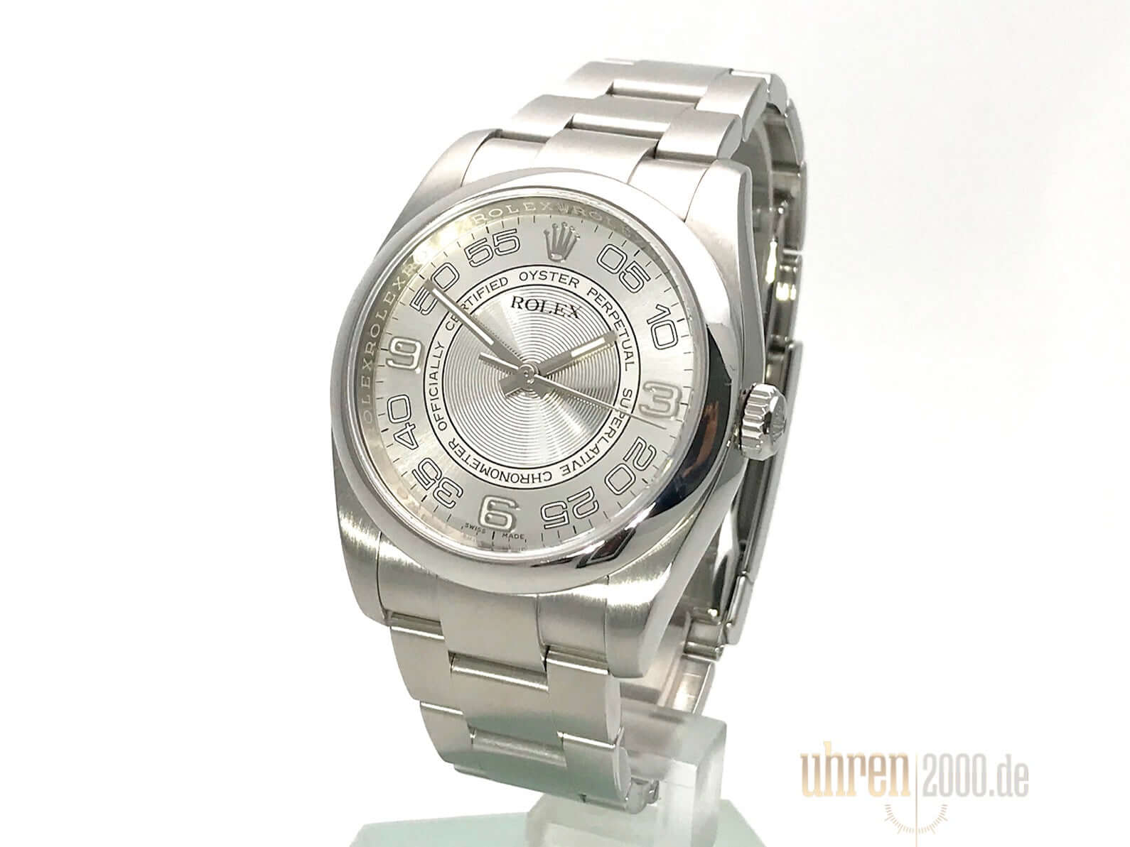 Gehäuse aus Edelstahl poliert und satiniert, Gehäusedurchmesser 36 mm, Oyster Edelstahl Armband satiniert mit Faltschließe, silberfarbenes Zifferblatt mit aufgesetzten arabischen Ziffern, Automatikwerk, Chronometer, Rolex Manufakturkaliber, Saphirglas, Wasserdicht bis 10 bar.
