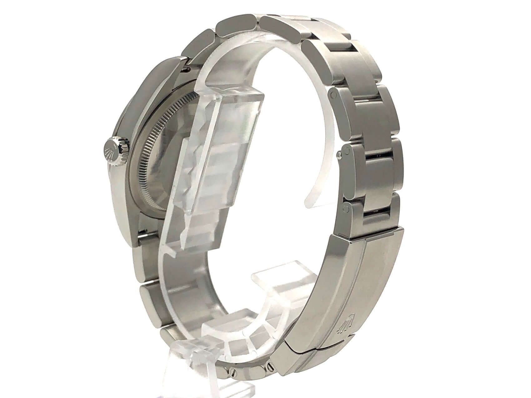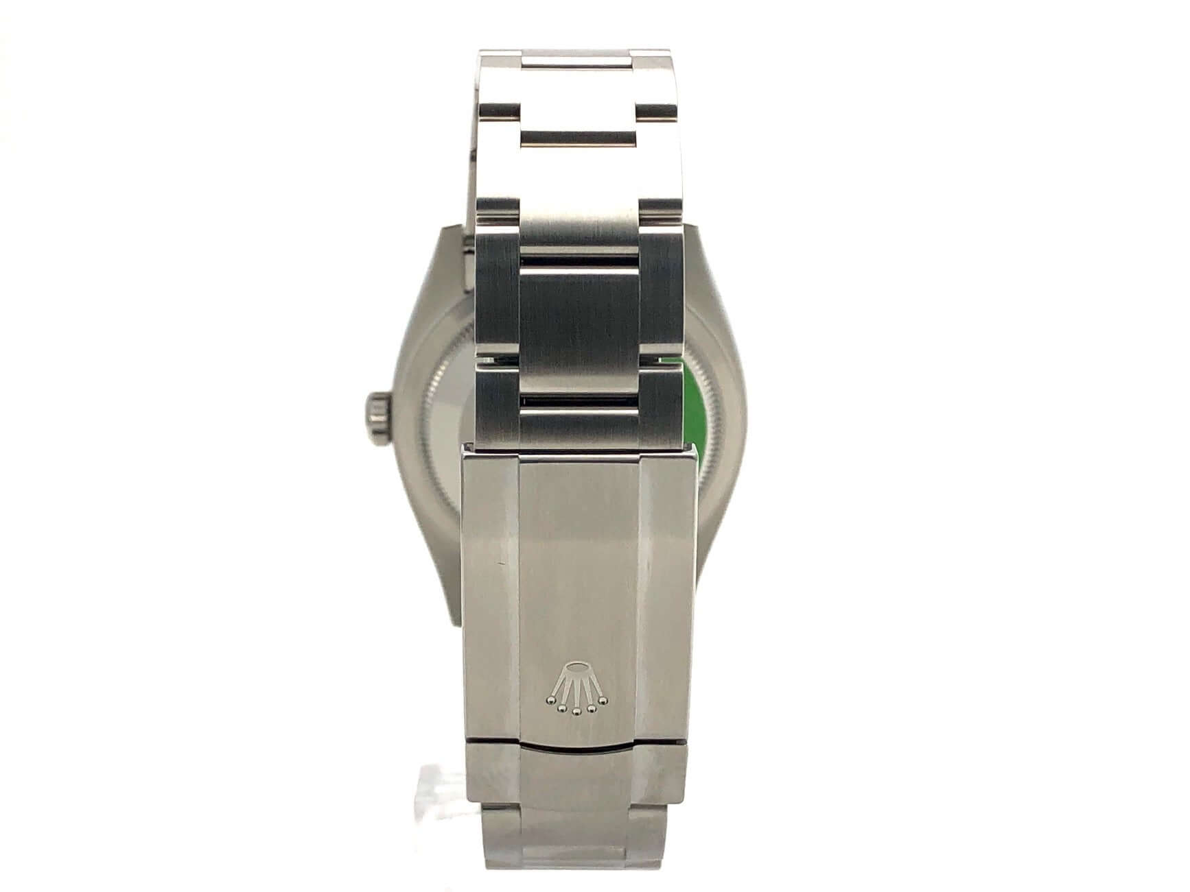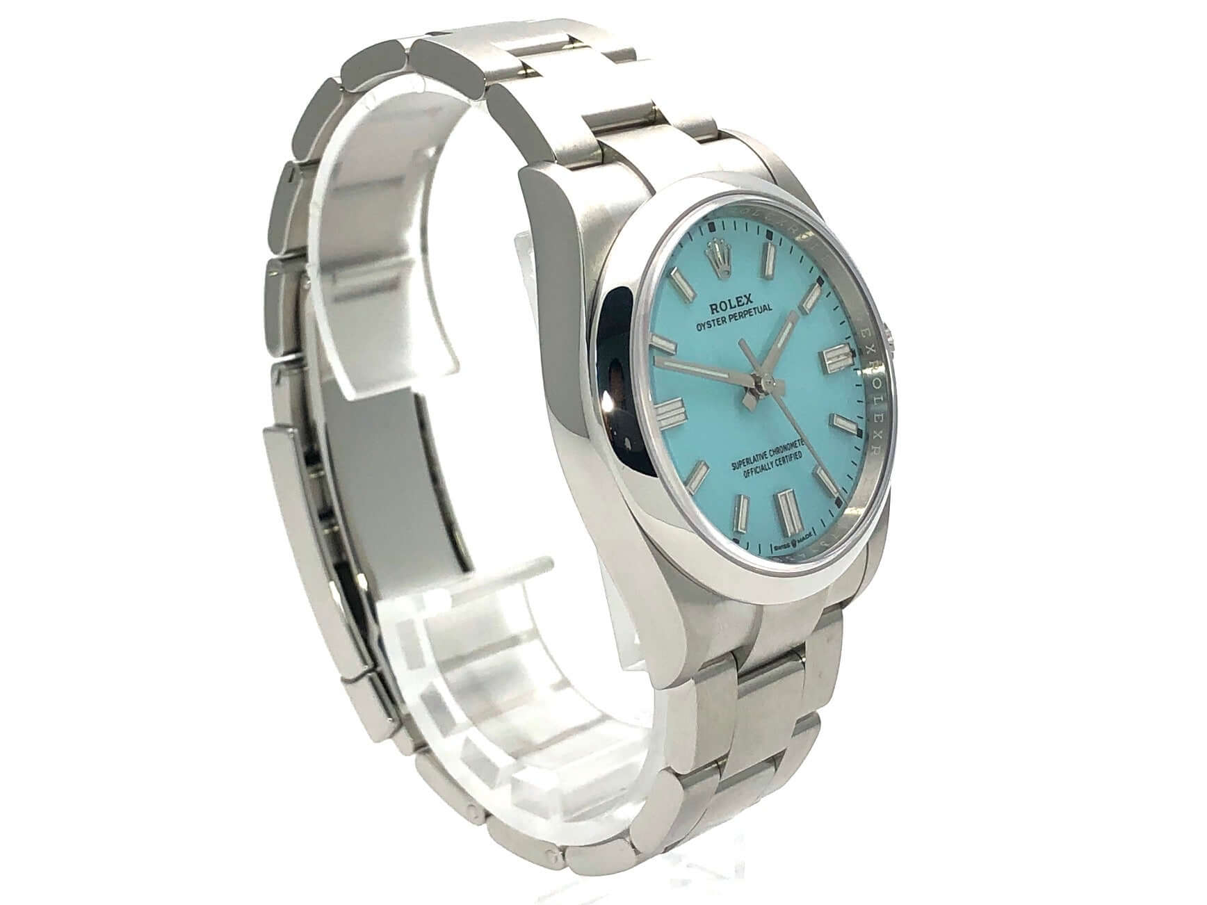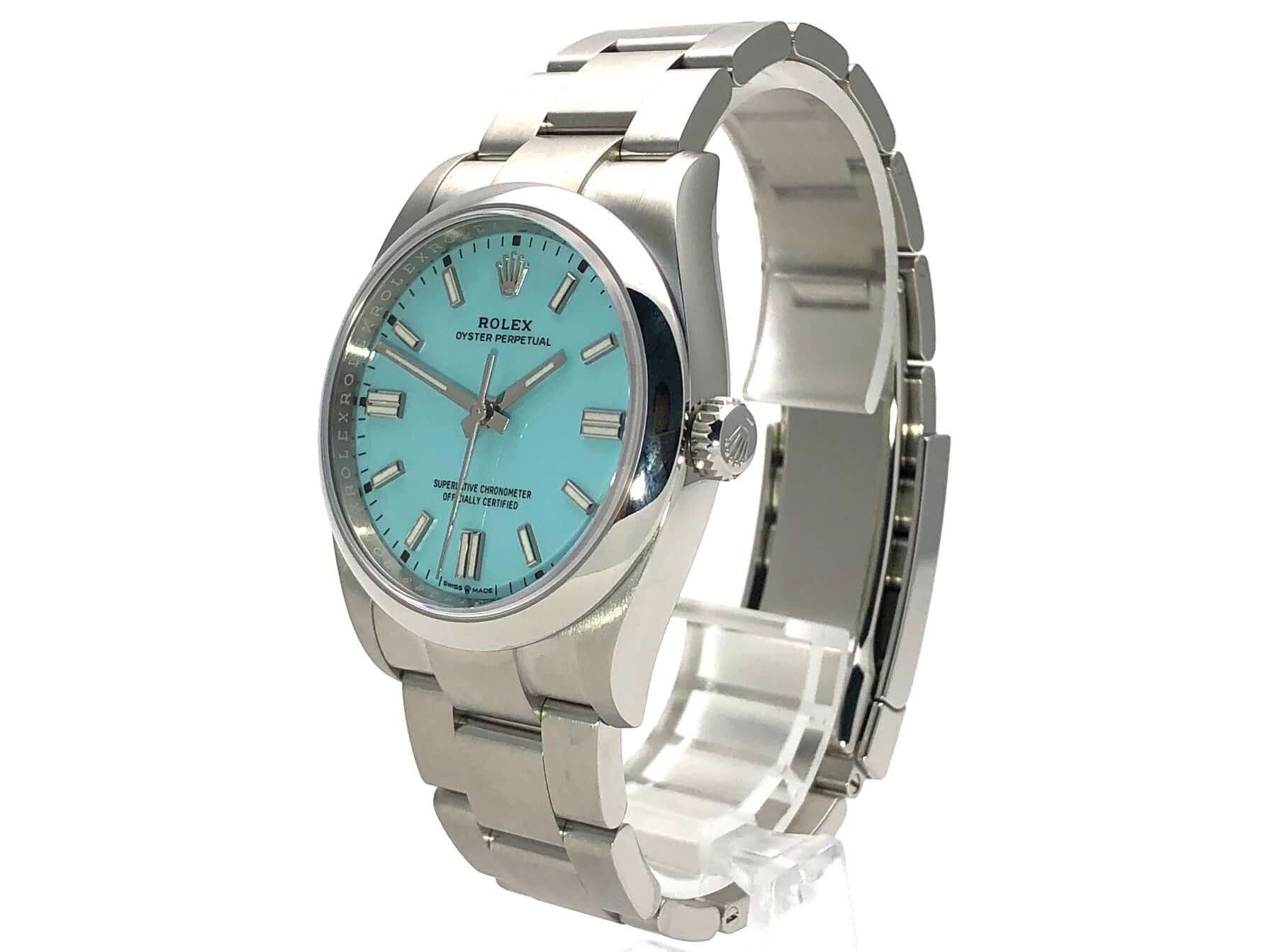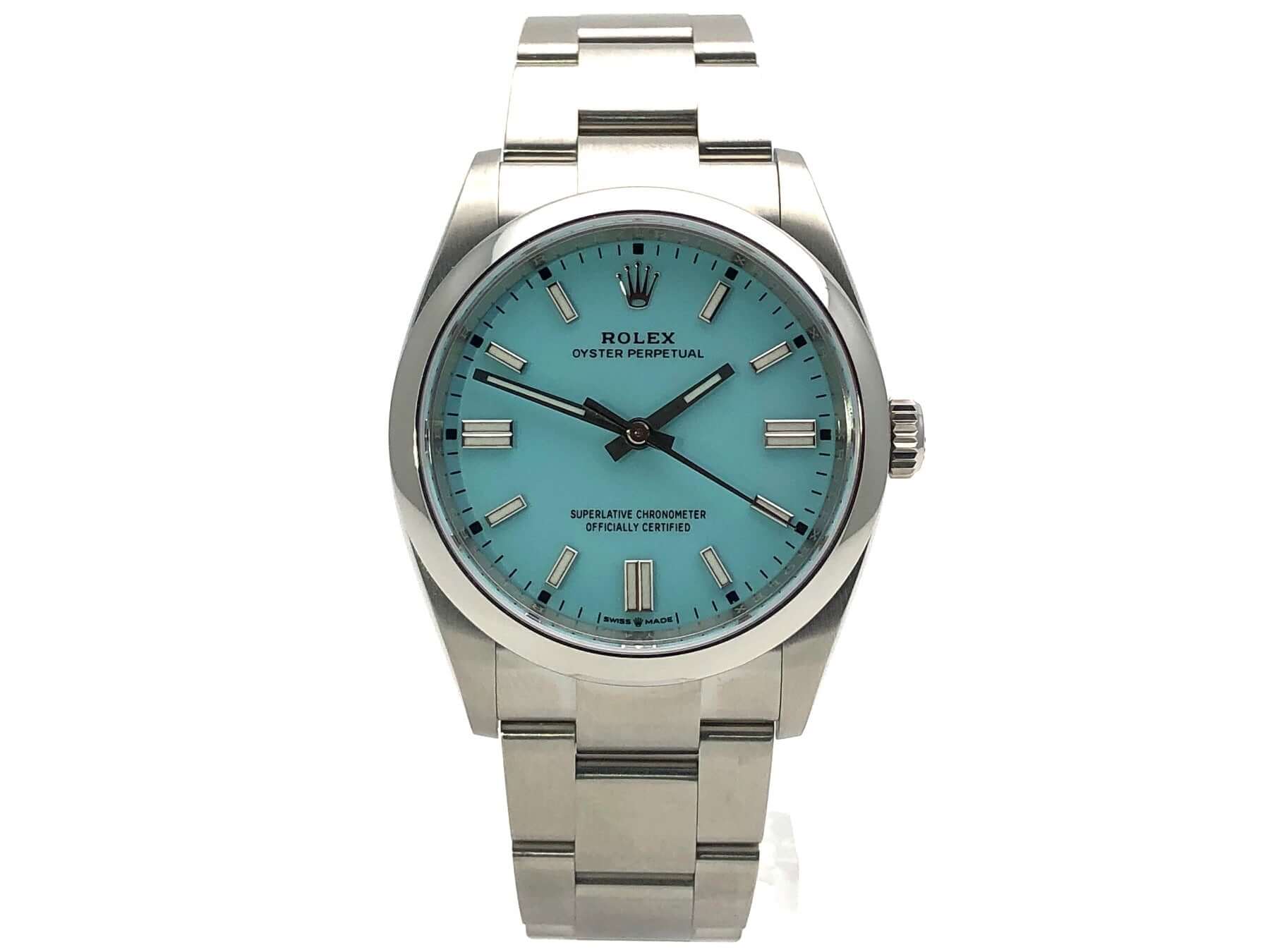 Gehäuse Edelstahl poliert und satiniert, Gehäusedurchmesser 36 mm, Oyster Edelstahl Armband satiniert mit Faltschließe, Türkisblaues Zifferblatt mit aufgesetzten Leuchtindizes, Automatikwerk, Rolex Manufakturkaliber 3230, 70 Stunden Gangreserve, Chronometer, Saphirglas, wasserdicht bis 10 bar.
