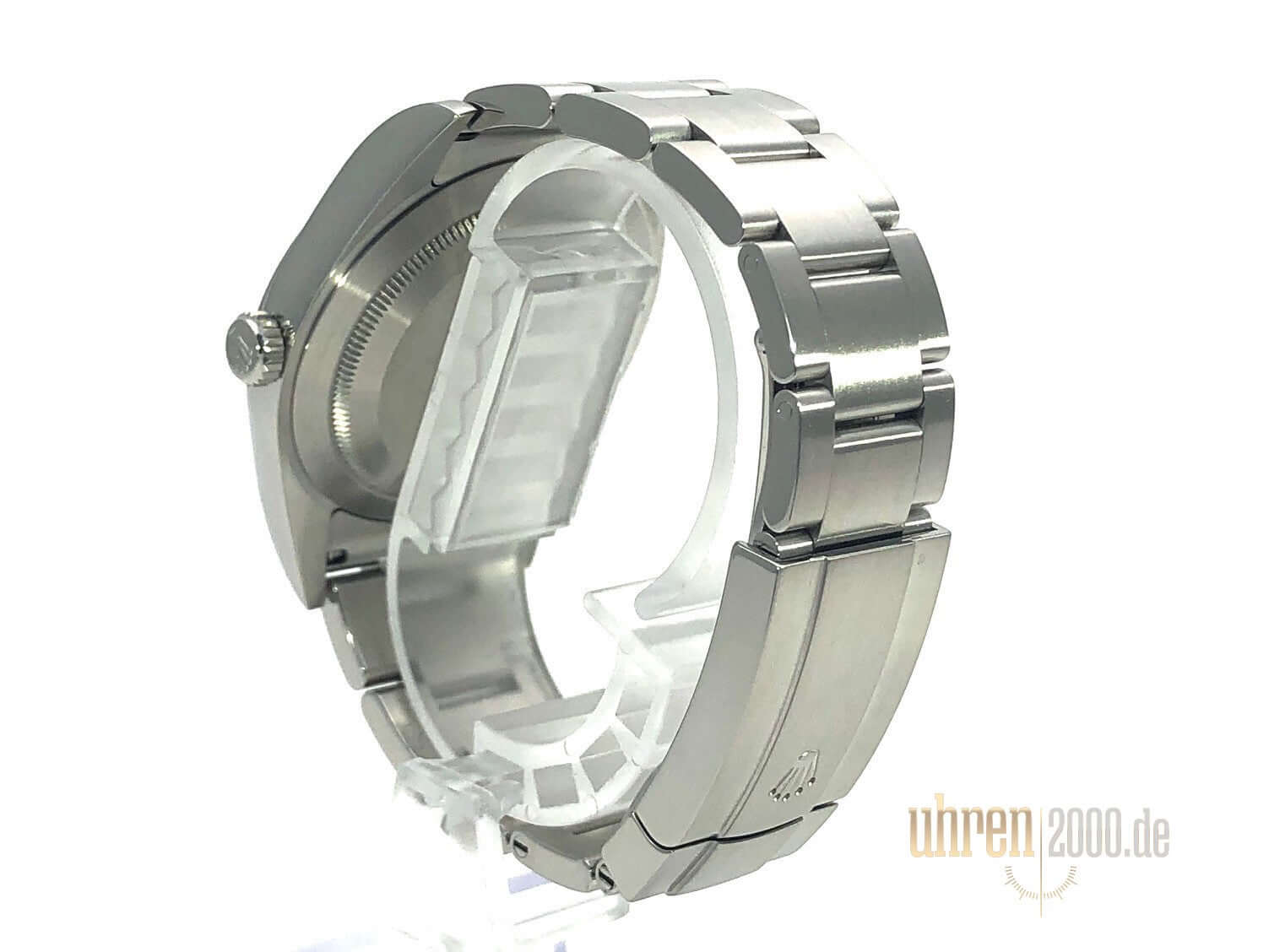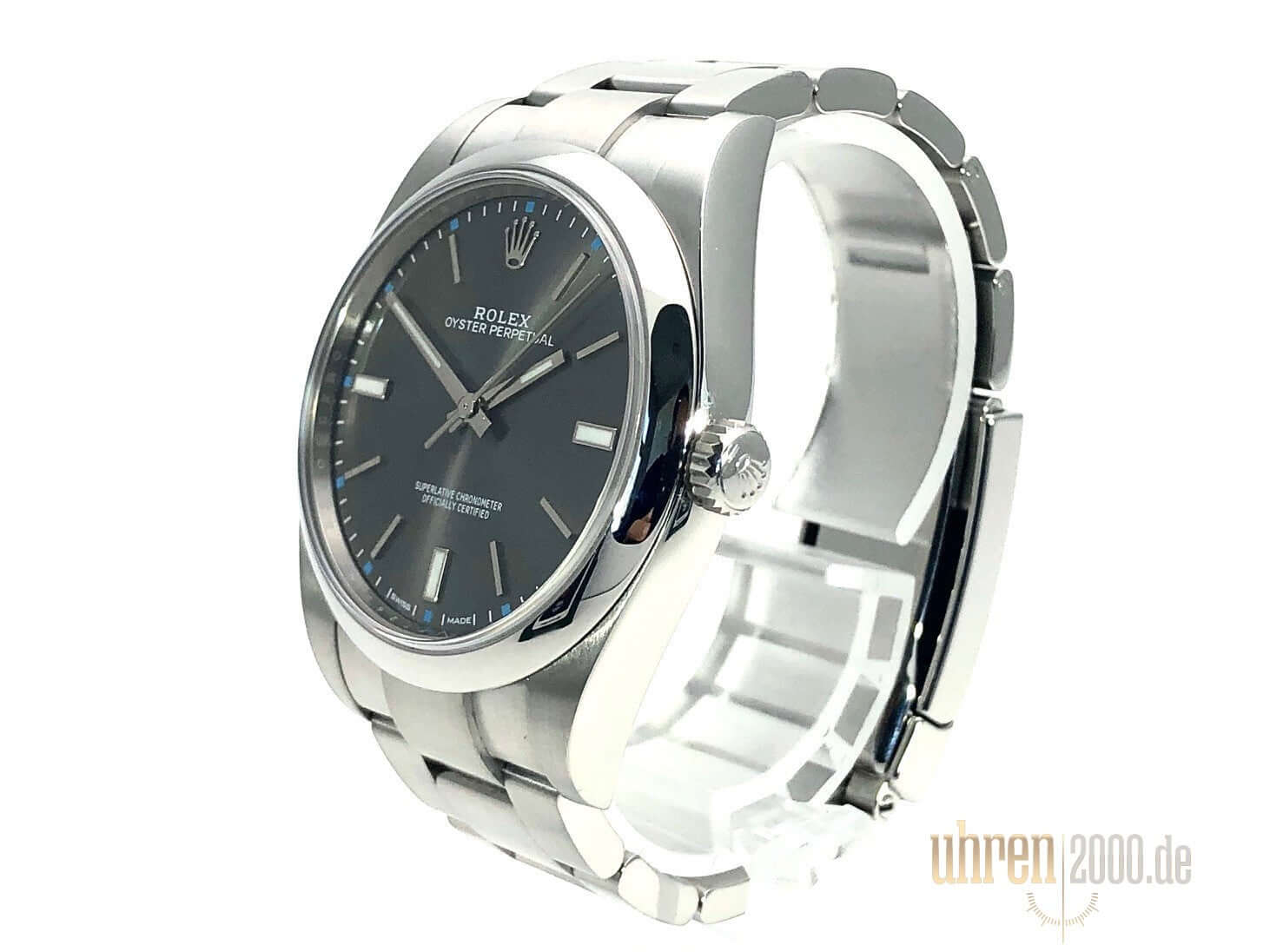 Gehäuse aus poliertem und satiniertem Edelstahl, Gehäusedurchmesser 39 mm, poliertes und satiniertes Oyster Edelstahl Armband mit Faltschließe, Zifferblatt in Grau mit Indizes, Rolex Manufakturkaliber 3132, Saphirglas, Wasserdicht bis 10 bar.