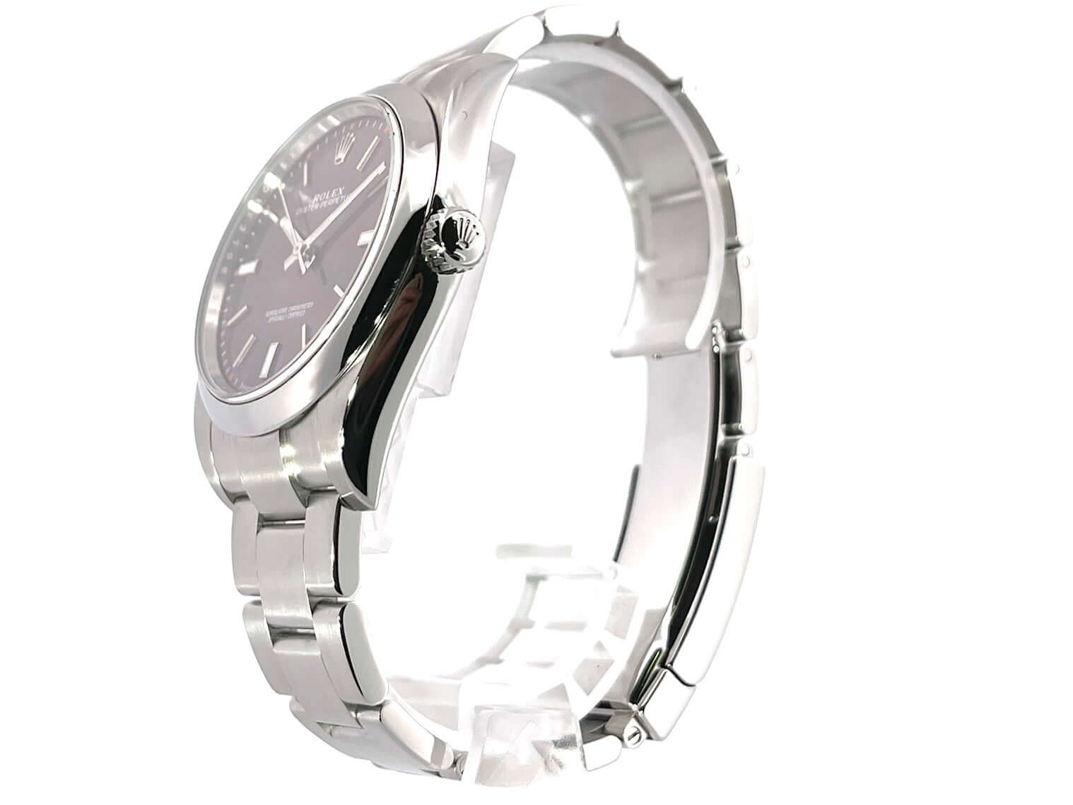 Gehäuse aus Edelstahl poliert und satiniert, Gehäusedurchmesser 39 mm, Oyster Edelstahl Armband poliert und satiniert mit Faltschließe, Zifferblatt red grape, Rolex Manufakturkaliber, Saphirglas, Wasserdicht bis 10 bar.