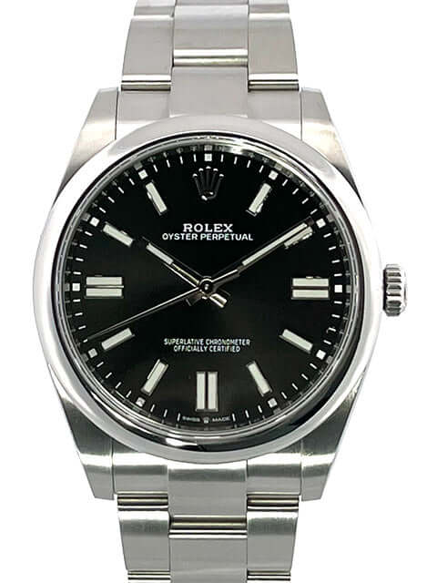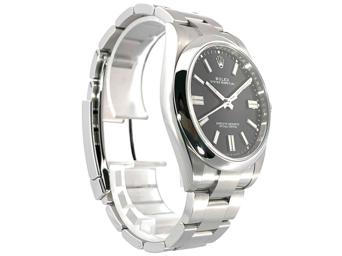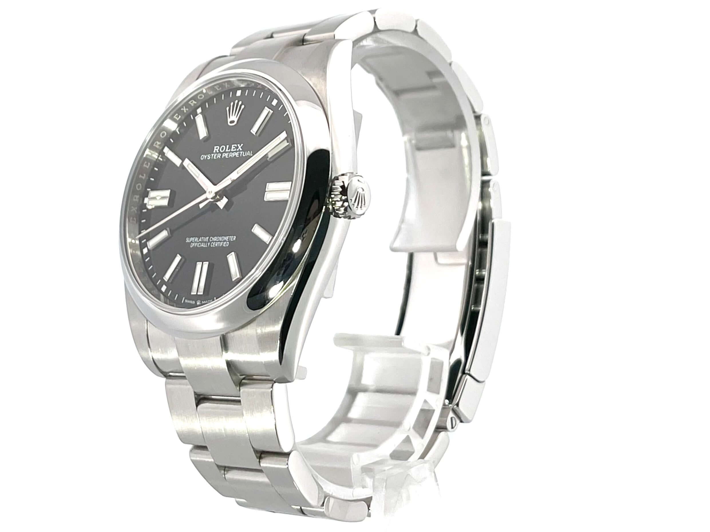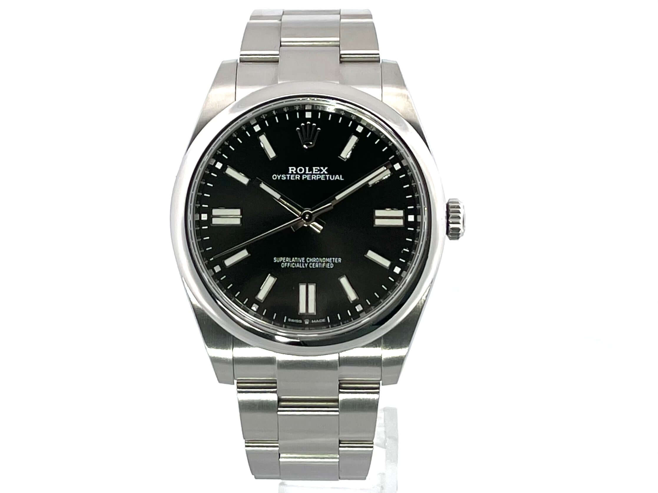 Gehäuse aus Edelstahl poliert und satiniert, Gehäusedurchmesser 41 mm, Oyster Edelstahlband mit Faltschließe, schwarzes Zifferblatt mit Indizes, Automatik, Rolex Manufakturkaliber 3230, Gangreserve 70 Stunden, Saphirglas, Wasserdicht bis 10 bar.