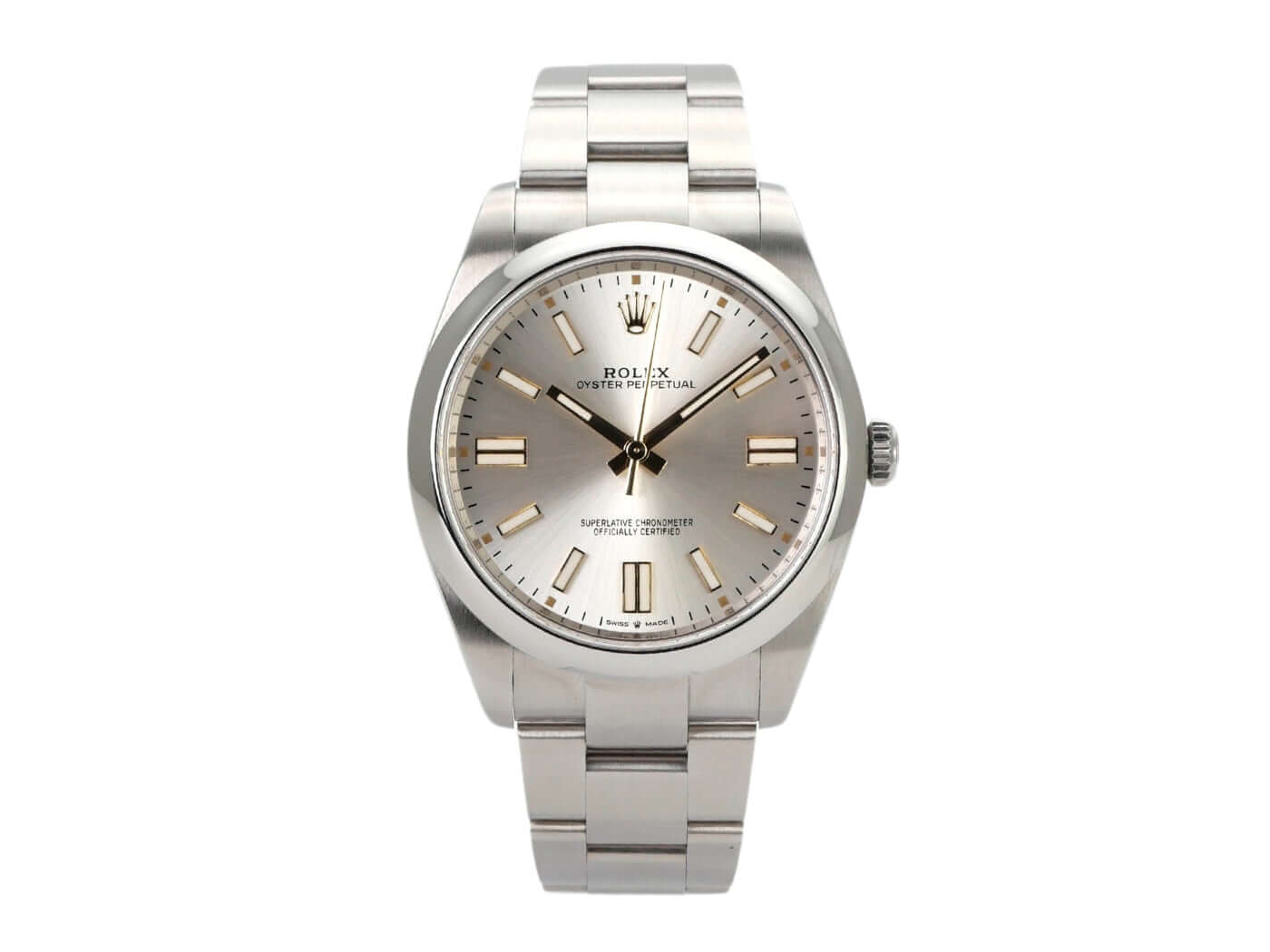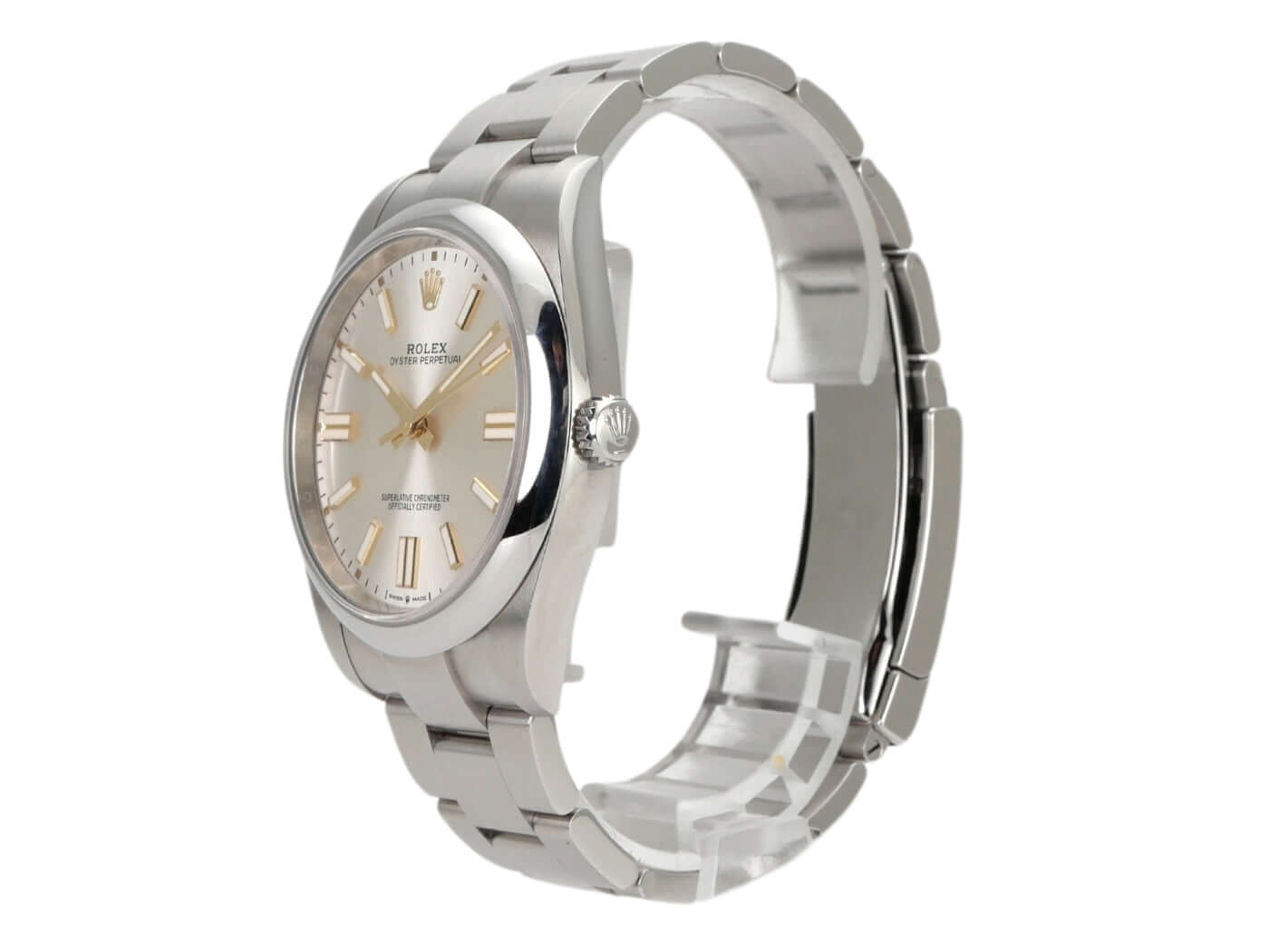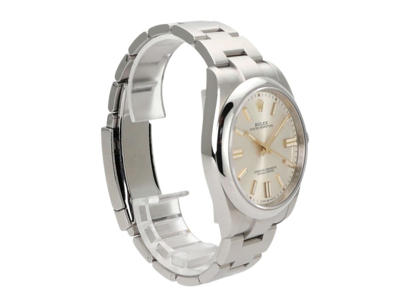 Gehäuse aus Edelstahl poliert und satiniert, Gehäusedurchmesser 41 mm, Oyster Edelstahlband mit Faltschließe, Silberfarbenes Zifferblatt mit Leuchtindizes, Leuchtzeiger, Automatik, Rolex Manufakturkaliber 3230, Gangreserve 70 Stunden, Saphirglas, wasserdicht bis 10 bar.