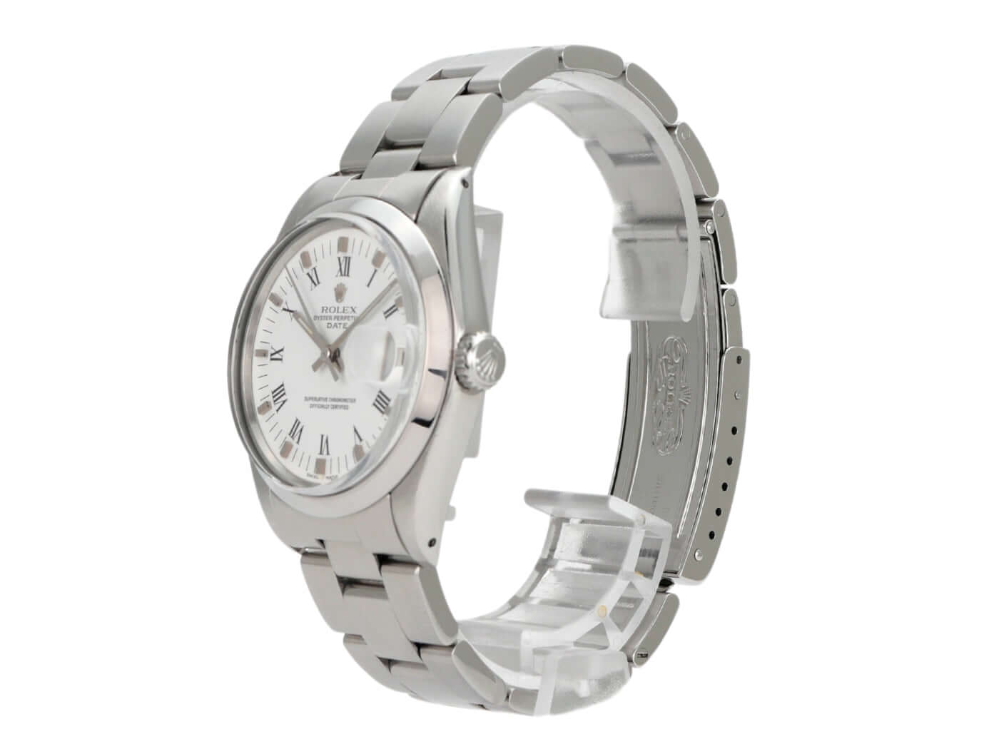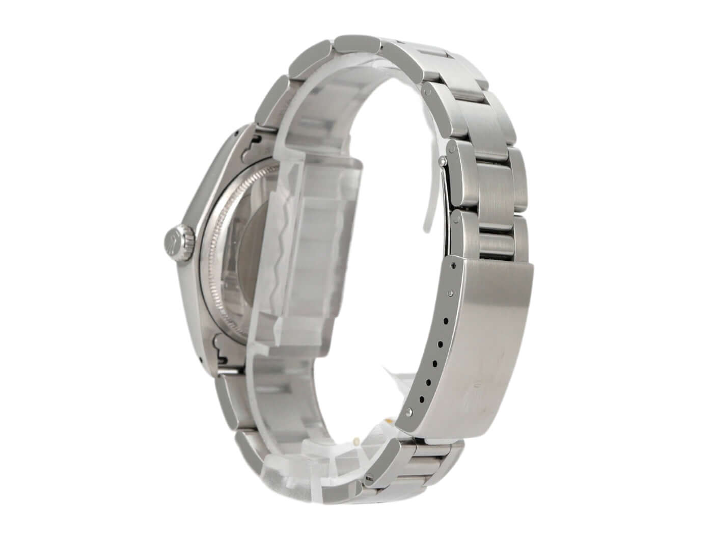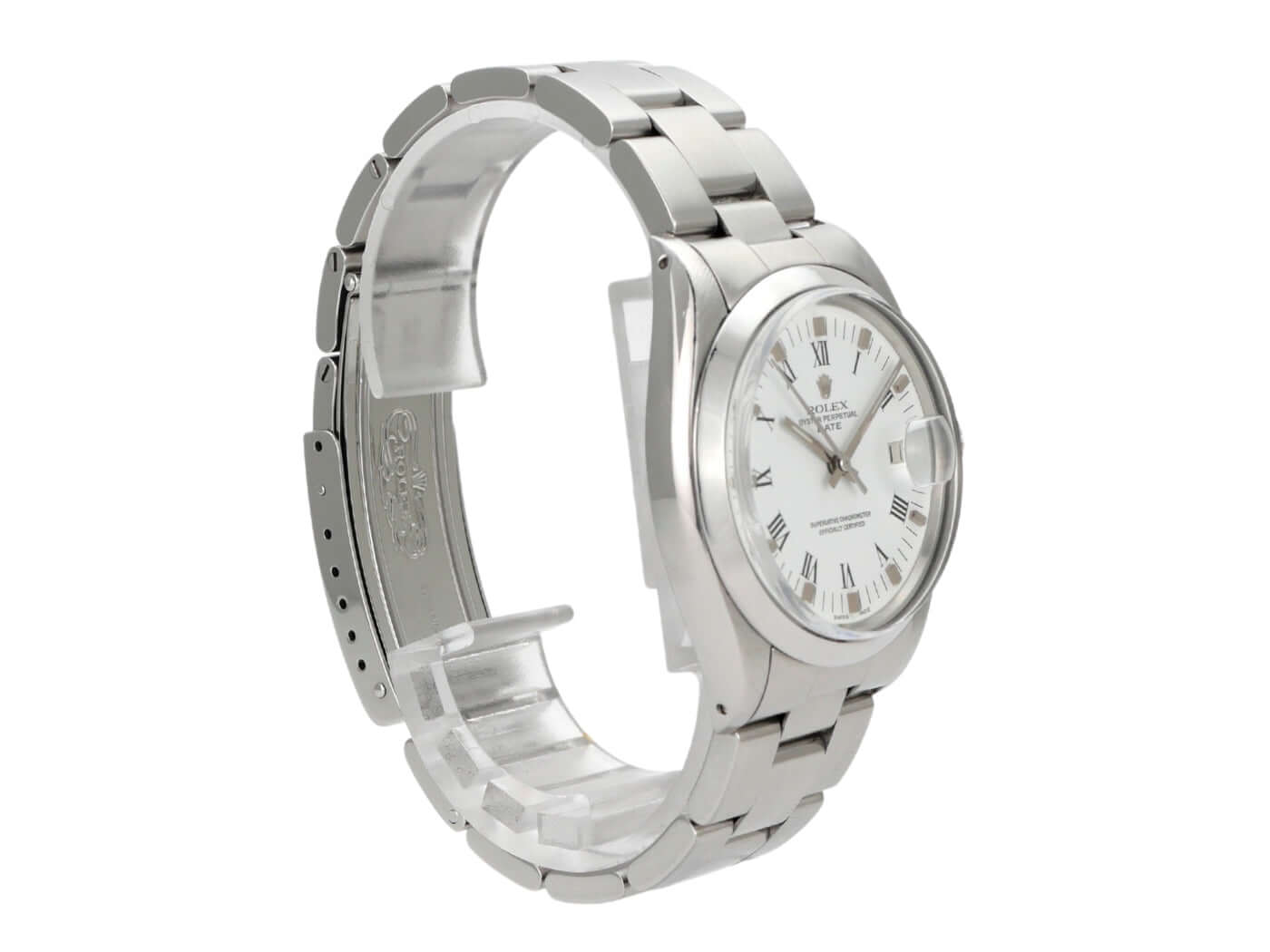 Gehäuse aus Edelstahl poliert und satiniert, Gehäusedurchmesser 34 mm, Edelstahl Lünette poliert, Oyster Edelstahlband poliert und satiniert mit Faltschließe, weißes Zifferblatt, Automatikwerk, Rolex Manufakturkaliber, 19.800 A/h, Datumsanzeige, Chronometer, Plexiglas, Krone verschraubbar, Edelstahlboden verschraubt, wasserdicht bis zu 10 bar.