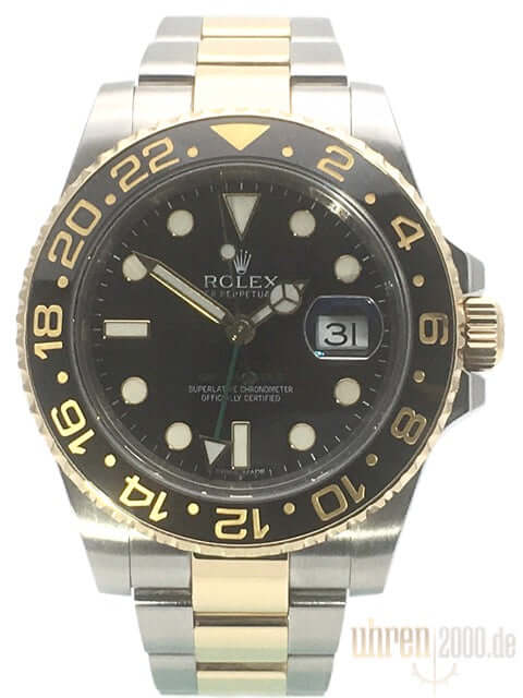 Gehäuse aus Edelstahl poliert und satiniert, Gehäusedurchmesser 40 mm, Gehäusehöhe 12,1 mm, 18 kt Gelbgold Lünette geriffelt mit schwarzer Keramik Einlage und 24 Stunden Skala, beidseitig drehbar, Oyster Edelstahl / 18 kt Gelbgold Armband poliert und satiniert mit Sicherheitsfaltschließe, schwarzes Zifferblatt mit aufgesetzten Leuchtindexen und Leuchtpunkten, Leuchtzeiger, Automatikwerk, Chronometer, Rolex Manufakturkaliber 3186 mit 31 Steine, Schwingung 28.800 A/h, Datumsanzeige, zweite Zeitzone, kratzresistentes Saphirglas, verschraubbare Gelbgold Krone mit Flankenschutz, Edelstahlboden verschraubt, Wasserdicht bis zu 10 bar.