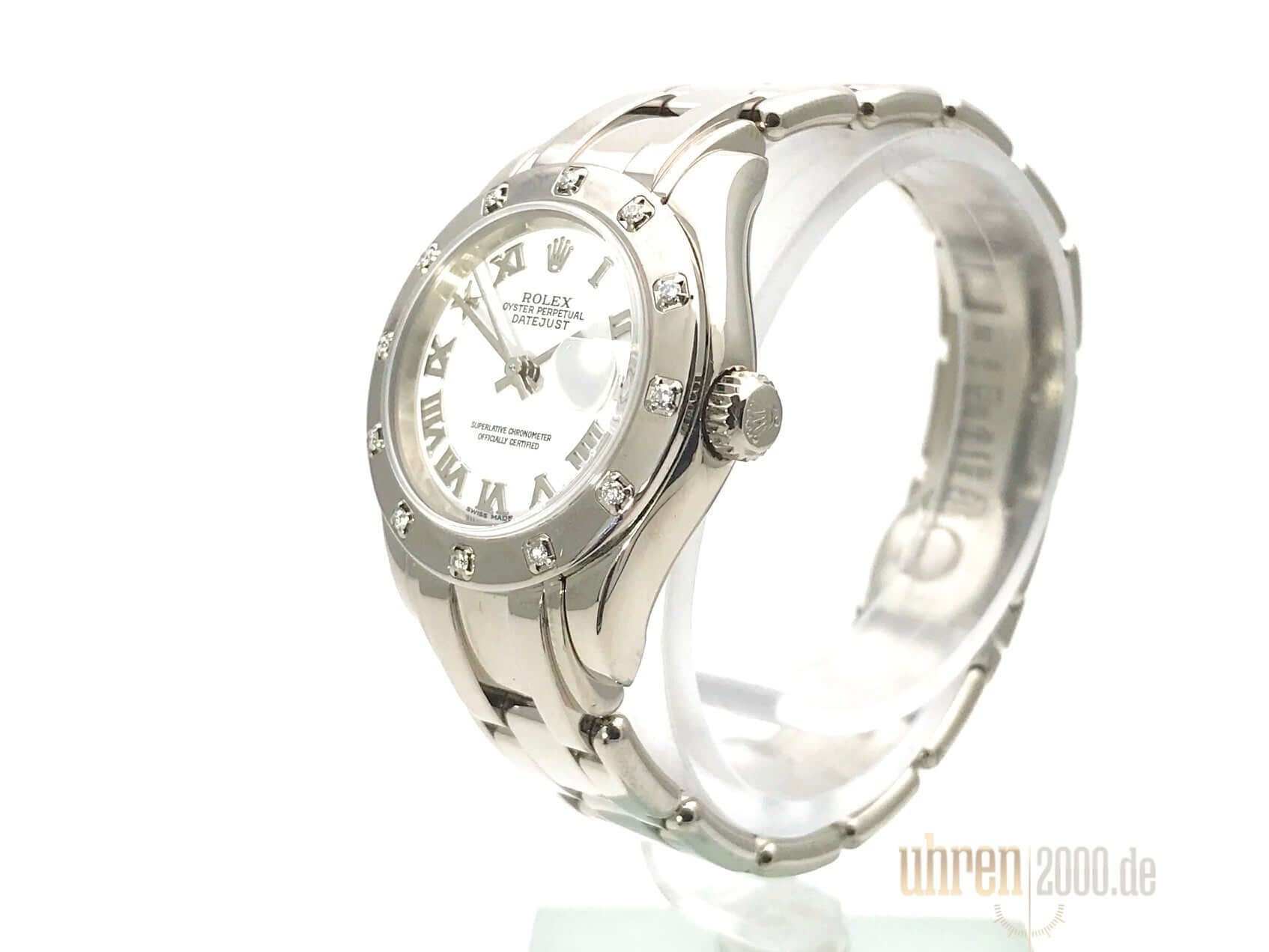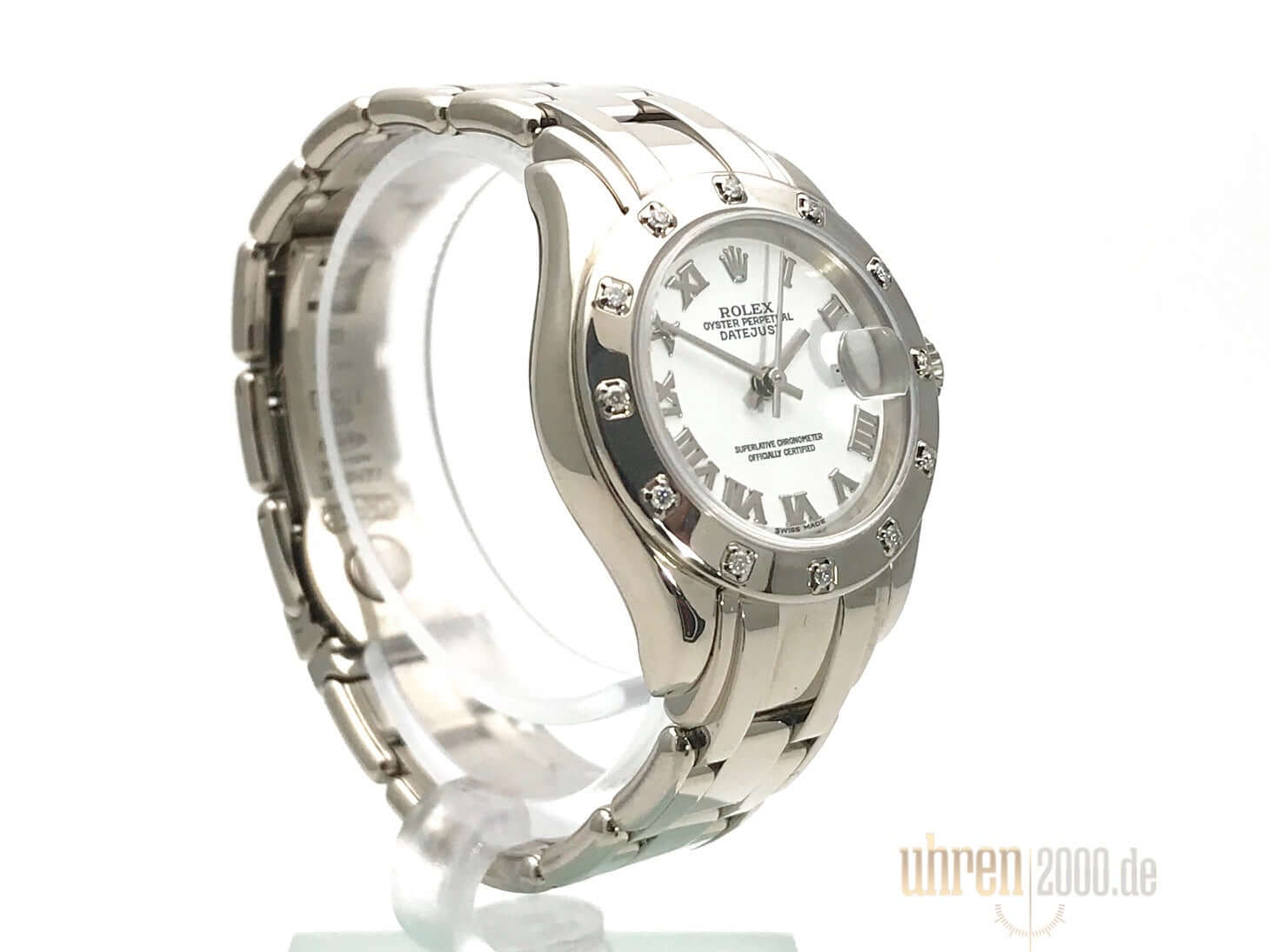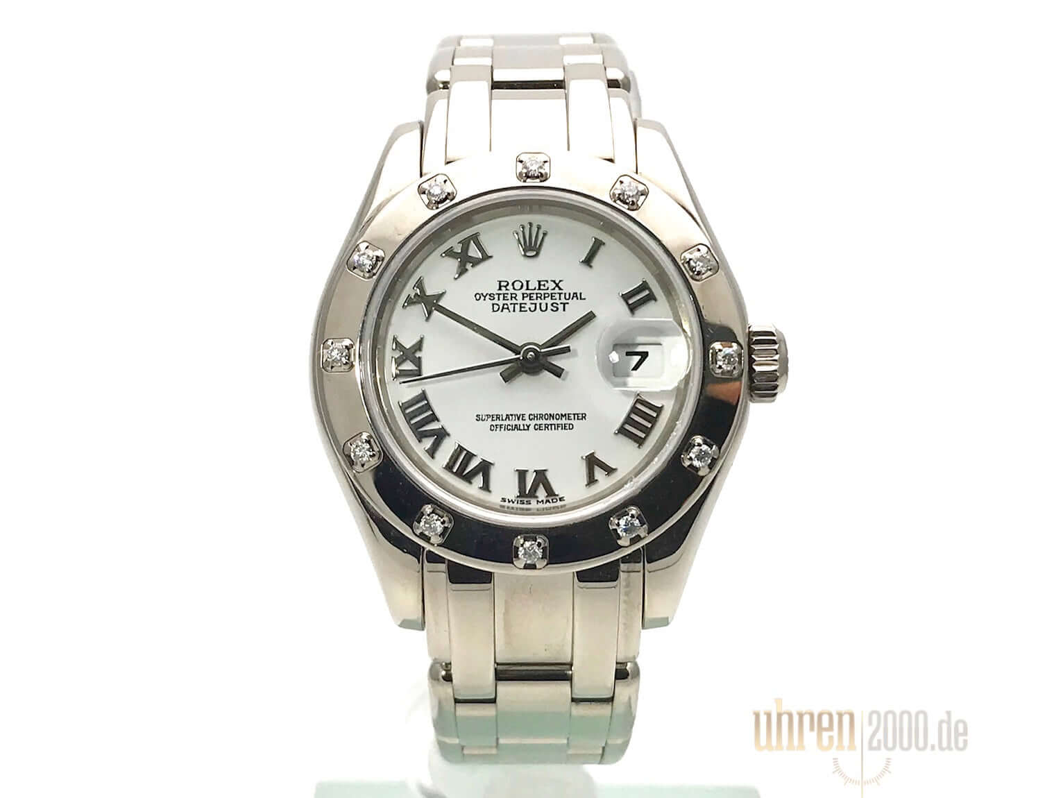 Gehäuse aus 18 kt Weißgold poliert und satiniert, Gehäusedurchmesser 29 mm, geriffelte Lünette aus 18 kt Weißgold mit Diamanten besetzt, 18 kt Weißgold Armband poliert mit Faltschließe, weißes Zifferblatt mit römischen Ziffern, Automatikwerk, Chronometer, Rolex Manufakturkaliber 2235 mit 31 Steine, 28.800 A/h, Datumsanzeige, kratzfestes Saphirglas, verschraubte Krone aus 18 kt Weißgold, Boden aus 18 kt Weißgold verschraubt, Wasserdicht bis zu 10 bar.