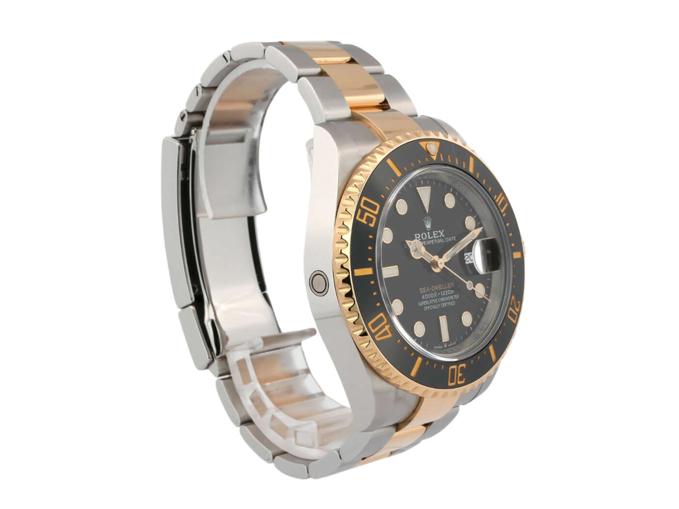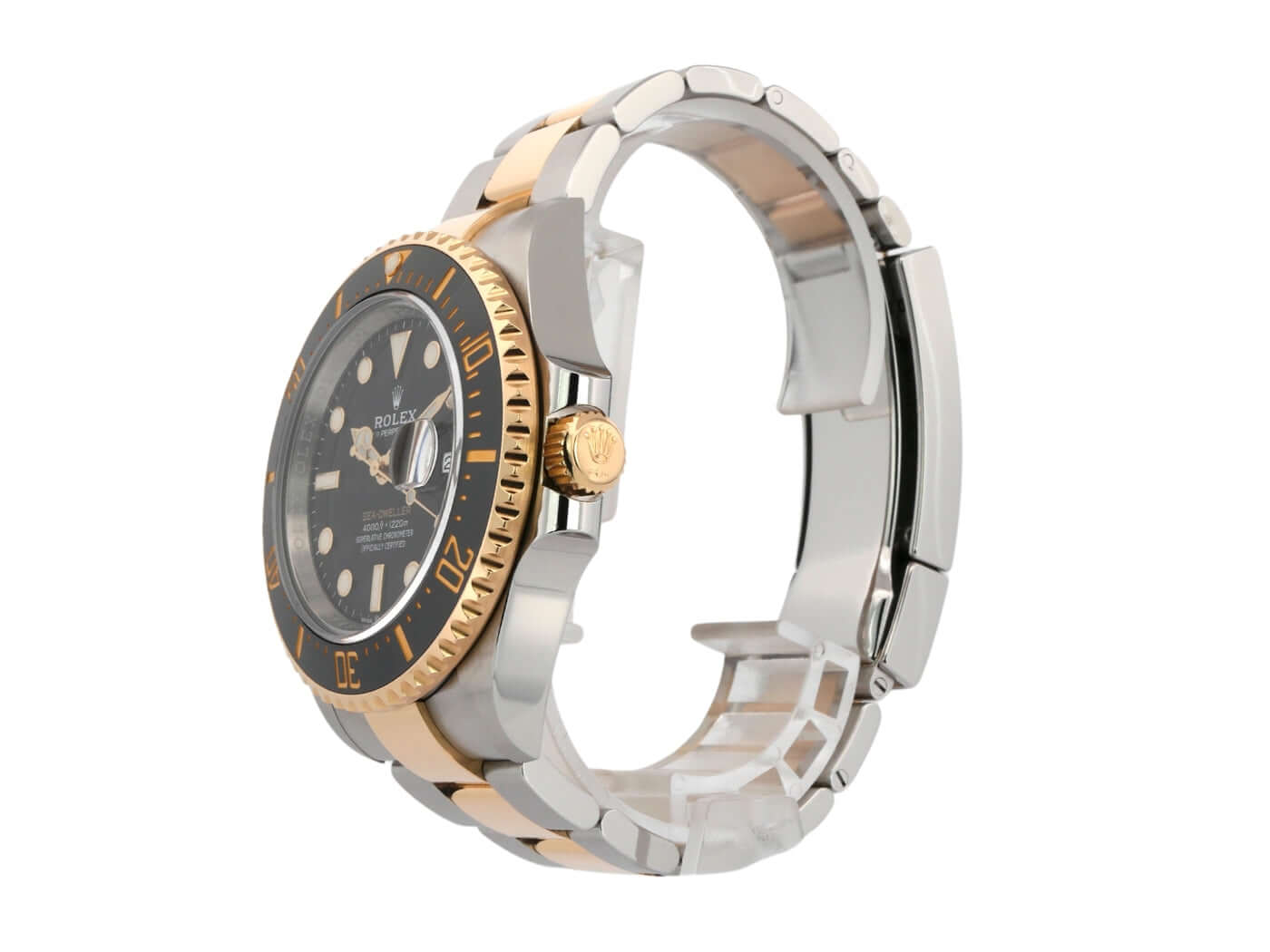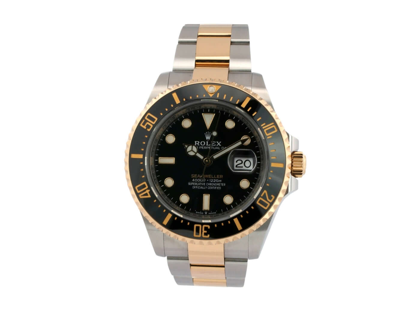 Gehäuse aus Edelstahl / Gelbgold poliert und satiniert, Gehäusedurchmesser 43 mm, Lünette aus Gelbgold mit schwarzer Keramik Einlage, 60 Minuten Skala und Leuchtpunkt, einseitig drehbar, Oyster Edelstahl / Gelbgold Armband satiniert mit Sicherheitsfaltschließe, schwarzes Zifferblatt mit aufgesetzten Leuchtindizes, Leuchtzeiger, Automatikwerk, Rolex Manufakturkaliber 3235, 31 Steine, Schwingung 28.800 A/h, Datumsanzeige bei 3 Uhr, Chronometer, Saphirglas, Gelbgold Krone verschraubt mit Flankenschutz, Heliumventil auf 9 Uhr Position, Edelstahlboden verschraubt und graviert, Wasserdicht bis zu 122 bar.