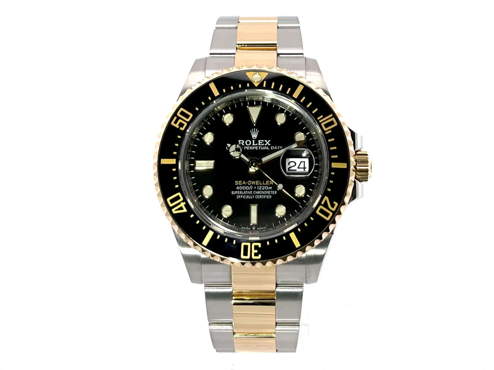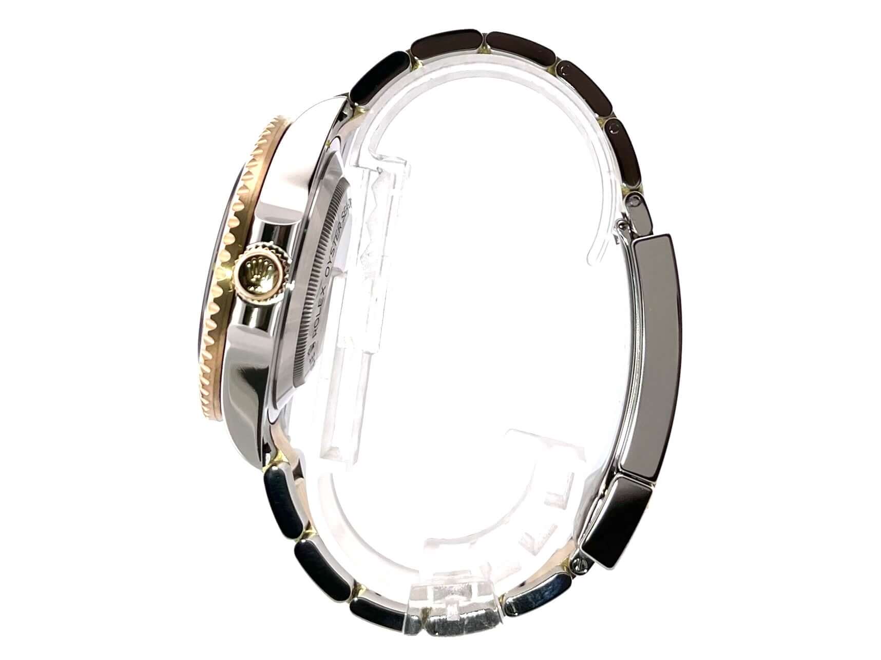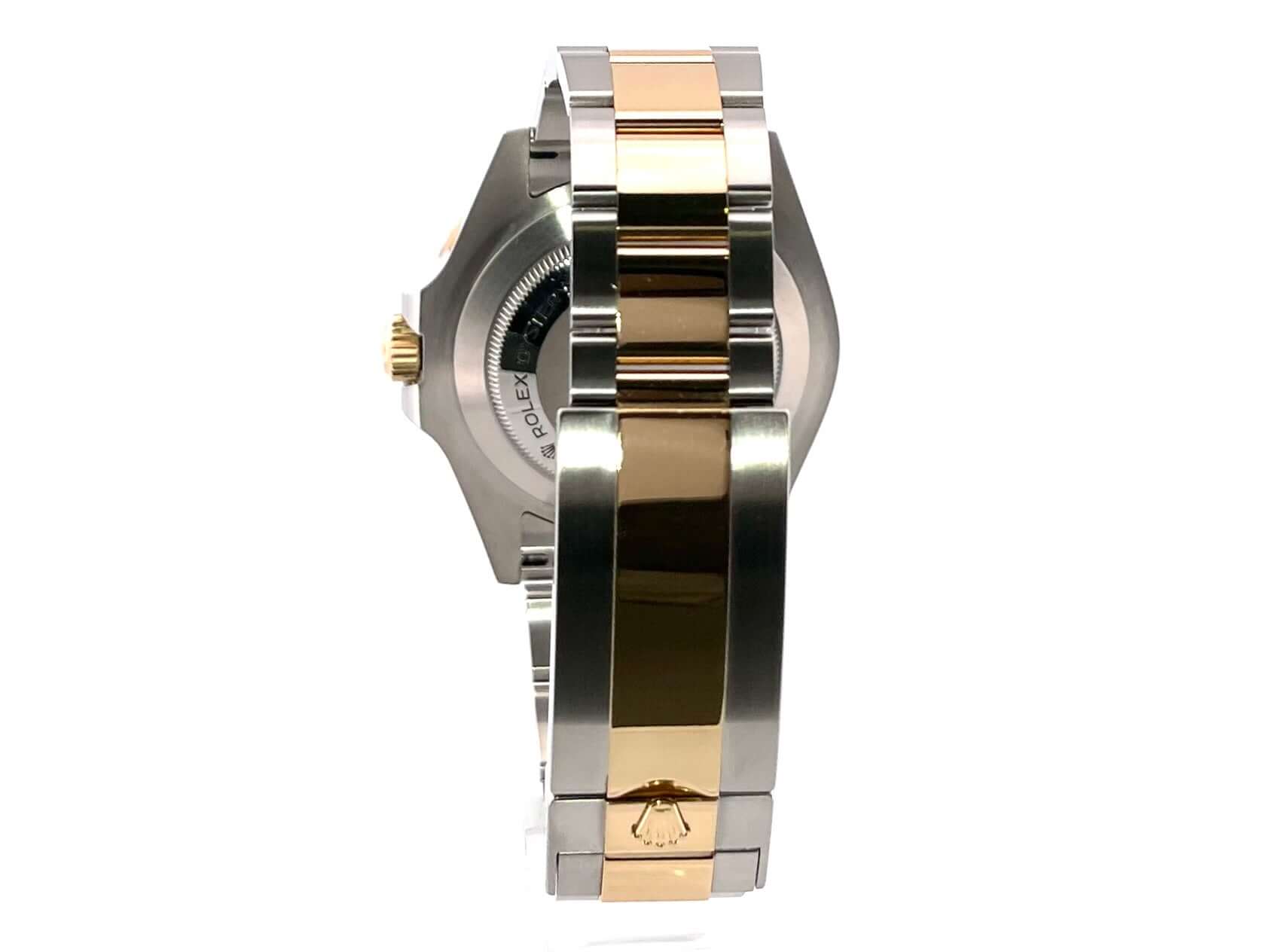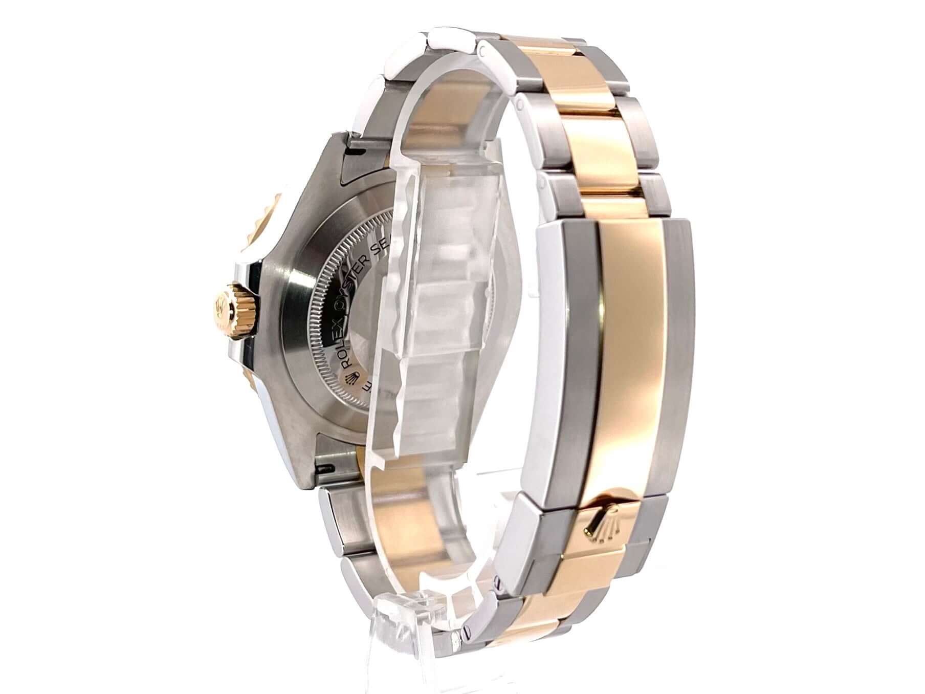 Gehäuse aus Edelstahl / Gelbgold poliert und satiniert, Gehäusedurchmesser 43 mm, Lünette aus Gelbgold mit schwarzer Keramik Einlage, 60 Minuten Skala und Leuchtpunkt, einseitig drehbar, Oyster Edelstahl / Gelbgold Armband satiniert mit Sicherheitsfaltschließe, schwarzes Zifferblatt mit aufgesetzten Leuchtindizes, Leuchtzeiger, Automatikwerk, Rolex Manufakturkaliber 3235, 31 Steine, Schwingung 28.800 A/h, Datumsanzeige bei 3 Uhr, Chronometer, Saphirglas, Gelbgold Krone verschraubt mit Flankenschutz, Heliumventil auf 9 Uhr Position, Edelstahlboden verschraubt und graviert, Wasserdicht bis zu 122 bar.