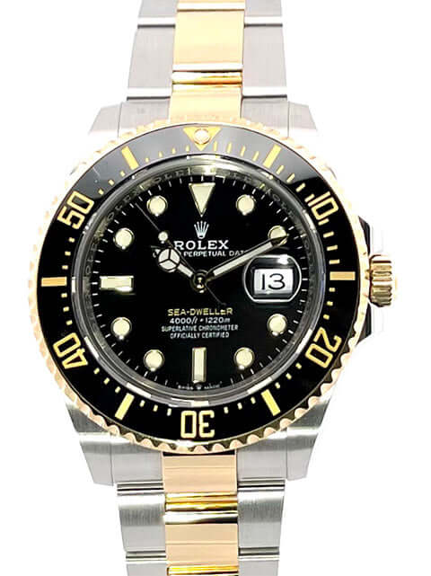 Gehäuse aus Edelstahl / Gelbgold poliert und satiniert, Gehäusedurchmesser 43 mm, Lünette aus Gelbgold mit schwarzer Keramik Einlage, 60 Minuten Skala und Leuchtpunkt, einseitig drehbar, Oyster Edelstahl / Gelbgold Armband satiniert mit Sicherheitsfaltschließe, schwarzes Zifferblatt mit aufgesetzten Leuchtindizes, Leuchtzeiger, Automatikwerk, Rolex Manufakturkaliber 3235, 31 Steine, Schwingung 28.800 A/h, Datumsanzeige bei 3 Uhr, Chronometer, Saphirglas, Gelbgold Krone verschraubt mit Flankenschutz, Heliumventil auf 9 Uhr Position, Edelstahlboden verschraubt und graviert, Wasserdicht bis zu 122 bar.