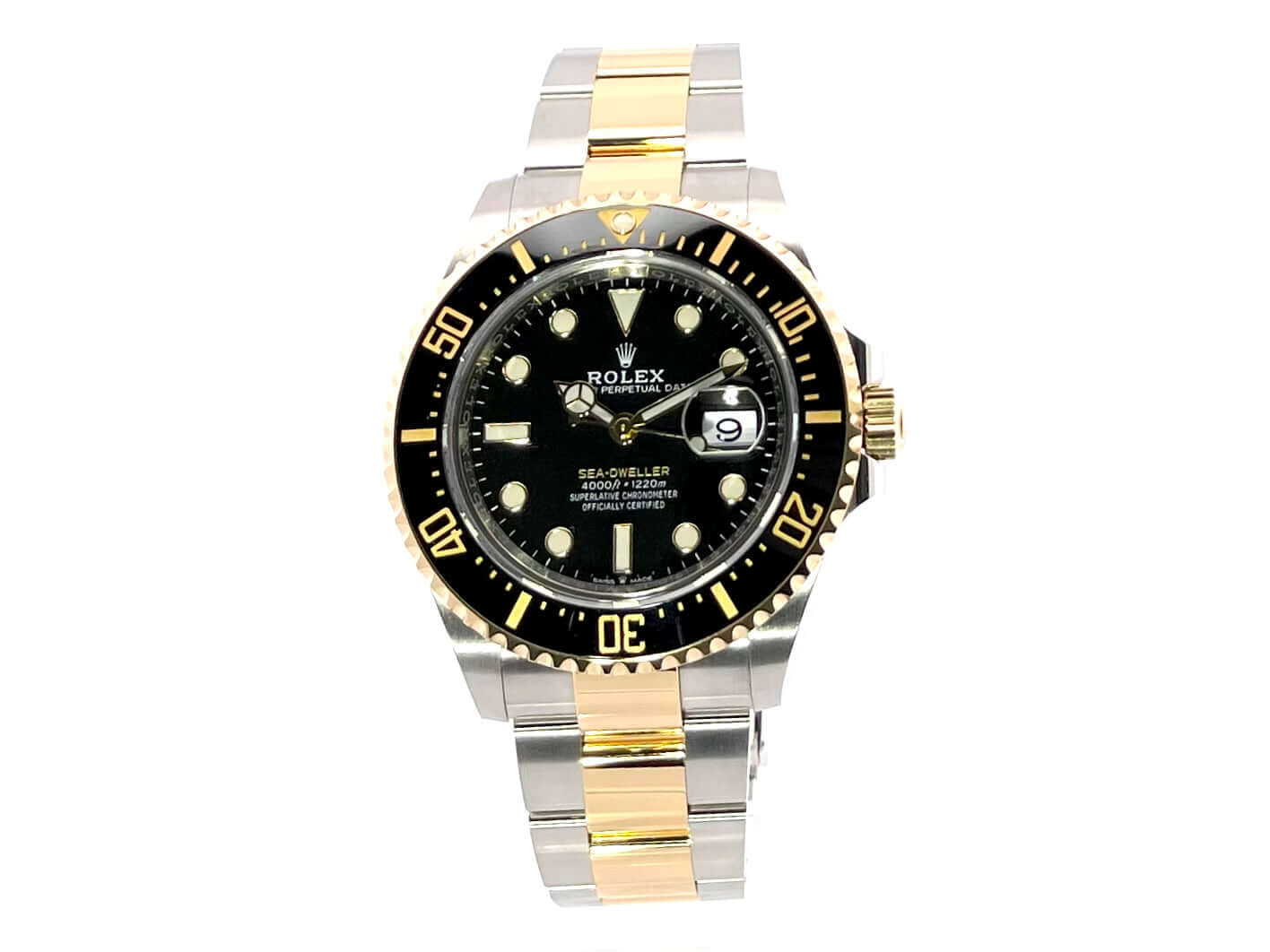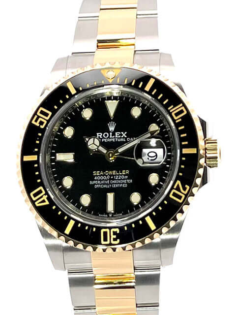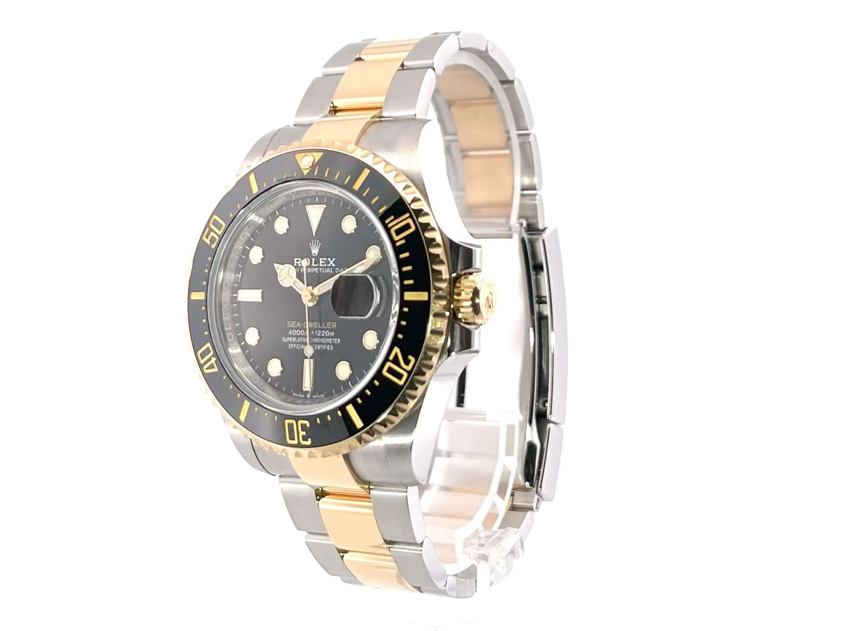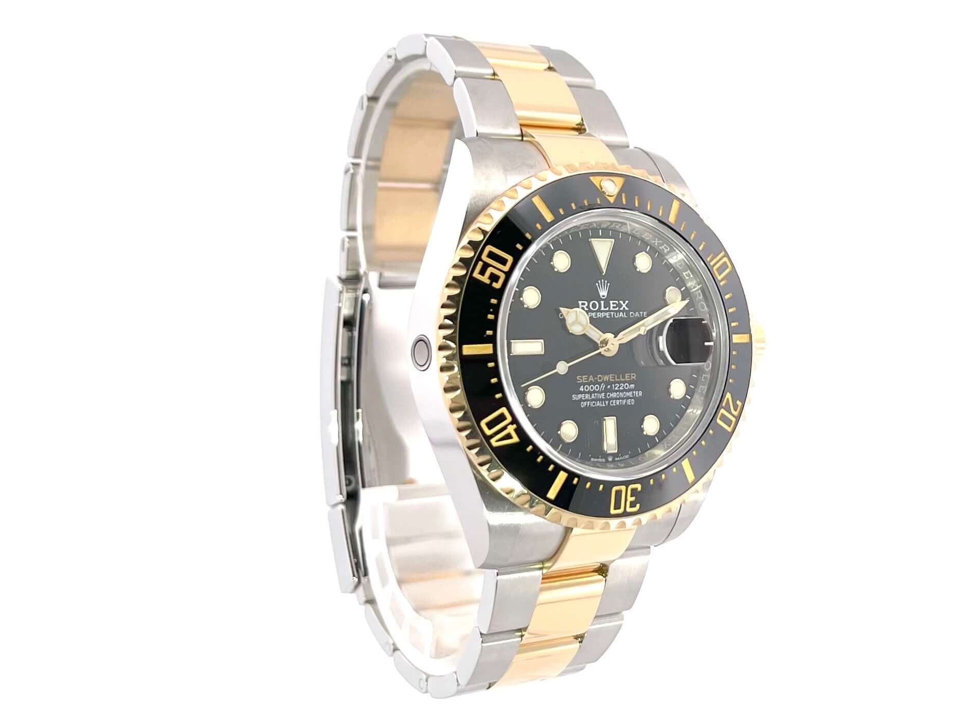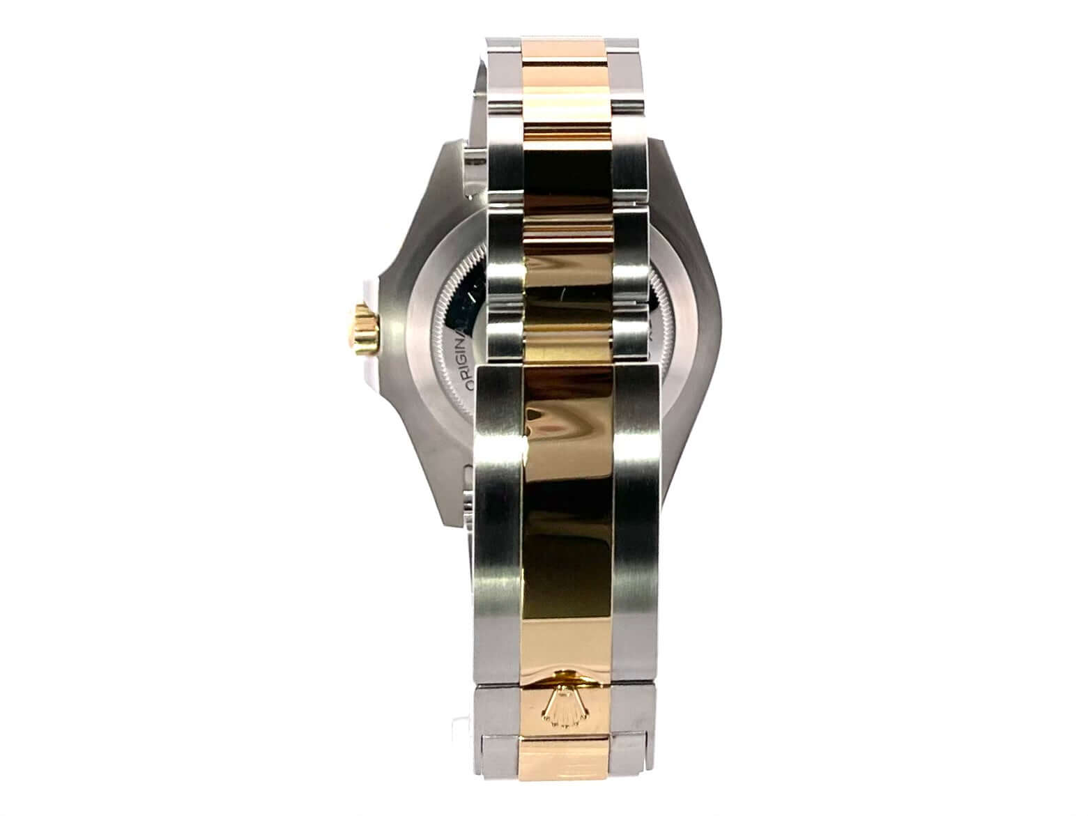 Gehäuse aus Edelstahl / Gelbgold poliert und satiniert, Gehäusedurchmesser 43 mm, Lünette aus Gelbgold mit schwarzer Keramik Einlage, 60 Minuten Skala und Leuchtpunkt, einseitig drehbar, Oyster Edelstahl / Gelbgold Armband satiniert mit Sicherheitsfaltschließe, schwarzes Zifferblatt mit aufgesetzten Leuchtindizes, Leuchtzeiger, Automatikwerk, Rolex Manufakturkaliber 3235, 31 Steine, Schwingung 28.800 A/h, Datumsanzeige bei 3 Uhr, Chronometer, Saphirglas, Gelbgold Krone verschraubt mit Flankenschutz, Heliumventil auf 9 Uhr Position, Edelstahlboden verschraubt und graviert, Wasserdicht bis zu 122 bar.