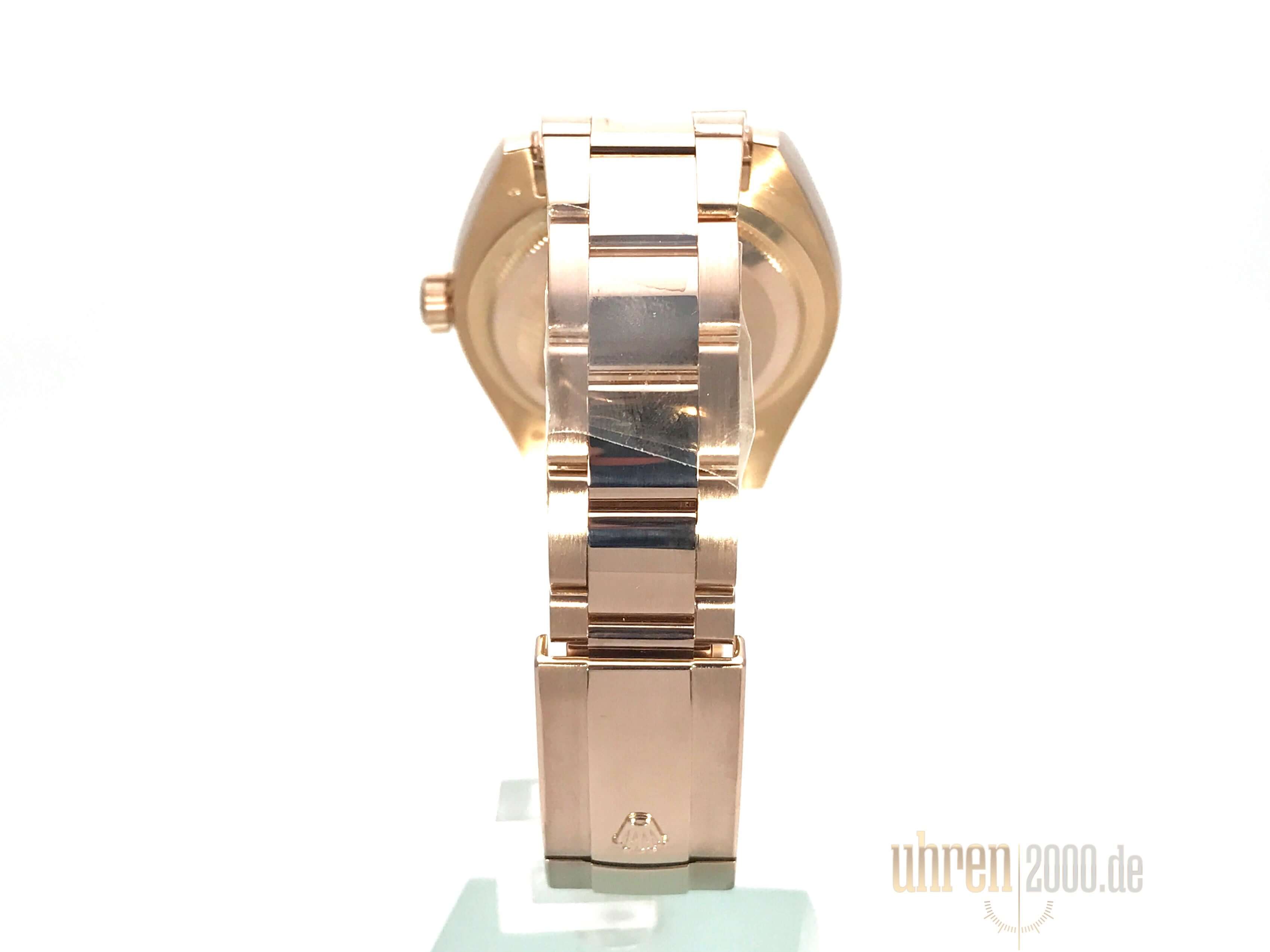 Gehäuse aus 18 kt Everose-Gold poliert und satiniert, Gehäusedurchmesser 42 mm, Gehäusehöhe 14 mm, Lünette 18 kt Everose-Gold geriffelt, 18 kt Everose-Gold Armband poliert und satiniert mit Oysterclasp-Faltschließe, Zifferblatt rosé mit aufgesetzten römischen Ziffern, Automatikwerk, Chronometer, Rolex Manufakturkaliber 9001 mit 40 Steine, Schwingung 28.800 A/h, Gangreserve für ca. 72 Stunden, SAROS Jahreskalender, Anzeige des Monats in Sichtfenster, in zwei Richtungen drehbare Ring-Command-Lünette, Kratzfestes Saphirglas, verschraubte 18 kt Everose-Gold Krone, verschraubter Boden aus 18 kt Everose-Gold, Wasserdicht bis zu 10 bar.