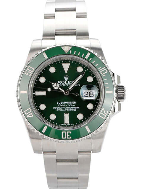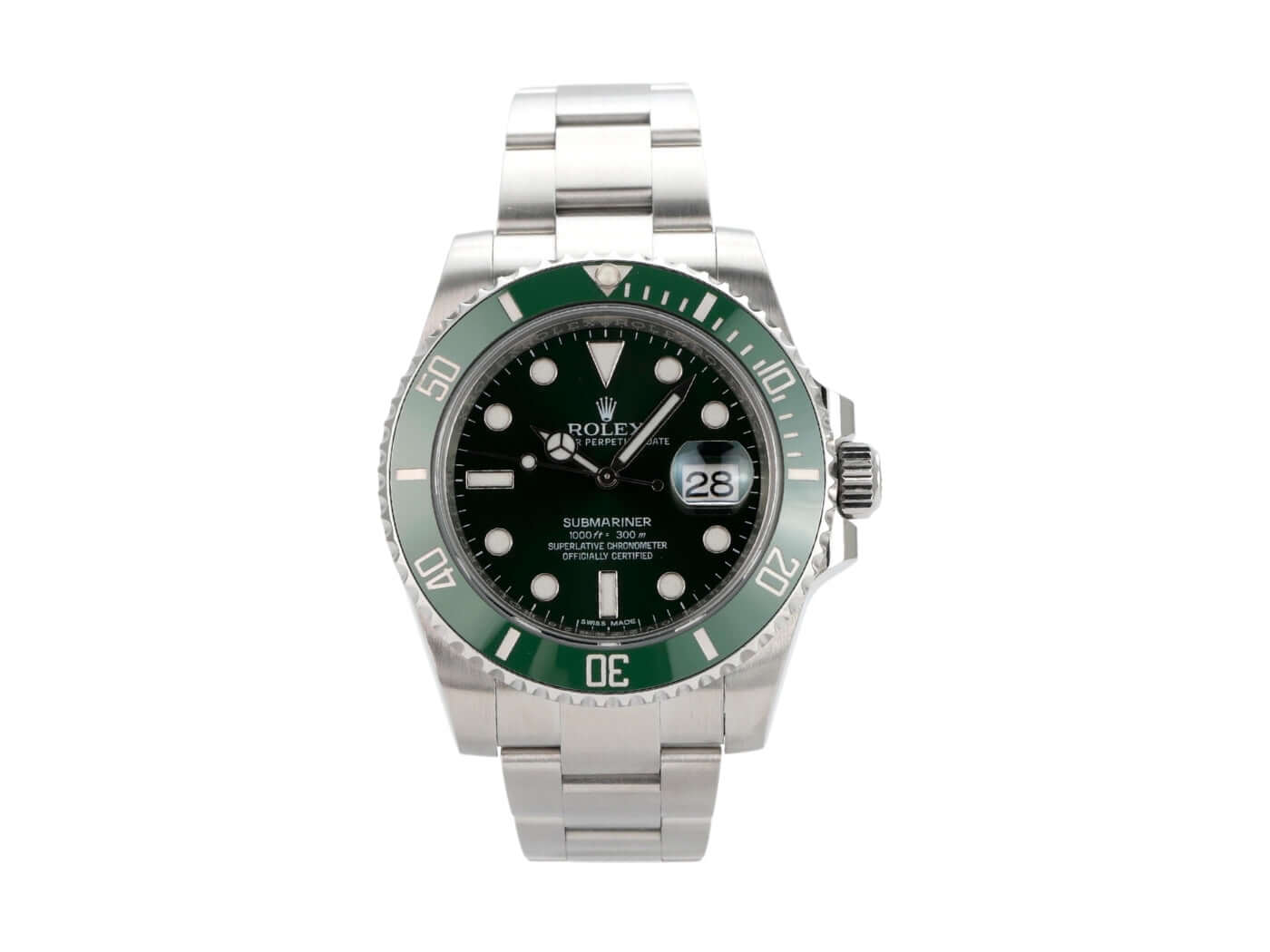 Gehäuse aus Edelstahl poliert und satiniert, Gehäusedurchmesser 40 mm, Gehäusehöhe 12,5 mm, Edelstahl Lünette mit grüner Keramik Einlage, 60 Minuten Skala und Leuchtpunkt drehbar, Oyster Edelstahlband poliert und satiniert mit Sicherheitsfaltschließe, grünes Zifferblatt mit aufgesetzten Leuchtindizes und Leuchtpunkten, Leuchtzeiger, Automatikwerk, Kaliber Rolex 3135 mit 31 Steine, 28.800 A/h, Datumsanzeige mit Schnellverstellung und Lupe, Chronometer, Saphirglas, Krone verschraubt mit Flankenschutz, Edelstahlboden verschraubt, wasserdicht bis zu 30 bar.