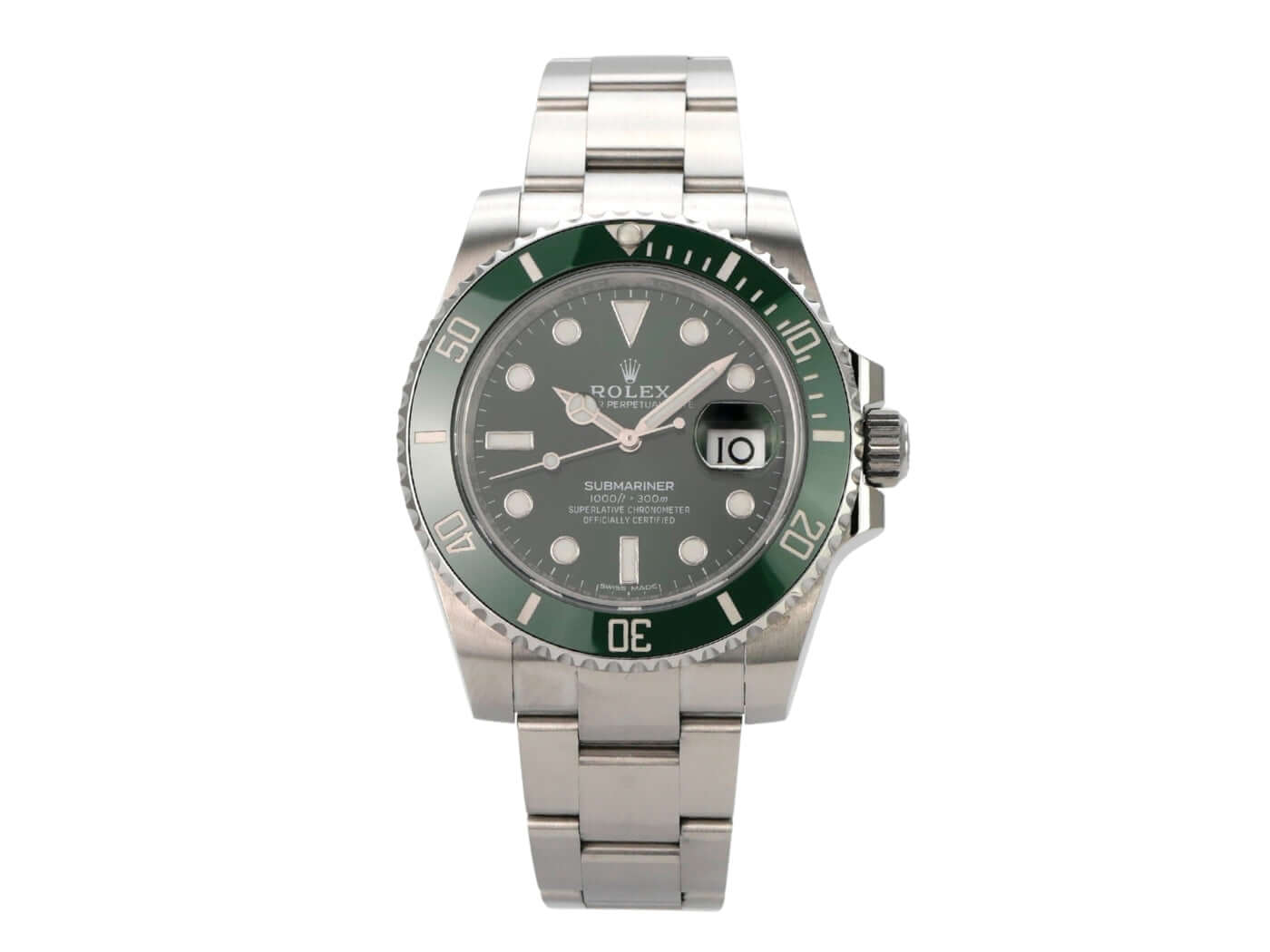 Gehäuse aus Edelstahl poliert und satiniert, Gehäusedurchmesser 40 mm, Gehäusehöhe 12,5 mm, Edelstahl Lünette mit grüner Keramik Einlage, 60 Minuten Skala und Leuchtpunkt drehbar, Oyster Edelstahlband poliert und satiniert mit Sicherheitsfaltschließe, grünes Zifferblatt mit aufgesetzten Leuchtindizes und Leuchtpunkten, Leuchtzeiger, Automatikwerk, Kaliber Rolex 3135 mit 31 Steine, 28.800 A/h, Datumsanzeige mit Schnellverstellung und Lupe, Chronometer, Saphirglas, Krone verschraubt mit Flankenschutz, Edelstahlboden verschraubt, wasserdicht bis zu 30 bar.