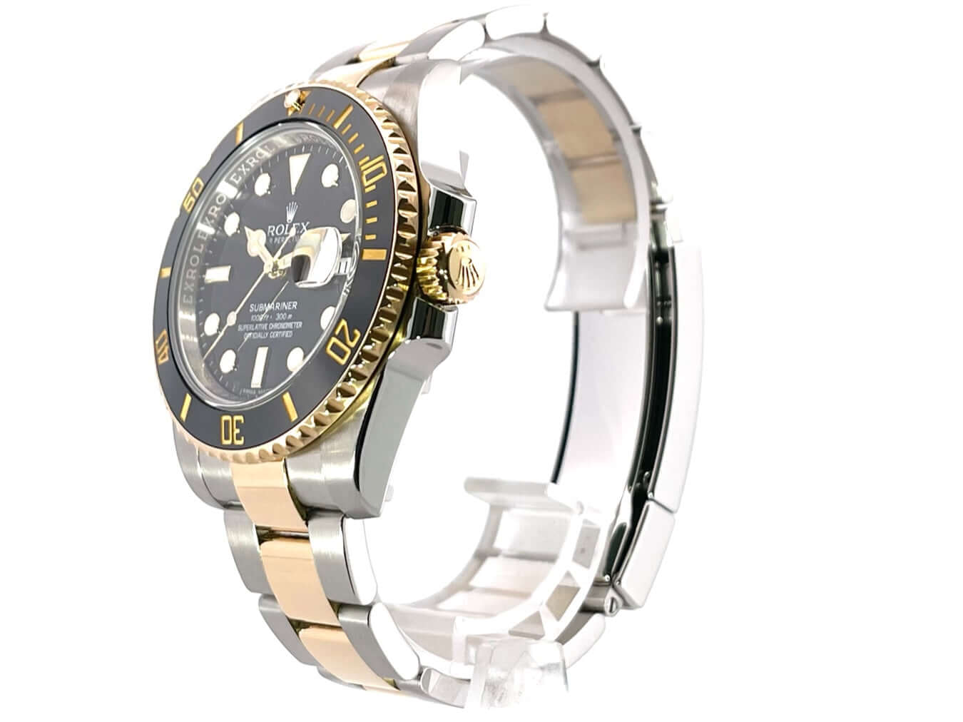 Gehäuse aus Edelstahl / 18 Karat Gelbgold poliert und satiniert, Gehäusedurchmesser 40 mm, Höhe 12,5 mm, geriffelte Lünette aus 18 Karat Gelbgold mit schwarzer Einlage, 60 Minuten Skala und Leuchtpunkt auf der 12 Uhr Position, drehbar, Oyster Armband aus Edelstahl / 18 Karat Gelbgold poliert und satiniert mit Sicherheitsfaltschließe, schwarzes Zifferblatt mit aufgesetzten Leuchtindizes und Leuchtpunkten sowie goldenen Leuchtzeigern, Automatikwerk, Rolex Manufakturkaliber 3135, Schwingung 28.800 A/h, Datum, Chronometer, kratzresistentes Saphirglas, verschraubbare Krone mit Flankenschutz, verschraubter Edelstahlboden, wasserdicht bis zu 30 bar.
