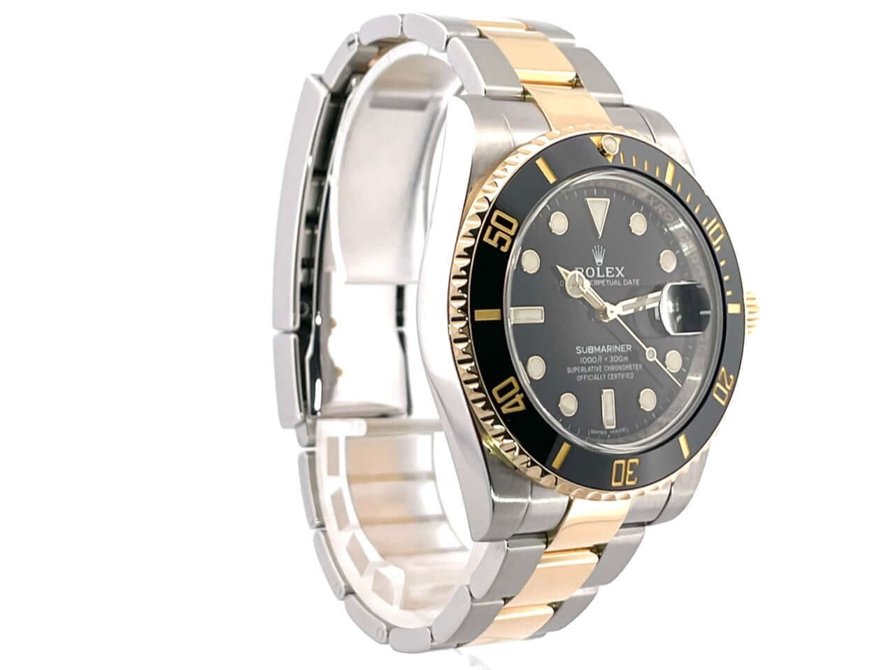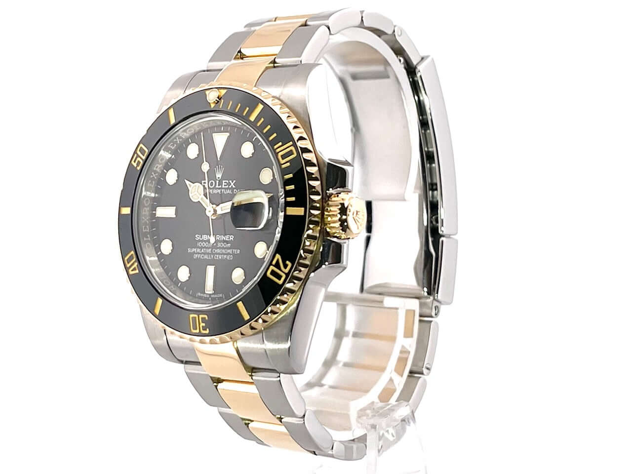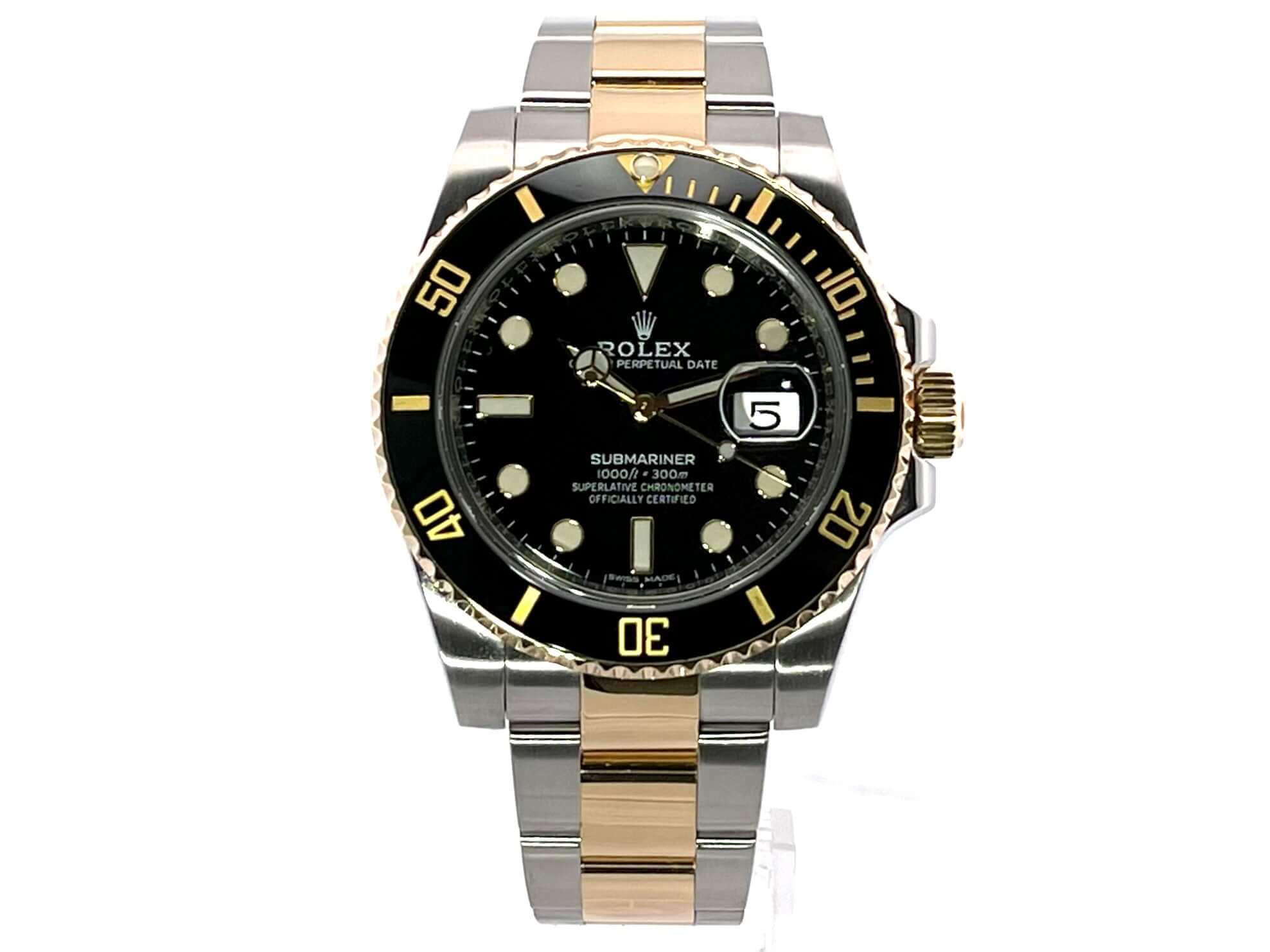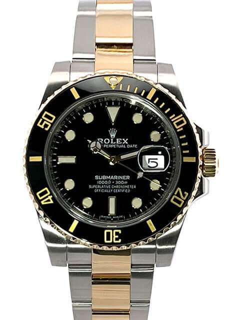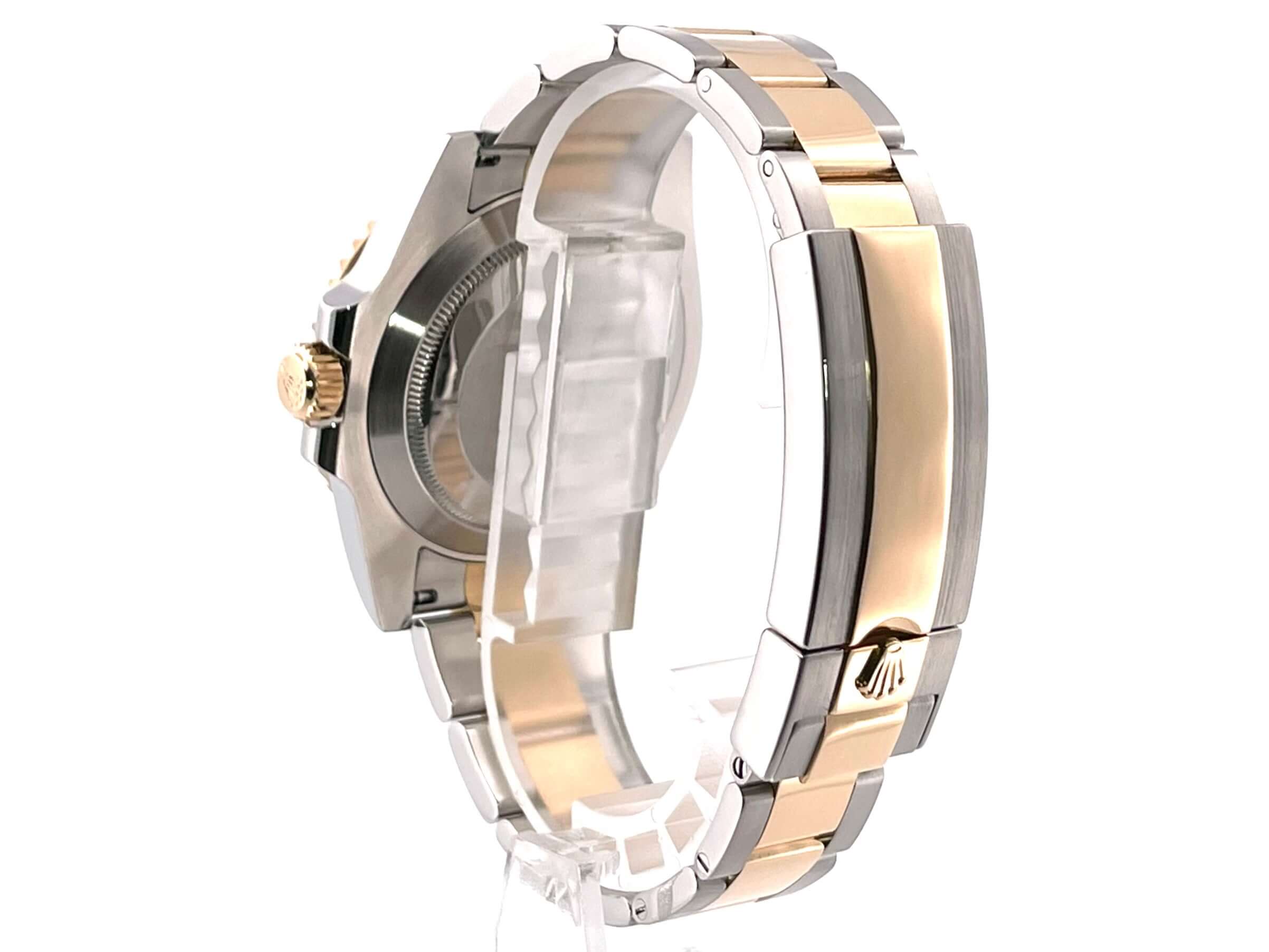 Gehäuse aus Edelstahl / 18 Karat Gelbgold poliert und satiniert, Gehäusedurchmesser 40 mm, Höhe 12,5 mm, geriffelte Lünette aus 18 Karat Gelbgold mit schwarzer Einlage, 60 Minuten Skala und Leuchtpunkt auf der 12 Uhr Position, drehbar, Oyster Armband aus Edelstahl / 18 Karat Gelbgold poliert und satiniert mit Sicherheitsfaltschließe, schwarzes Zifferblatt mit aufgesetzten Leuchtindizes und Leuchtpunkten sowie goldenen Leuchtzeigern, Automatikwerk, Rolex Manufakturkaliber 3135, Schwingung 28.800 A/h, Datum, Chronometer, kratzresistentes Saphirglas, verschraubbare Krone mit Flankenschutz, verschraubter Edelstahlboden, wasserdicht bis zu 30 bar.
