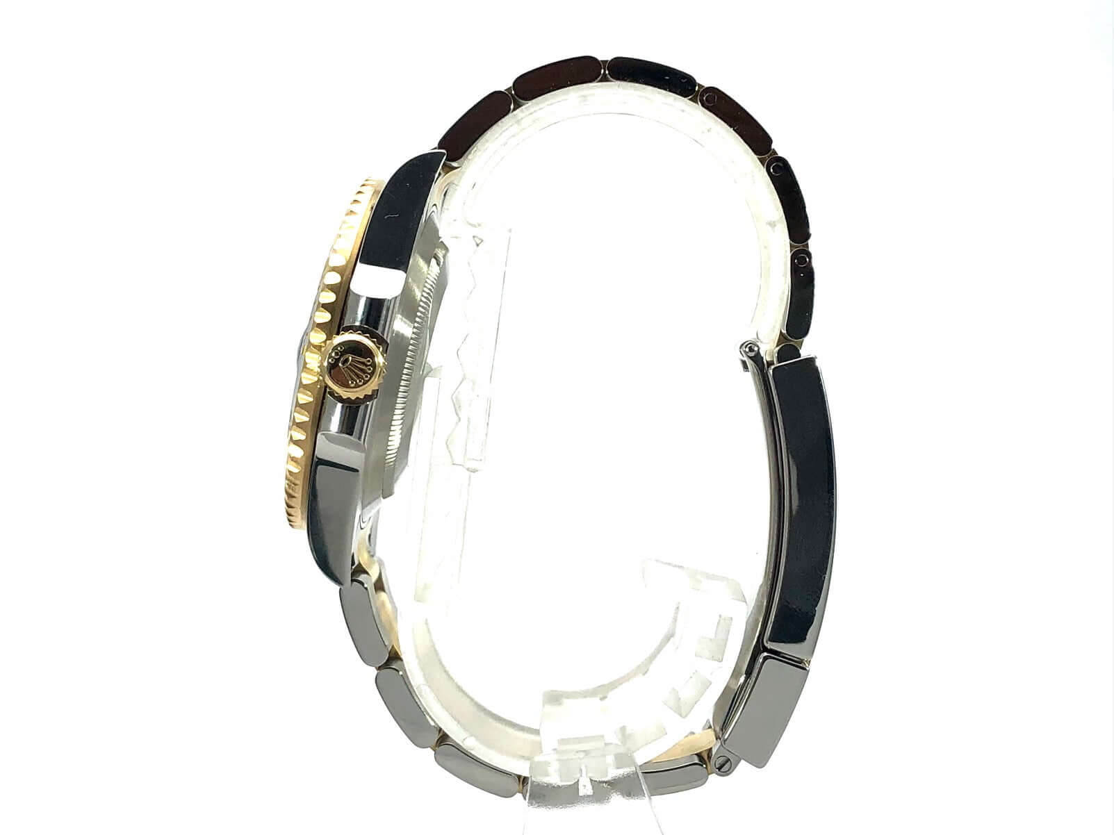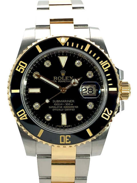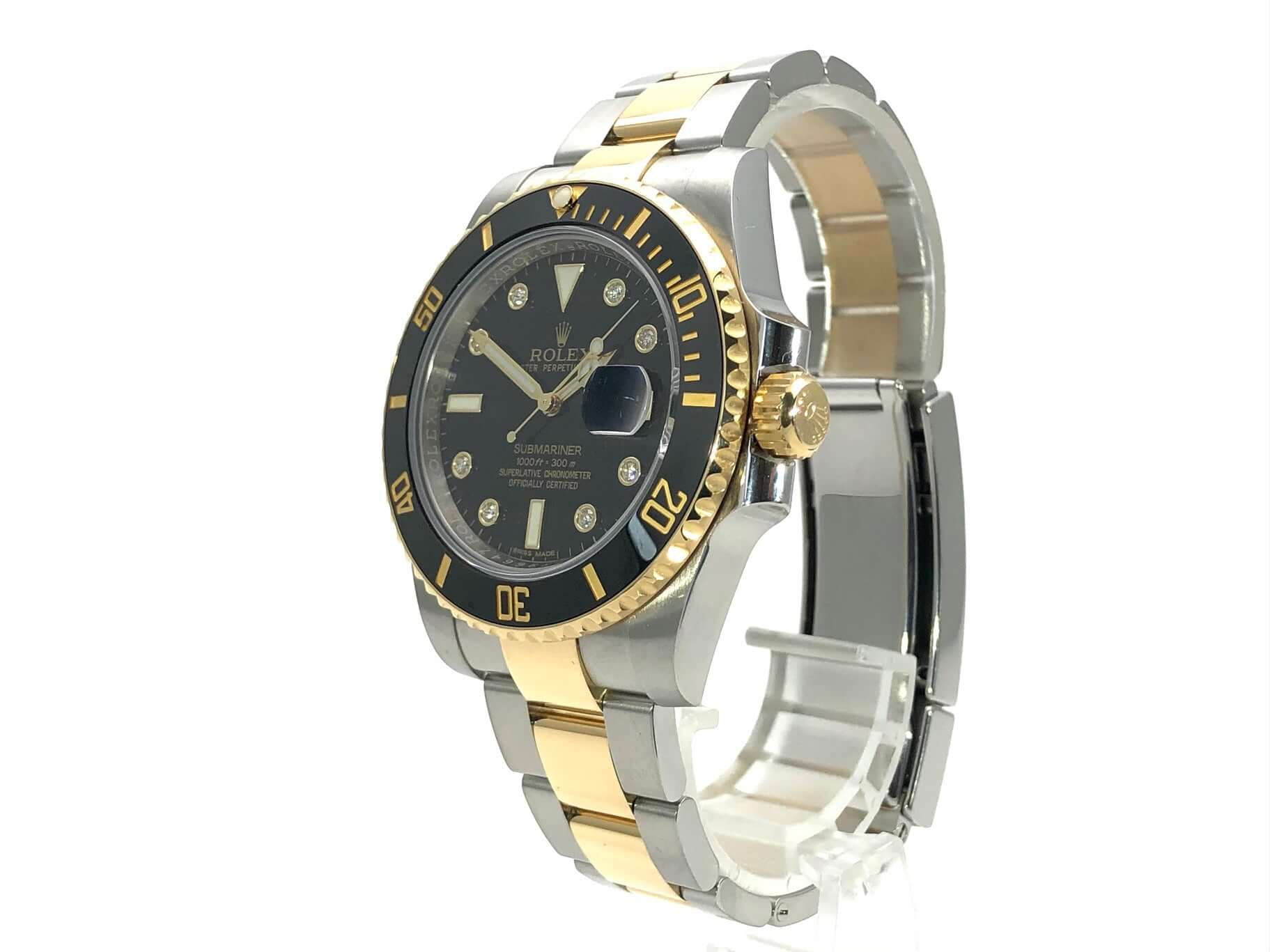 Gehäuse aus Edelstahl / 18 kt. Gelbgold poliert und satiniert, Gehäusedurchmesser 40 mm, Gehäusehöhe 12,5 mm, verschraubter Edelstahlboden, Oyster Edelstahl / 18 kt. Gelbgold Armband poliert und satiniert mit Sicherheitsfaltschließe, drehbare 18 kt. Gelbgold Lünette geriffelt mit schwarzer Keramik, 60 Minuten Skala und Leuchtpunkt auf der 12 Uhr Position, schwarzes Zifferblatt mit aufgesetzten Diamanten, sowie goldene Leuchtzeiger, kratzresistentes Saphirglas, verschraubbare Krone mit Flankenschutz, Automatikwerk, Rolex Manufakturkaliber 3135, Schwingung 28.800 A/h, Datum, Chronometer, Wasserdicht bis zu 30 bar.
