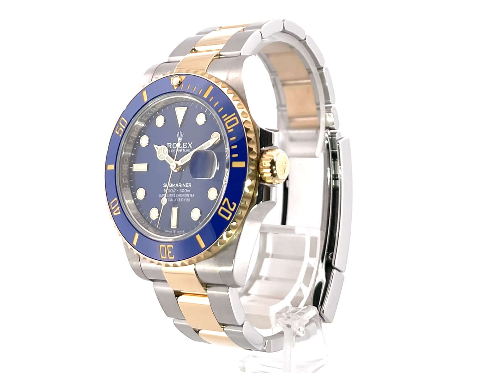 Gehäuse aus Edelstahl poliert und satiniert, Gehäusedurchmesser 41 mm, Gehäusehöhe 12,5 mm, geriffelte Lünette aus 18 Karat Gelbgold mit blauer Keramik Einlage, 60 Minuten Skala und Leuchtpunkt drehbar, Oyster Edelstahl / 18 Karat Gelbgold Armband poliert und satiniert mit Sicherheitsfaltschließe, blaues Zifferblatt mit aufgesetzten Leuchtindizes und Leuchtpunkten, Leuchtzeiger, Automatikwerk, Kaliber Rolex 3235 mit 31 Steine, 28.800 A/h, 70 Stunden Gangreserve, Datumsanzeige mit Schnellverstellung und Lupe, Chronometer, Saphirglas, Krone verschraubt mit Flankenschutz, Edelstahlboden verschraubt, Wasserdicht bis zu 30 bar.