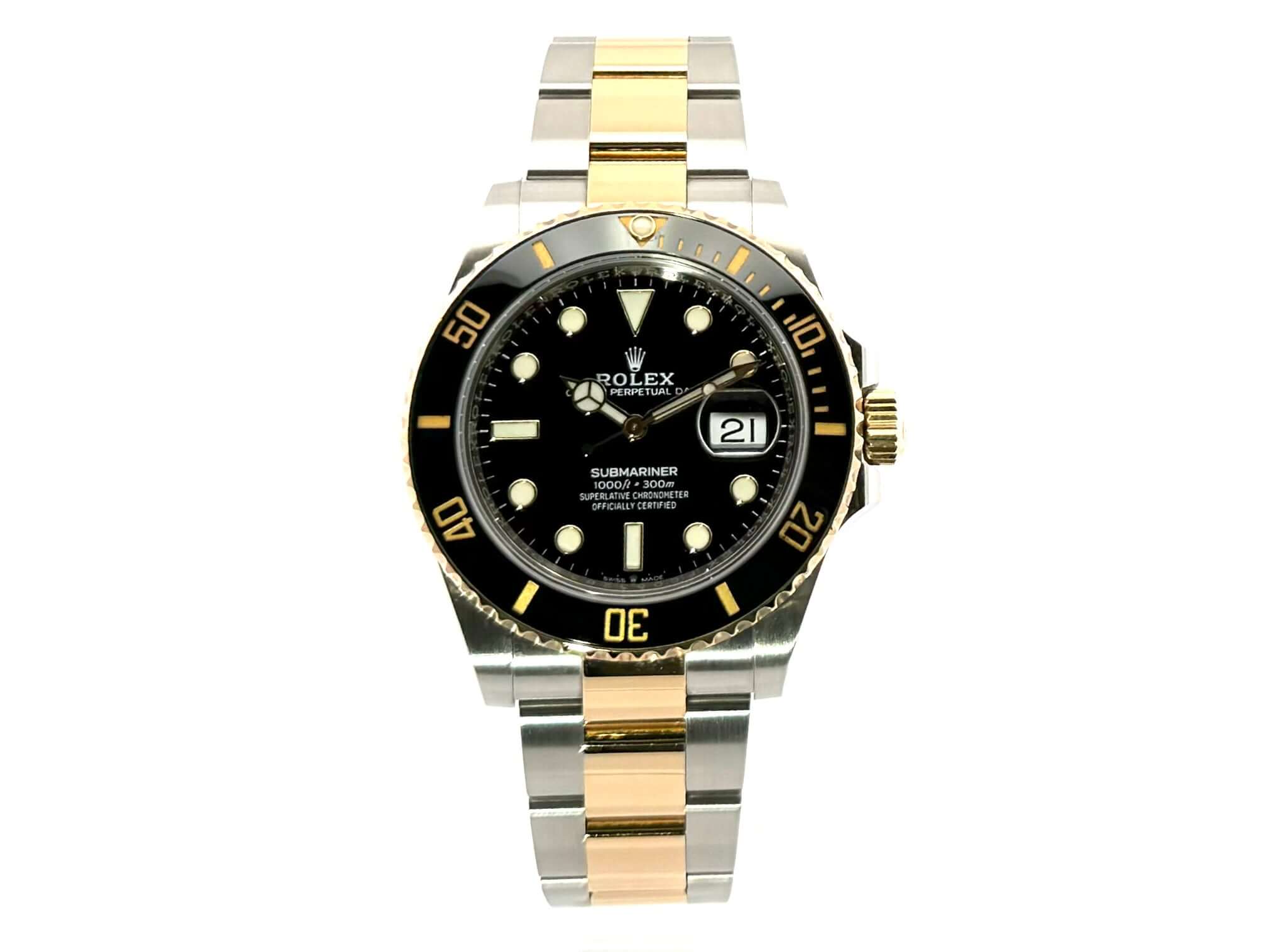 Gehäuse aus Edelstahl poliert und satiniert, Gehäusedurchmesser 41 mm, Gehäusehöhe 12,5 mm, 18 Karat Gelbgold Lünette geriffelt mit schwarzer Keramik Einlage, 60 Minuten Skala und Leuchtpunkt drehbar, Oyster Edelstahl / 18 Karat Gelbgold Armband poliert und satiniert mit Sicherheitsfaltschließe, schwarzes Zifferblatt mit aufgesetzten Leuchtindizes und Leuchtpunkten, Leuchtzeiger, Automatikwerk, Kaliber Rolex 3235 mit 31 Steine, 28.800 A/h, 70 Stunden Gangreserve, Datumsanzeige mit Schnellverstellung und Lupe, Chronometer, Saphirglas, Krone verschraubt mit Flankenschutz, Edelstahlboden verschraubt, Wasserdicht bis zu 30 bar.