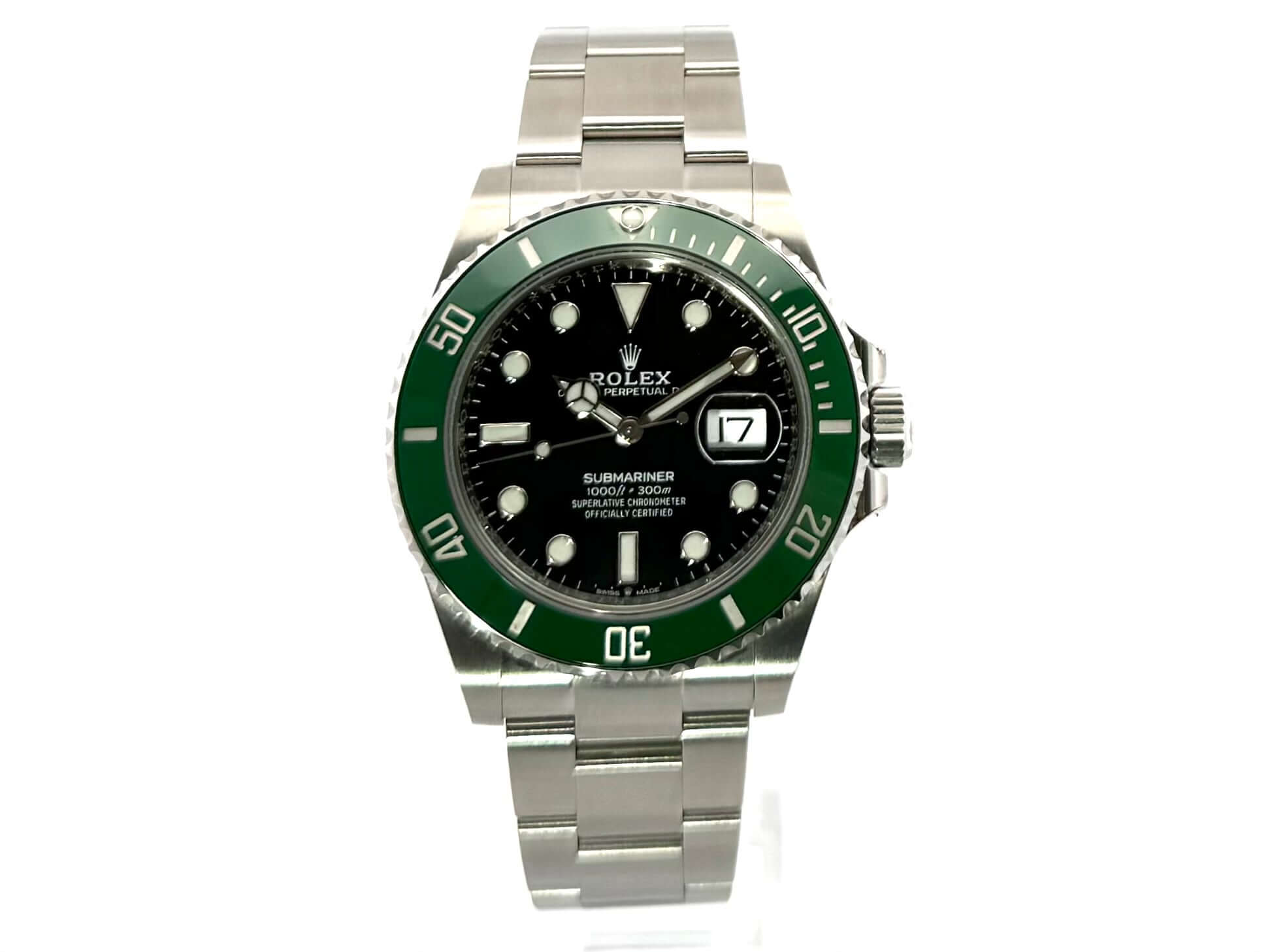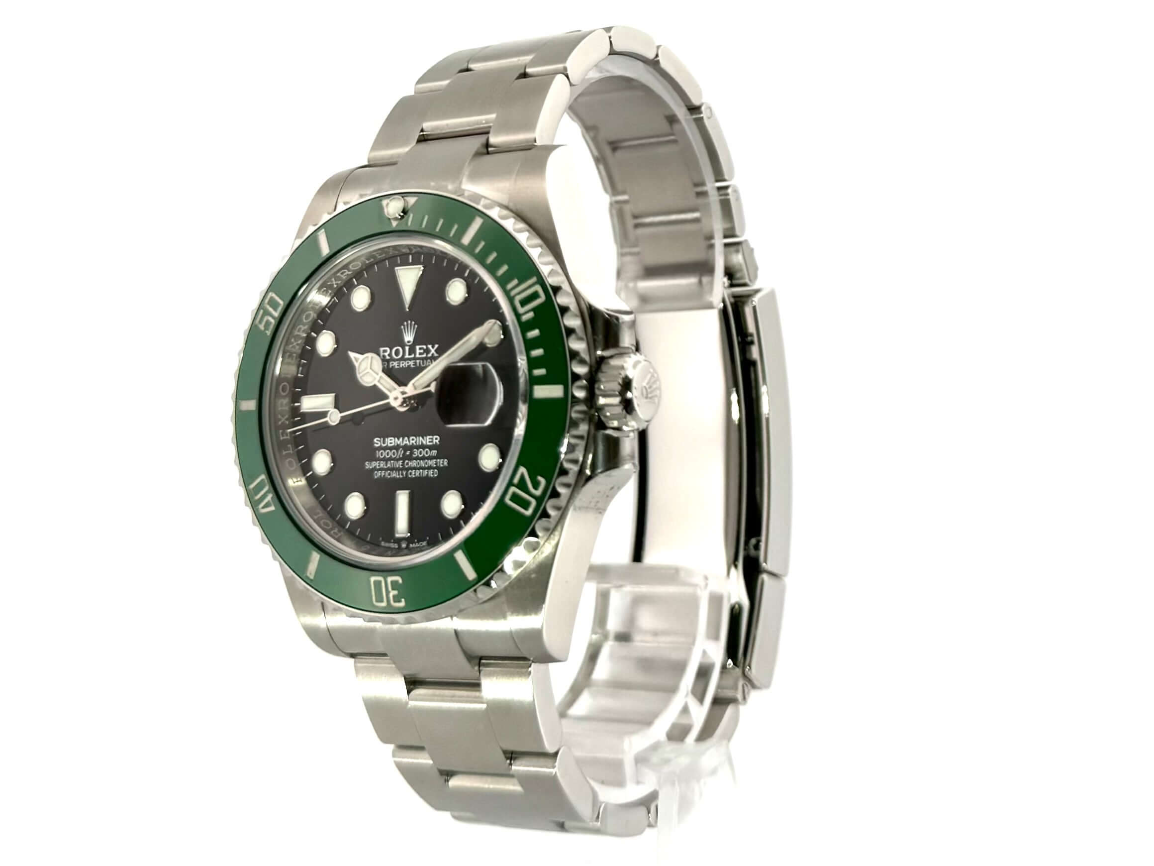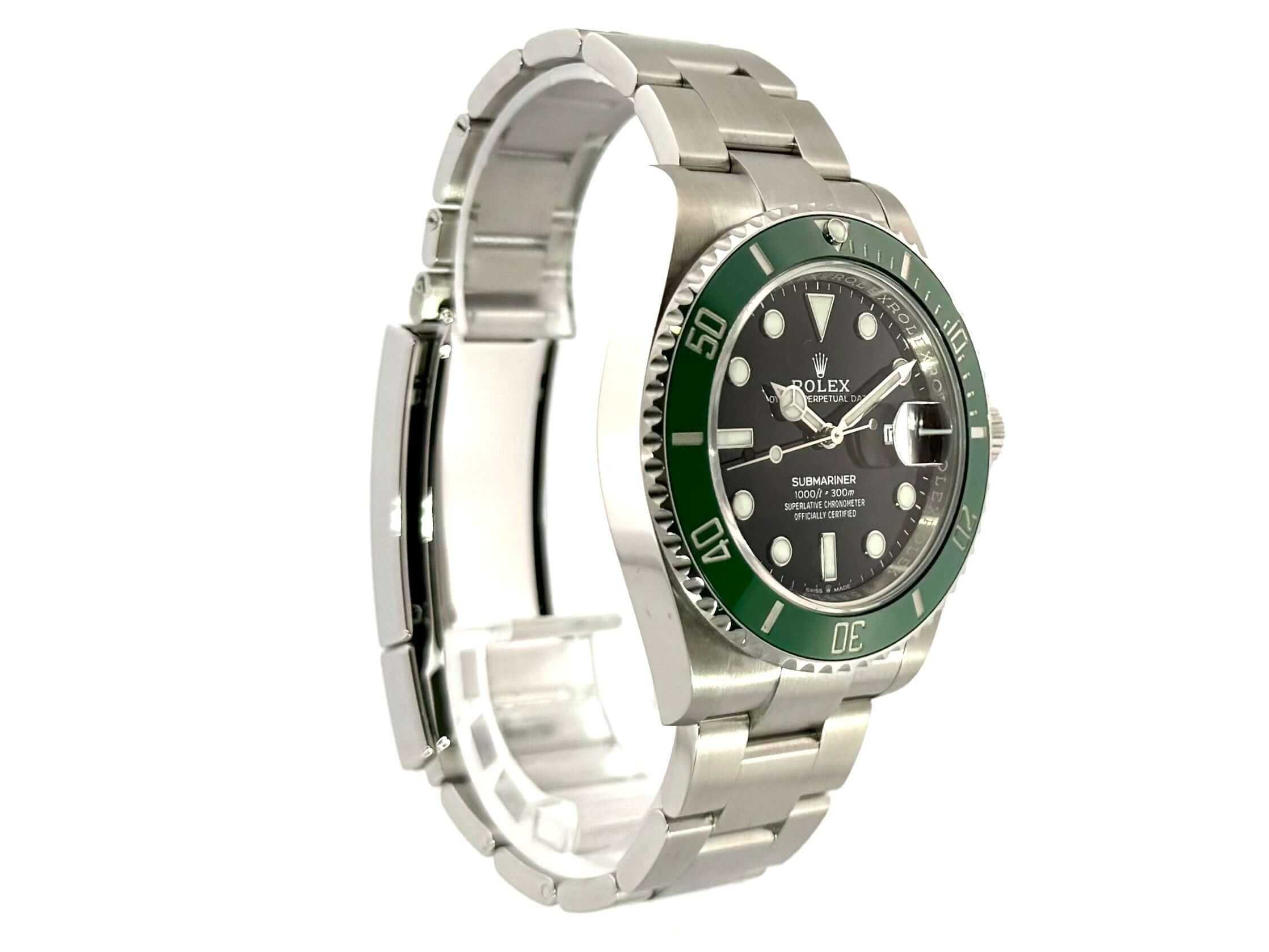 Gehäuse aus Edelstahl poliert und satiniert, Gehäusedurchmesser 41 mm, Gehäusehöhe 12,5 mm, Edelstahl Lünette mit grüner Keramik Einlage, 60 Minuten Skala und Leuchtpunkt drehbar, Oyster Edelstahlarmband poliert und satiniert mit Sicherheitsfaltschließe, schwarzes Zifferblatt mit aufgesetzten Leuchtindizes, Leuchtzeiger, Automatikwerk, Kaliber Rolex 3235 mit 31 Steine, 28.800 A/h, 70 Stunden Gangreserve, Datumsanzeige mit Schnellverstellung und Lupe, Chronometer, Saphirglas, Krone verschraubt mit Flankenschutz, Edelstahlboden verschraubt, Wasserdicht bis zu 30 bar.