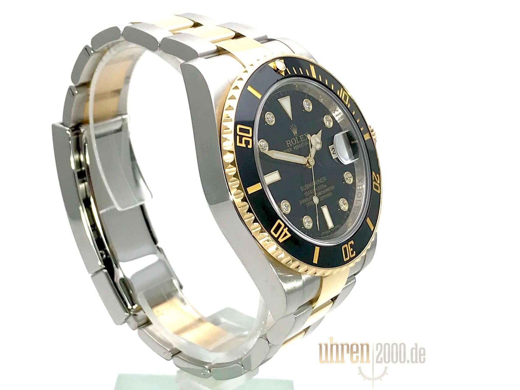 Gehäuse aus Edelstahl / 18 kt. Gelbgold poliert und satiniert, Gehäusedurchmesser 40 mm, Gehäusehöhe 12,5 mm, verschraubter Edelstahlboden, Oyster Edelstahl / 18 kt. Gelbgold Armband poliert und satiniert mit Sicherheitsfaltschließe, drehbare 18 kt. Gelbgold Lünette geriffelt mit schwarzer Keramik, 60 Minuten Skala und Leuchtpunkt auf der 12 Uhr Position, schwarzes Zifferblatt mit aufgesetzten Diamanten, sowie goldene Leuchtzeiger, kratzresistentes Saphirglas, verschraubbare Krone mit Flankenschutz, Automatikwerk, Rolex Manufakturkaliber 3135, Schwingung 28.800 A/h, Datum, Chronometer, Wasserdicht bis zu 30 bar.