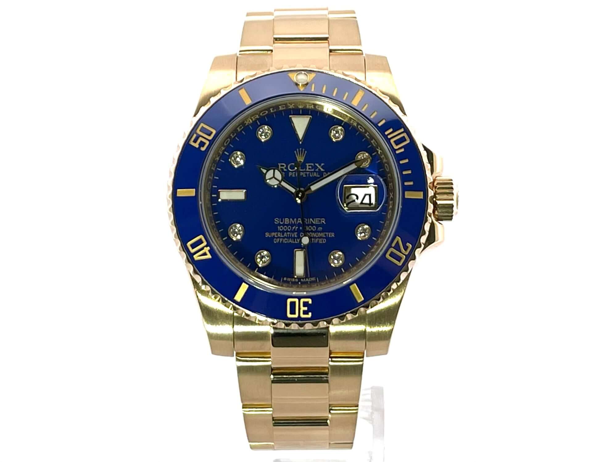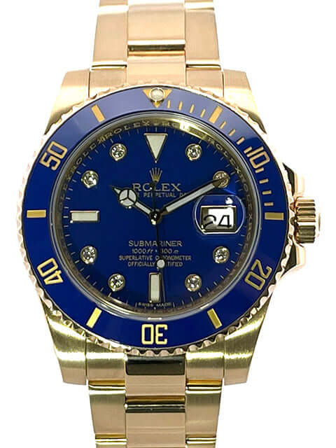 Gehäuse aus 18 Karat Gelbgold poliert und satiniert, Gehäusedurchmesser 40 mm, Gehäusehöhe 12,5 mm, 18 Karat Gelbgold Lünette geriffelt, drehbar mit blauer Keramik Einlage, 60 Minuten Skala und Leuchtpunkt auf der 12 Uhr Position, Oyster 18 Karat Gelbgold Armband poliert und satiniert mit Sicherheitsfaltschließe, blaues Zifferblatt mit aufgesetzten Diamanten, goldene Leuchtzeiger, Automatikwerk, Rolex Manufakturkaliber 3135 mit 31 Steinen, Schwingung 28.800 A/h, Datumsanzeige, Chronometer, kratzresistentes Saphirglas, Krone verschraubbar aus 18 Karat Gelbgold mit Flankenschutz, verschraubter Gehäuseboden aus 18 Karat Gelbgold, Wasserdicht bis zu 30 bar.