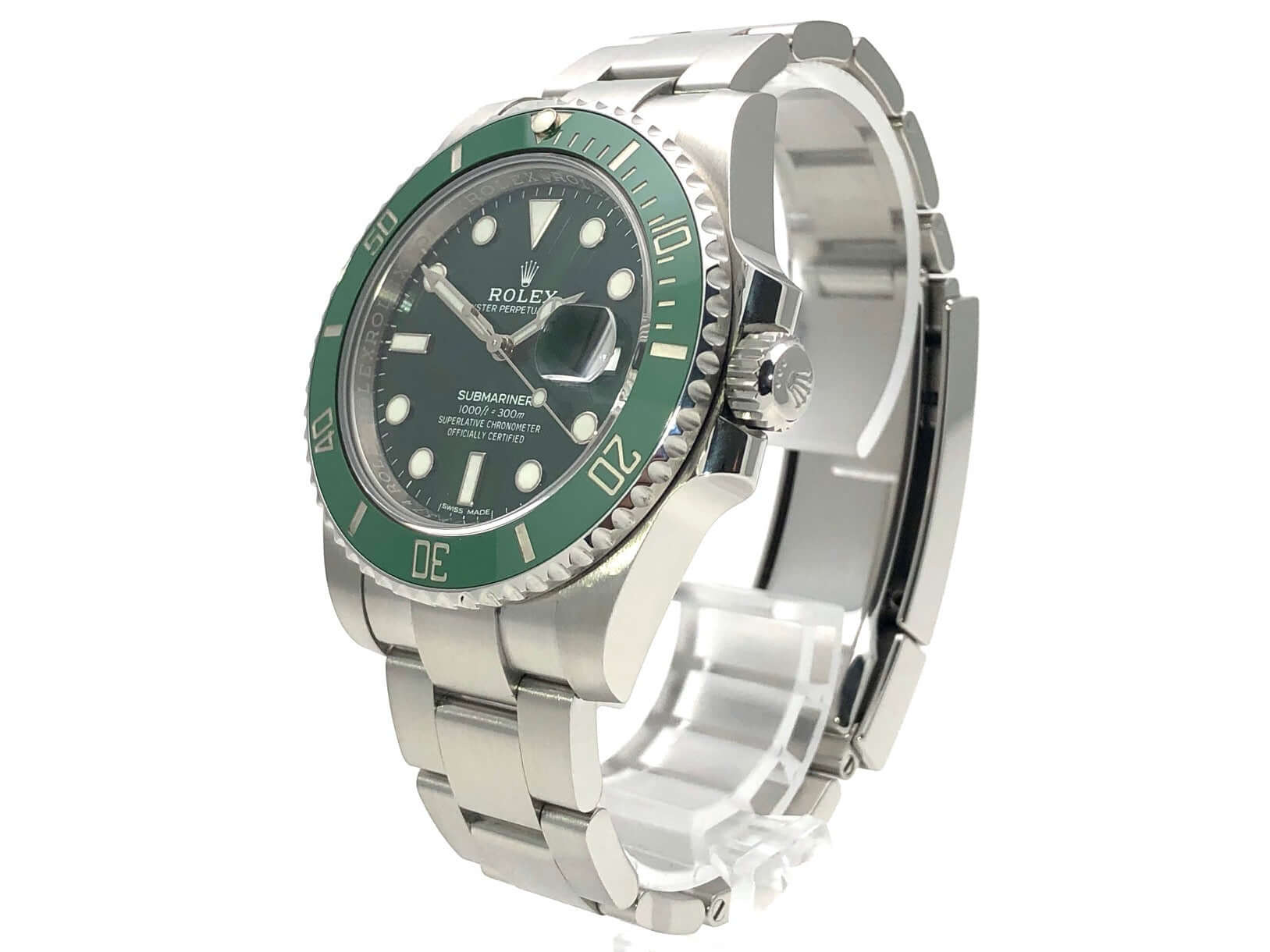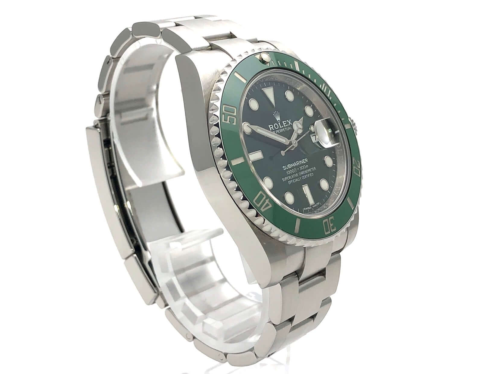 Gehäuse aus Edelstahl poliert und satiniert, Gehäusedurchmesser 40 mm, Gehäusehöhe 12,5 mm, Edelstahl Lünette mit grüner Keramik Einlage, 60 Minuten Skala und Leuchtpunkt drehbar, Oyster Edelstahlband poliert und satiniert mit Sicherheitsfaltschließe, grünes Zifferblatt mit aufgesetzten Leuchtindizes und Leuchtpunkten, Leuchtzeiger, Automatikwerk, Kaliber Rolex 3135 mit 31 Steine, 28.800 A/h, Datumsanzeige mit Schnellverstellung und Lupe, Chronometer, Saphirglas, Krone verschraubt mit Flankenschutz, Edelstahlboden verschraubt, Wasserdicht bis zu 30 bar.