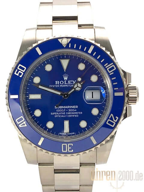 Gehäuse aus 18 kt Weißgold poliert und satiniert, Lünette aus 18 kt Weißgold gerädelt mit blauer Cerachrom Einlage, Oyster Armband aus 18 kt Weißgold poliert und satiniert mit Sicherheitsfaltschließe, blaues Zifferblatt mit aus Weißgold gefassten Leuchtindizes und Leuchtzeigern, Automatik, Rolex Manufakturkaliber 3135, Datumsanzeige mit Schnellverstellung über Glaslupe 3 Uhr, Chronometer, Saphirglas entspiegelt, 18 kt Weißgold Triplock Krone mit Flankenschutz und Rolex-Logo verschraubbar, 18 kt Weißgold Boden verschraubt, Wasserdicht bis zu 30 bar.