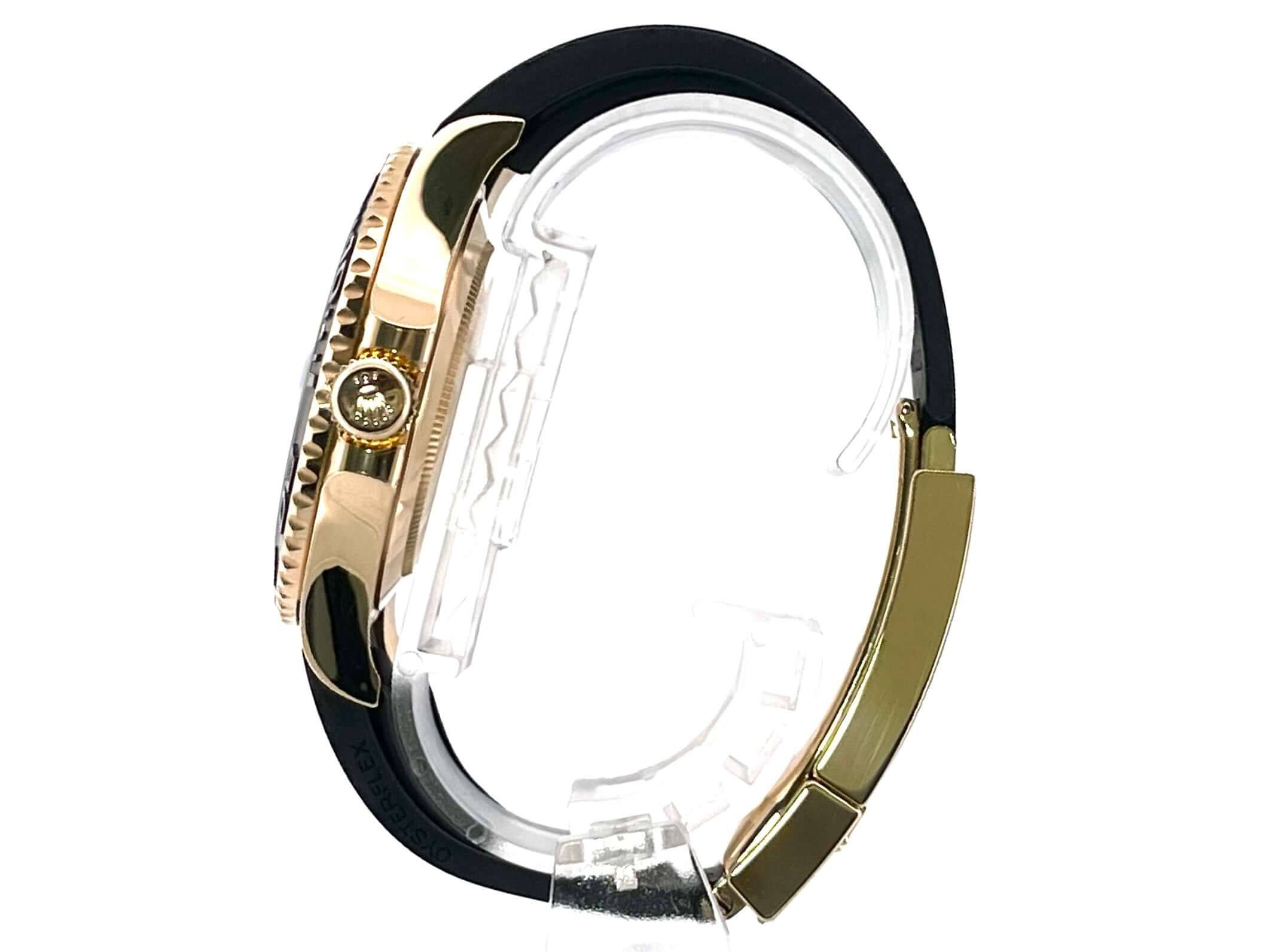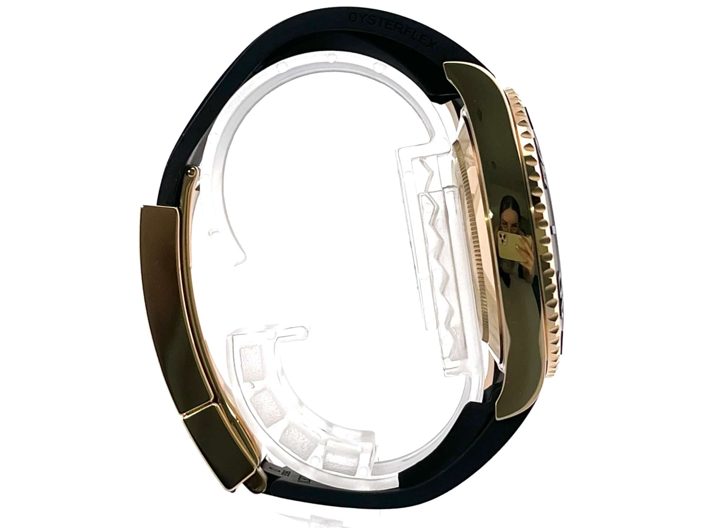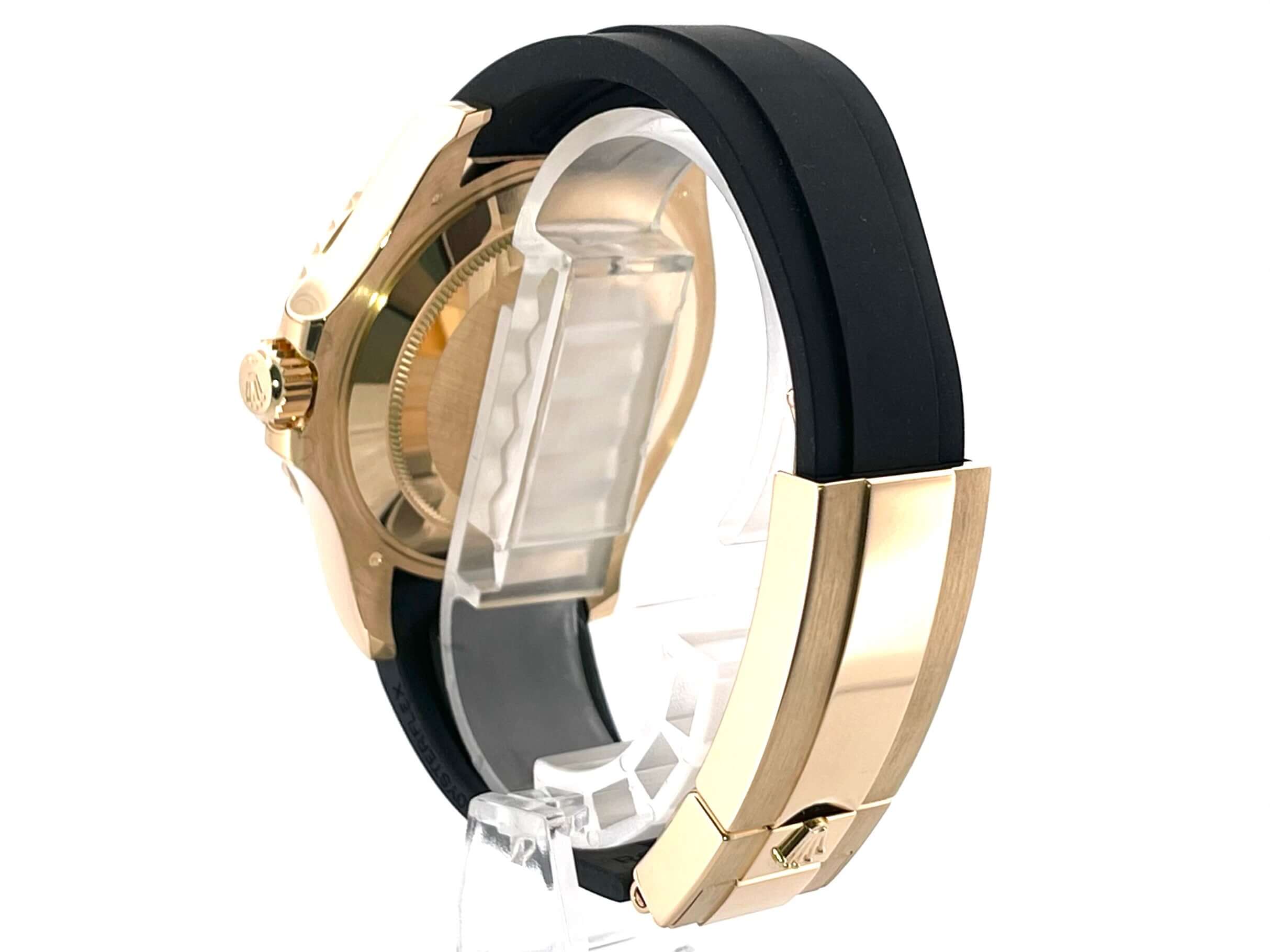 Gehäuse aus 18 kt Gelbgold poliert und satiniert, Gehäusedurchmesser 42 mm, Lünette aus 18 kt Gelbgold mit Keramik Einlage, beidseitig drehbar, Oyster Kautschukband mit Sicherheitsfaltschließe, schwarzes Zifferblatt mit gefassten Leuchtindizes und Leuchtpunkten, Leuchtzeiger, Automatikwerk, Rolex Manufakturkaliber 3235 mit 31 Steine, Schwingung 28.800 A/h, 70 Stunden Gangreserve, Datumsanzeige, Chronometer, kratzresistentes Saphirglas, verschraubbare Krone mit Flankenschutz, 18 kt Gelbgold Boden verschraubt, wasserdicht bis zu 10 bar.