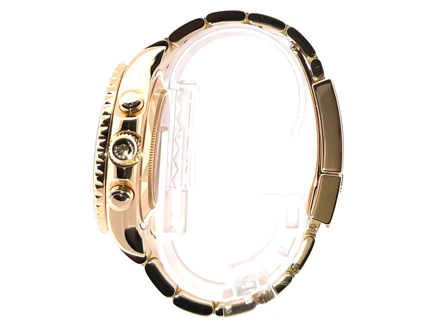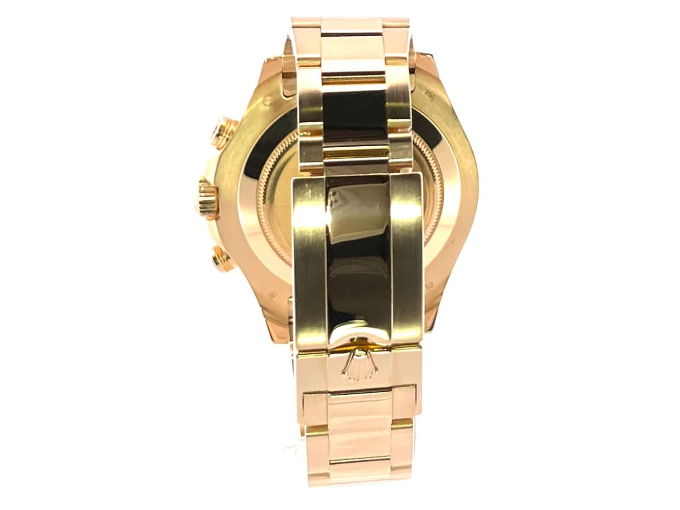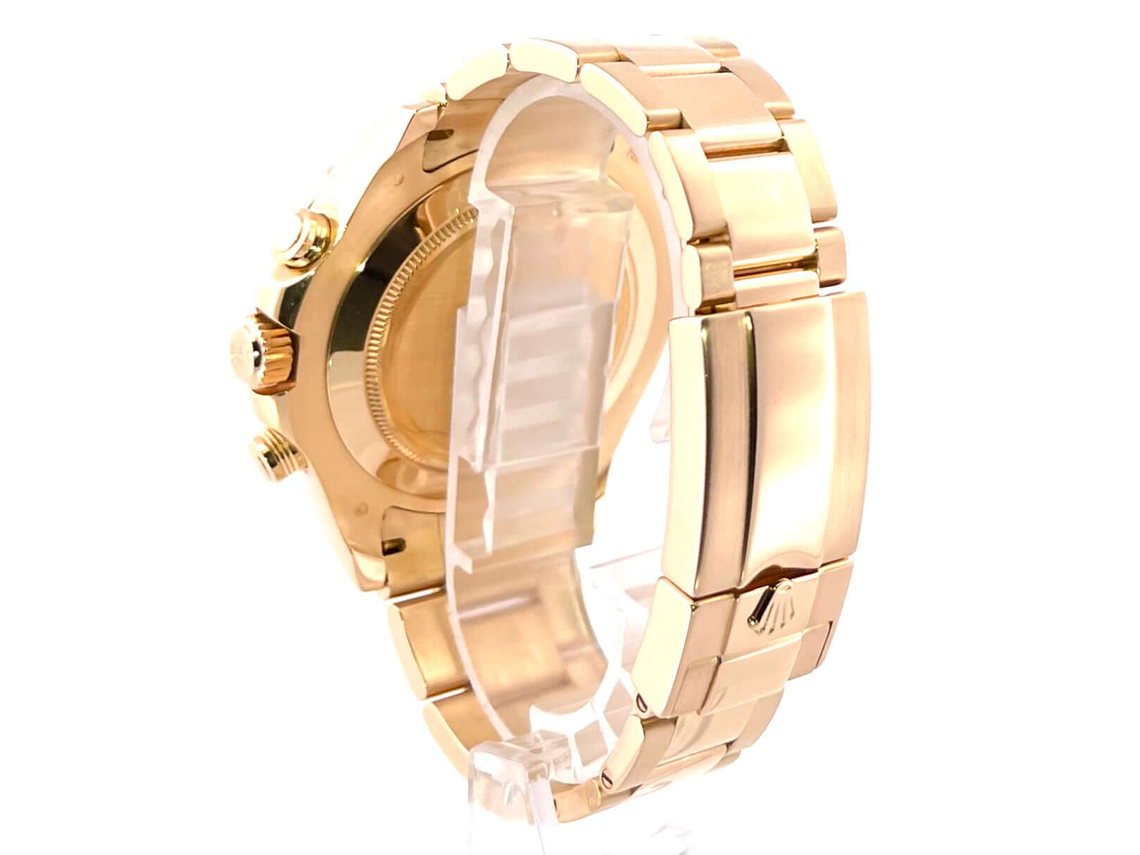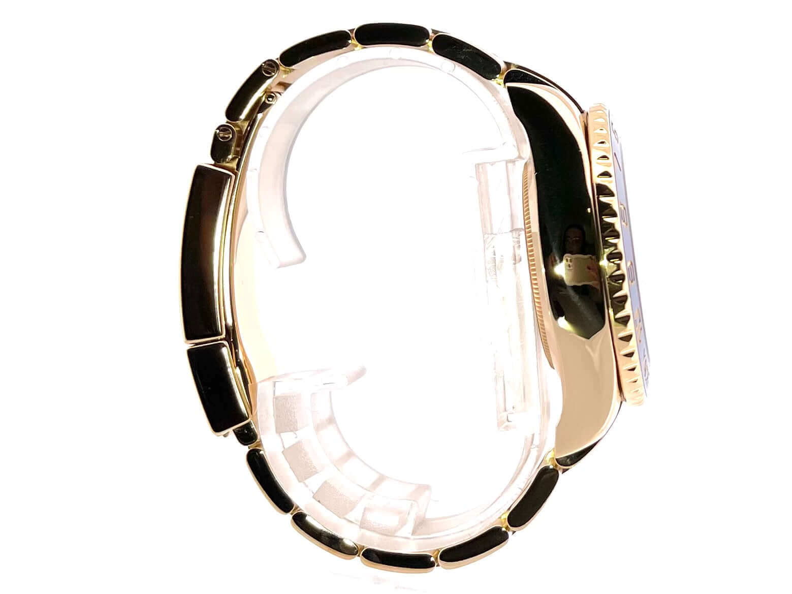 Gehäuse aus 18 kt Gelbgold poliert und satiniert, Gehäusedurchmesser 44 mm, Lünette aus 18 kt Gelbgold mit blauer Keramik Einlage, Oyster Armband aus 18 kt Gelbgold poliert und satiniert mit Faltschließe, weißes Zifferblatt mit Leuchtindizes und Leuchtzeiger, Automatikwerk, Rolex Manufakturkaliber 4161 mit 31 Steine, Schwingung 28.800 A/h, Chronometer, kleine Sekundenanzeige bei 6 Uhr, kratzfestes Saphirglas, verschraubter Boden aus 18 kt Gelbgold, Wasserdicht bis zu 10 bar.
