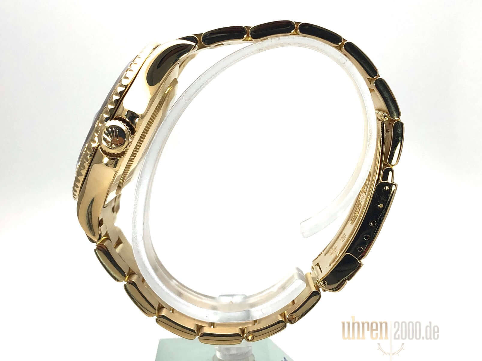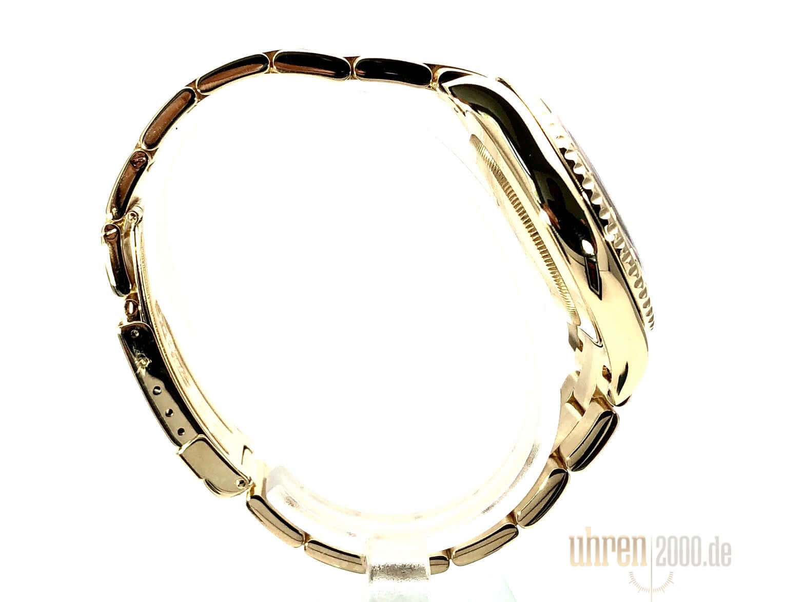 Gehäuse aus 18 kt Gelbgold poliert und satiniert, Lünette 18 kt Gelbgold mit 60 Minuten Skala, einseitig drehbar, 18 kt Gelbgold Armband mit Sicherheitsfaltschließe, weißes Zifferblatt mit aus Gelbgold gefassten Leuchtindizes, Leuchtzeigern, Automatik, Rolex Manufakturkaliber, Saphirglas, Datumsanzeige über Glaslupe bei 3 Uhr, verschraubte Krone mit Flankenschutz und Hersteller-Logo, 18 kt Gelbgoldboden verschraubt, Wasserdicht bis zu 10 bar.