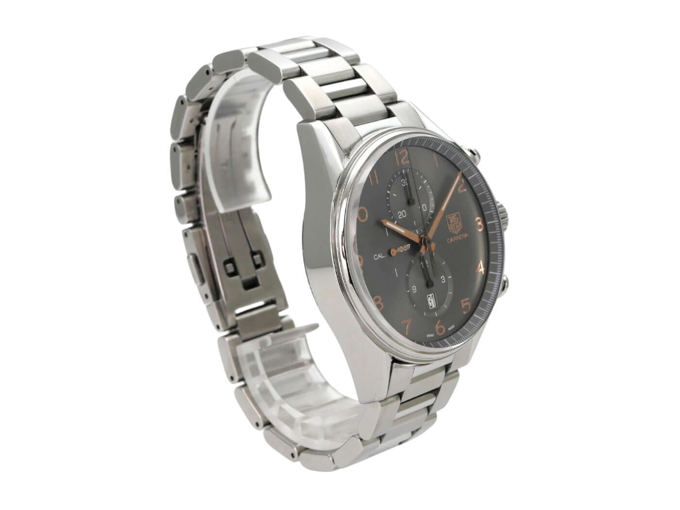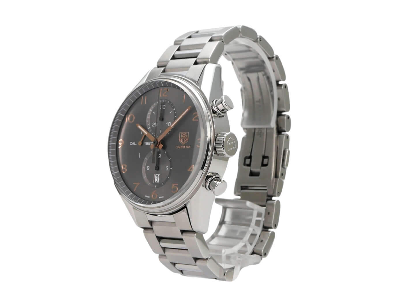 Gehäuse aus Edelstahl poliert, Gehäusedurchmesser 43 mm, Edelstahl Lünette poliert, Armband Edelstahl mit Faltschließe, Zifferblatt anthrazit mit aufgesetzten arabischen Ziffern aus Roségold und roségoldenen Leuchtzeigern, Automatik, Kaliber Tag Heuer 1887, Chronograph, Datumsanzeige, Saphirglas, Edelstahlboden graviert mit Saphirglas, wasserdicht bis zu 10 bar.