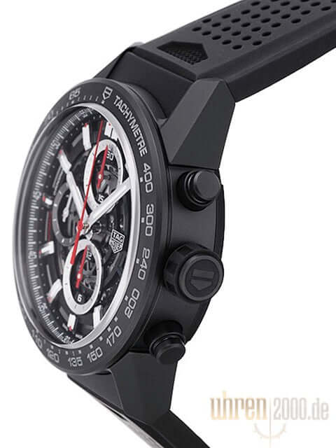 Gehäuse aus mattschwarzer Keramik, Gehäusedurchmesser 43 mm, Keramik Lünette mit Tachymeterskala, schwarzes Kautschukband mit Faltschließe, skelettiertes Zifferblatt mit aufgesetzten Leuchtindexen, Leuchtzeiger, Automatikwerk, Kaliber Tag Heuer 01, Chronograph, Datumsanzeige, kleine Sekunde auf der 9-Uhr Position, entspiegeltes Saphirglas, Edelstahlboden mit schwarzer PVD-Beschichtung und Saphirglas Sichtfenster, Wasserdicht bis zu 10 bar.