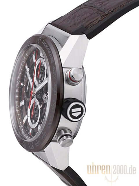 Gehäuse aus Edelstahl, Gehäusedurchmesser 43 mm, braune Keramik Lünette mit Tachymeterskala, braunes Lederband mit Faltschließe, skelettiertes braunes Zifferblatt mit aufgesetzten Leuchtindexen, Leuchtzeiger, Automatikwerk, Kaliber Tag Heuer 01, kleine Sekunde auf der 9-Uhr Position, Datumsanzeige, Chronograph, entspiegeltes Saphirglas, Edelstahlboden mit Saphirglas Sichtfenster, Wasserdicht bis zu 10 bar.