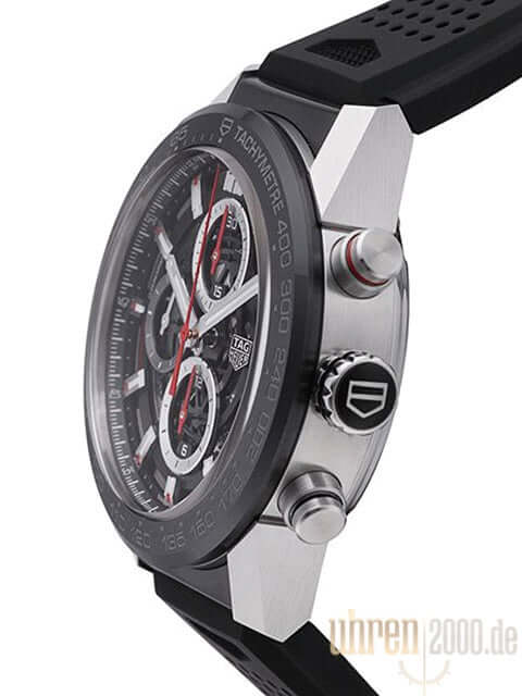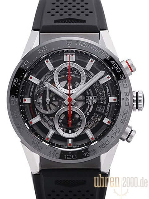 Gehäuse aus Edelstahl, Gehäusedurchmesser 43 mm, schwarze Keramik Lünette mit Tachymeterskala, skelettiertes Zifferblatt mit aufgesetzten Leuchtindexen, Leuchtzeiger, schwarzes Kautschukband mit Faltschließe, Automatikwerk, Kaliber Tag Heuer 01, Datumsanzeige, Chronograph, kleine Sekunde auf der 9-Uhr Position, entspiegeltes Saphirglas, Edelstahlboden mit Saphirglas Sichtfenster, Wasserdicht bis zu 10 bar.