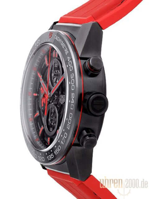 Gehäuse aus Edelstahl mit schwarzer PVD-Beschichtung, Gehäusedurchmesser 45 mm, Keramik Lünette mit Tachymeterskala, rotes Zifferblatt mit aufgesetzten Leuchtindexen, Leuchtzeiger, rotes Krokoleder / Kautschukband mit Titan Faltschließe, Automatikwerk, Kaliber Tag Heuer 01, Chronograph, Datum, kleine Sekunde auf der 9-Uhr Position, entspiegeltes Saphirglas, Edelstahlboden mit schwarzer PVD-Beschichtung und Saphirglasfenster, Wasserdicht bis zu 10 bar.