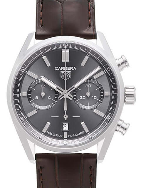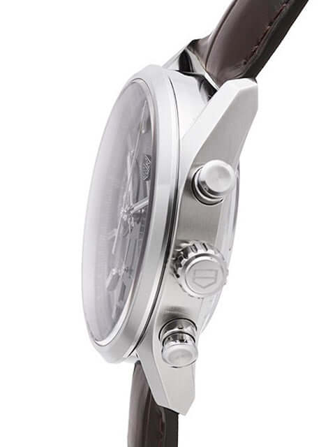 Gehäuse aus Edelstahl, Gehäusedurchmesser 42 mm, polierte Edelstahl Lünette, braunes Lederband mit Faltschließe, graues Zifferblatt mit aufgesetzten Leuchtindizes, Leuchtzeiger, Automatikwerk, Kaliber Tag Heuer 02, 80 Stunden Gangreserve, Chronograph, Datumsanzeige, entspiegeltes Saphirglas, kleine Sekunde, Edelstahlboden mit Saphirglas Sichtfenster, Wasserdicht bis zu 10 bar.