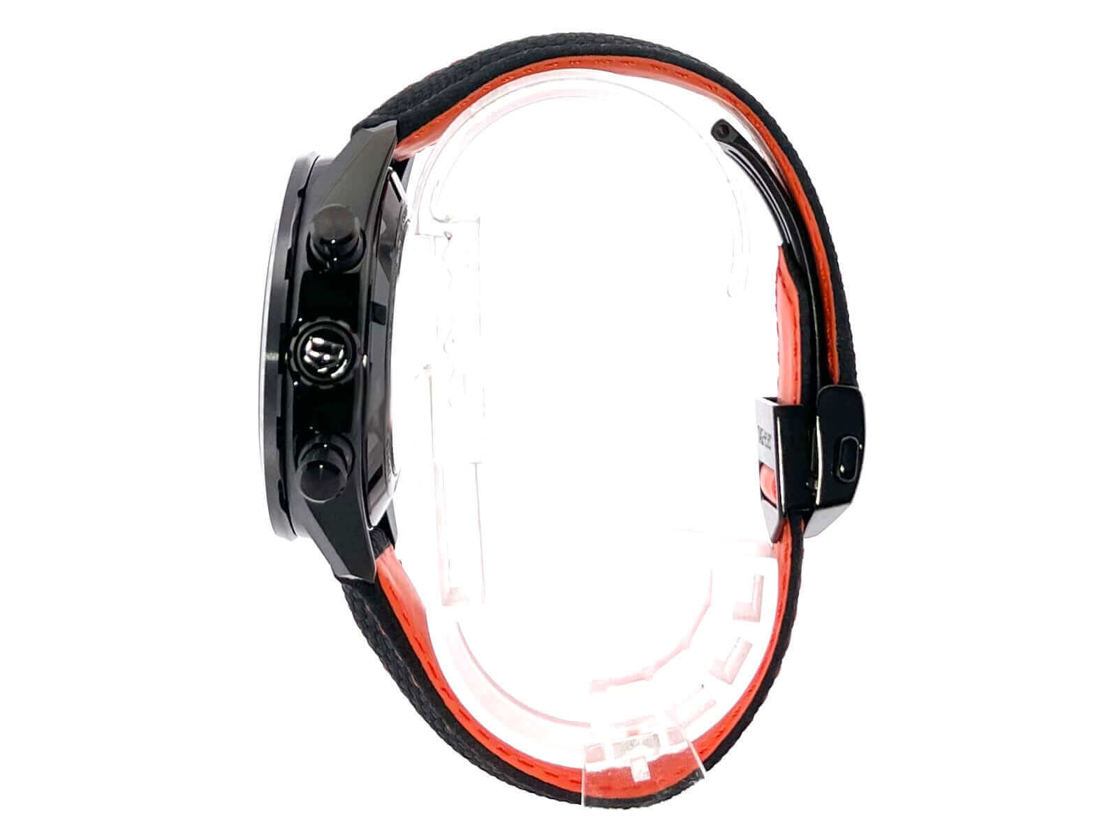 Gehäuse aus Edelstahl mit DLC-Beschichtung, Gehäusedurchmesser 44 mm, schwarze Keramik Lünette mit Tachymeterskala, schwarzes Lederband mit Faltschließe, schwarzes Zifferblatt mit aufgesetzten Leuchtindizes, Leuchtzeiger, Automatikwerk, Kaliber Tag Heuer 02, 80 Stunden Gangreserve, Chronograph, Datumsanzeige, entspiegeltes Saphirglas, kleine Sekunde, Edelstahlboden mit Saphirglas Sichtfenster, Wasserdicht bis zu 10 bar.
