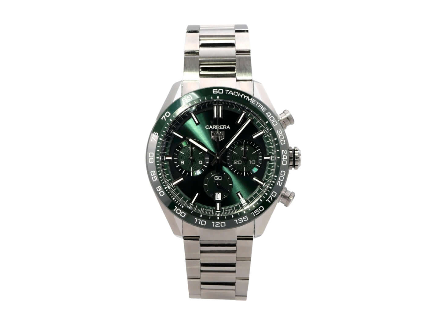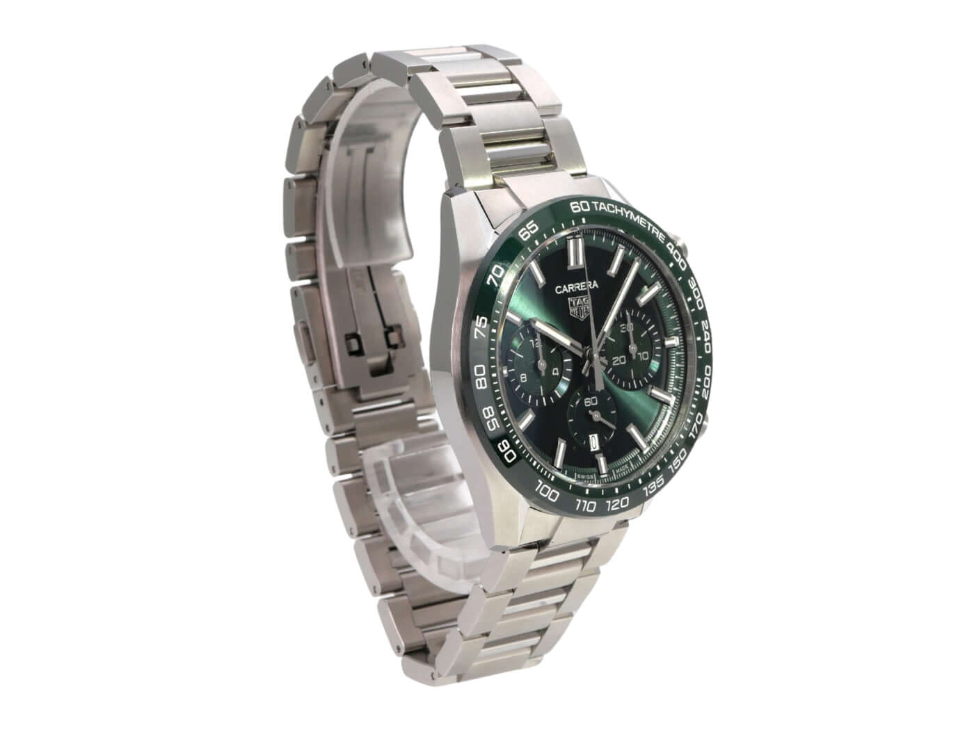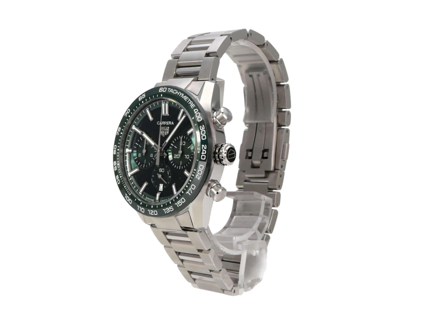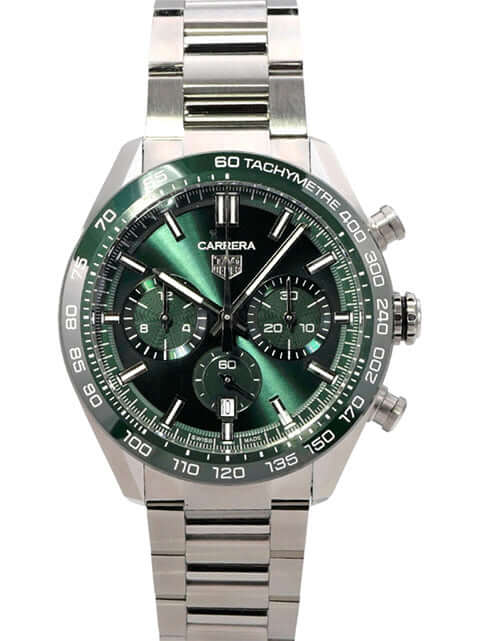 Gehäuse aus Edelstahl, Gehäusedurchmesser 44 mm, grüne Keramik Lünette mit Tachymeterskala, satiniertes Edelstahlband mit Faltschließe, grünes Zifferblatt mit aufgesetzten Leuchtindizes, Leuchtzeiger, Automatikwerk, Kaliber Tag Heuer TH20-00, 80 Stunden Gangreserve, Chronograph, Datumsanzeige, entspiegeltes Saphirglas, kleine Sekunde, Edelstahlboden mit Saphirglas Sichtfenster, wasserdicht bis zu 10 bar.