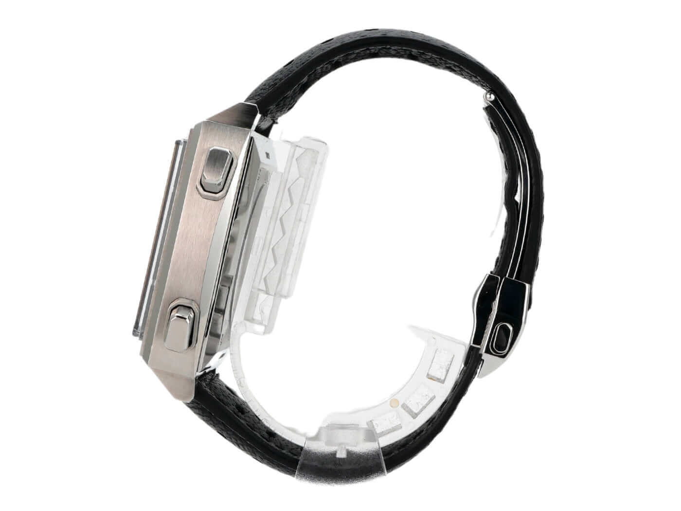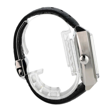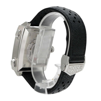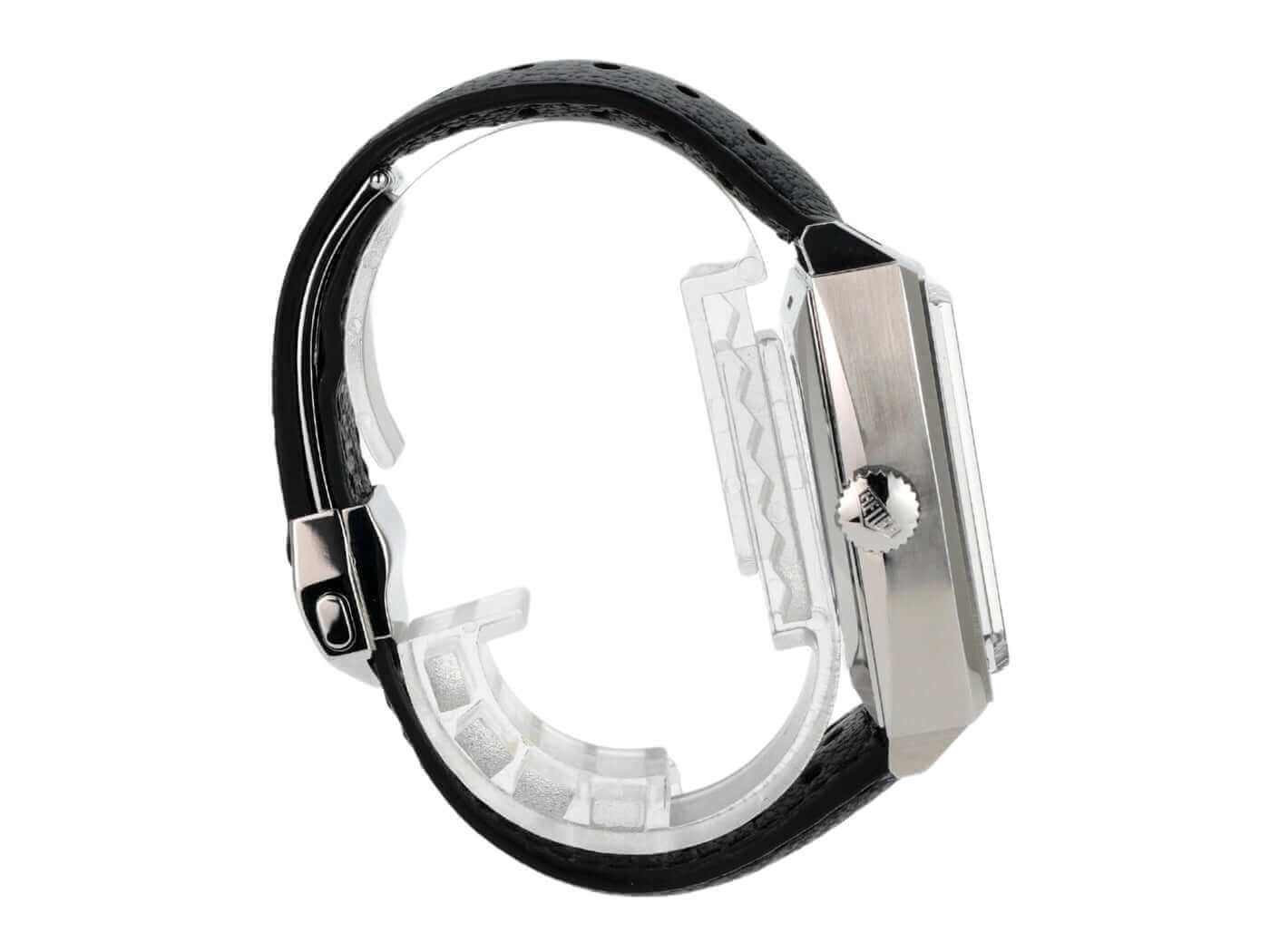 Gehäuse aus Edelstahl poliert und satiniert, rechteckig, Lange 39 mm x Breite 39 mm, schwarzes Lederband mit Faltschließe, blaues Zifferblatt mit aufgesetzten Indexen, Leuchtzeiger, Uhrwerk Automatik, Kaliber Tag Heuer 11, Chronograph, Datumsanzeige, Saphirglas, Edelstahlboden verschraubt, graviert mit Sichtboden, wasserdicht bis zu 10 bar.