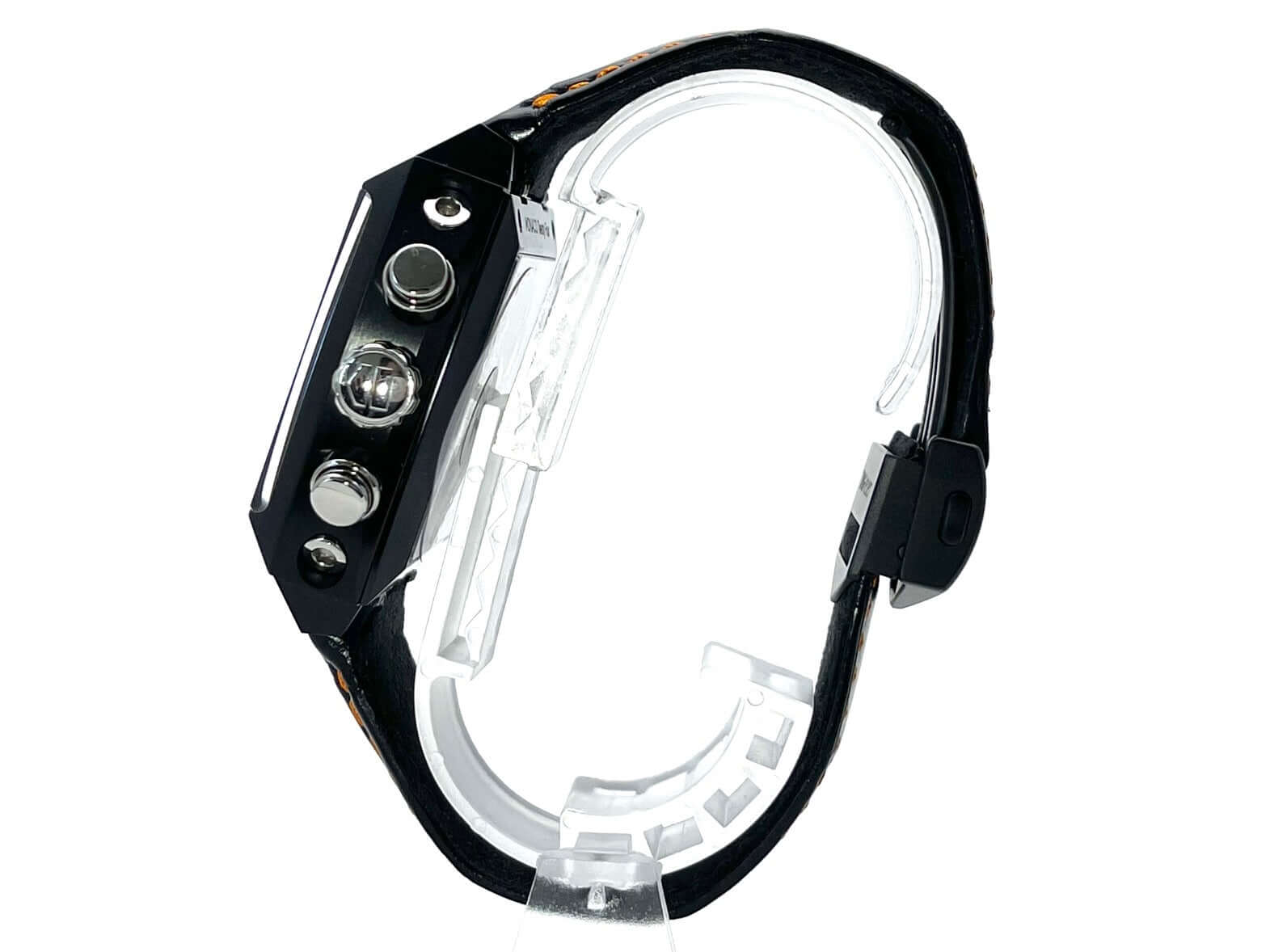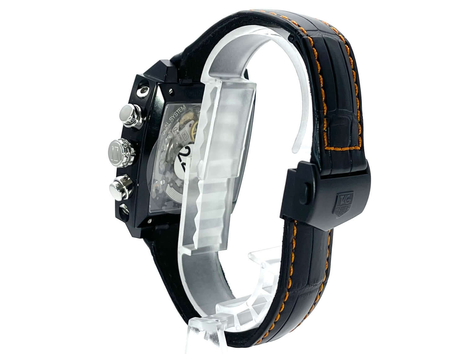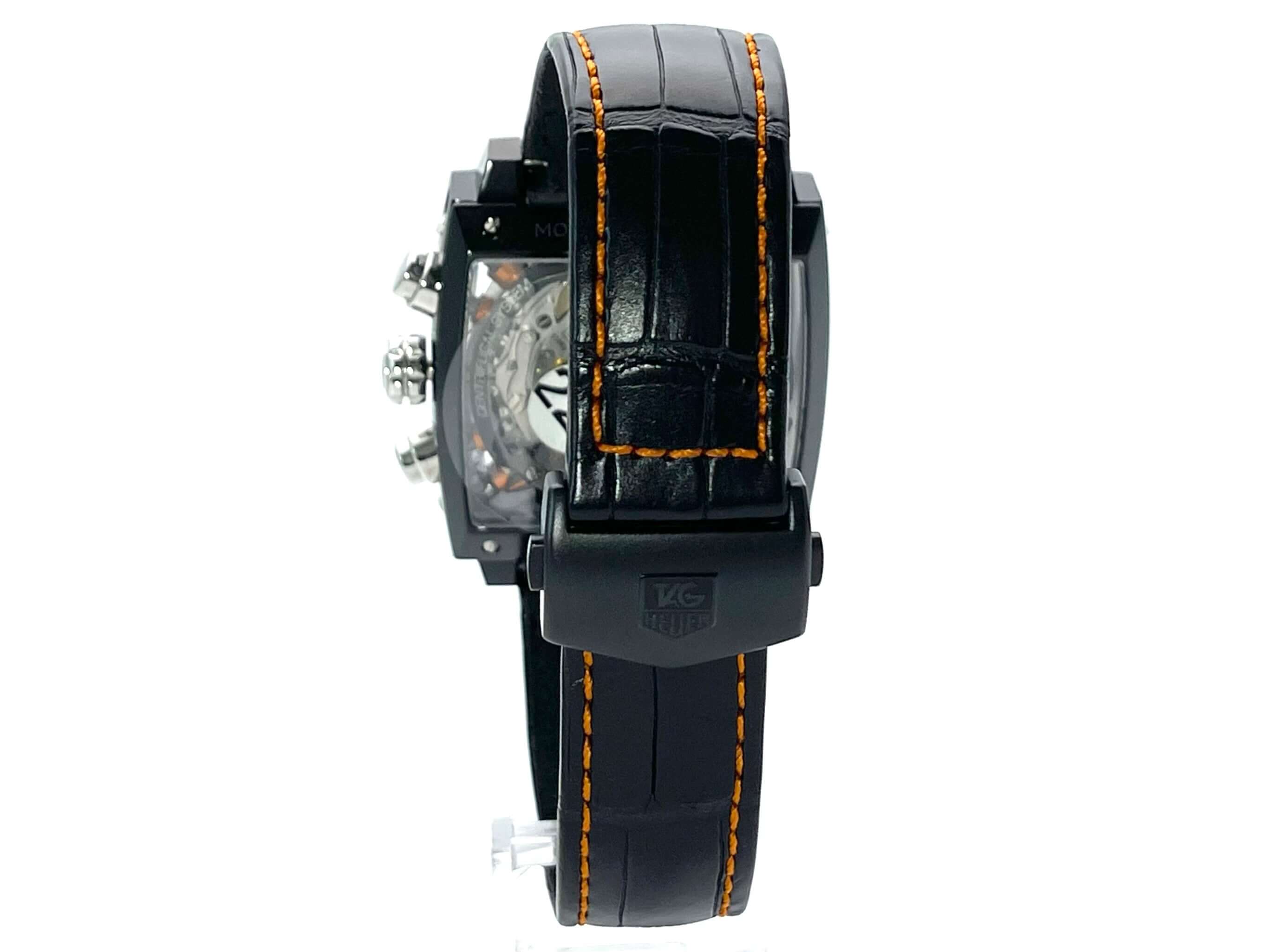Gehäuse aus Edelstahl mit schwarzer DLC Beschichtung, rechteckig, Lange 40,5 mm x Breite 40,5 mm, schwarzes Lederband mit Faltschließe, schwarzes Zifferblatt mit aufgesetzten Indizes, Leuchtzeiger, Uhrwerk Automatik, Kaliber Tag Heuer 36, Chronograph, Datumsanzeige, Saphirglas, Edelstahlboden verschraubt und graviert, Sichtfenster, Wasserdicht bis zu 10 bar.