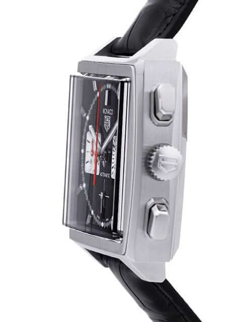 Gehäuse aus Edelstahl poliert und satiniert, rechteckig, Lange 39 mm x Breite 39 mm, schwarzes Lederband mit Faltschließe, schwarzes Zifferblatt mit aufgesetzten Indizes, Leuchtzeiger, Automatik, Kaliber Tag Heuer 02, Datumsanzeige, Chronograph, 80 Stunden Gangreserve, Saphirglas, Edelstahlboden verschraubt mit Sichtboden, Wasserdicht bis zu 10 bar.
