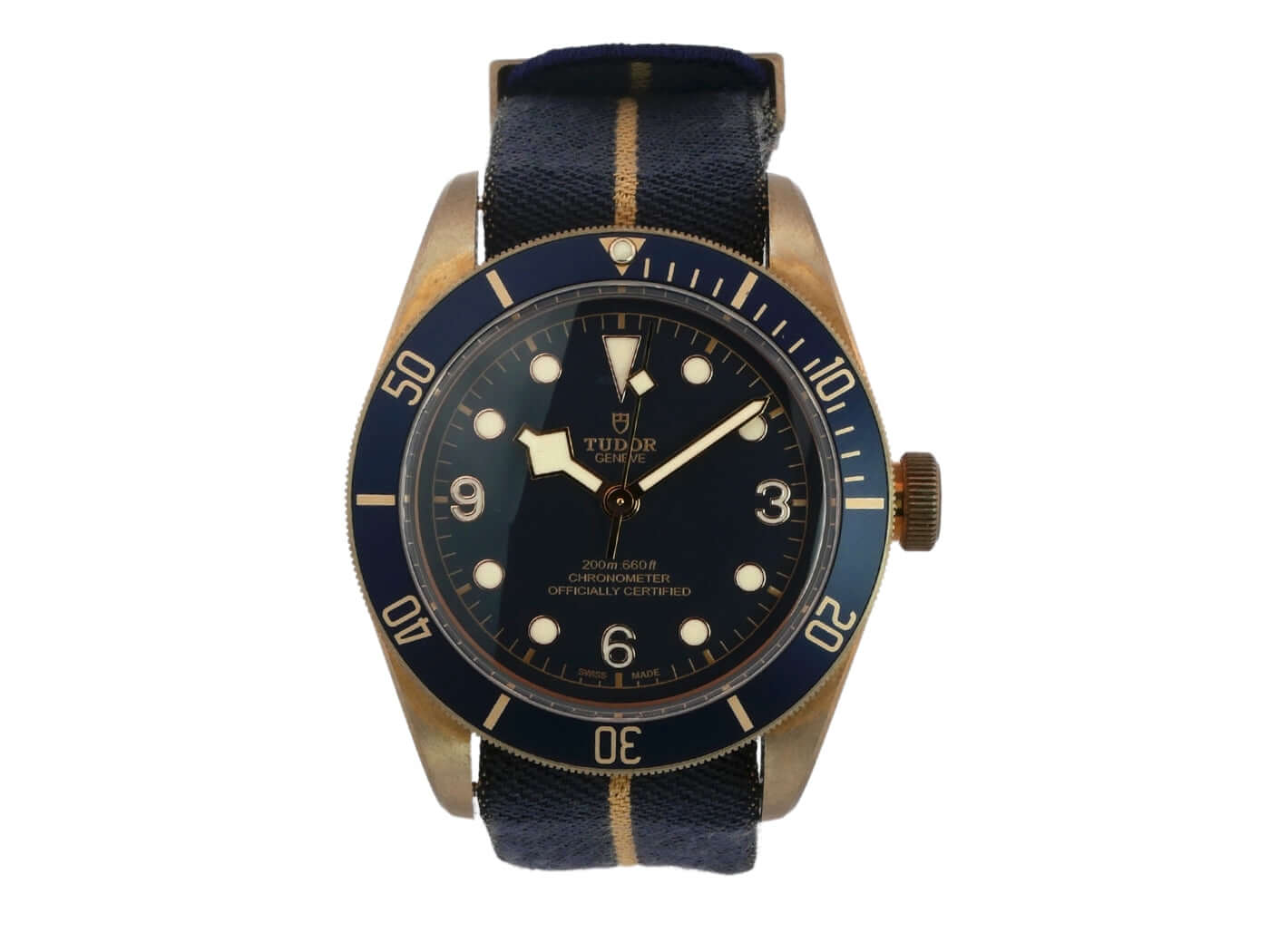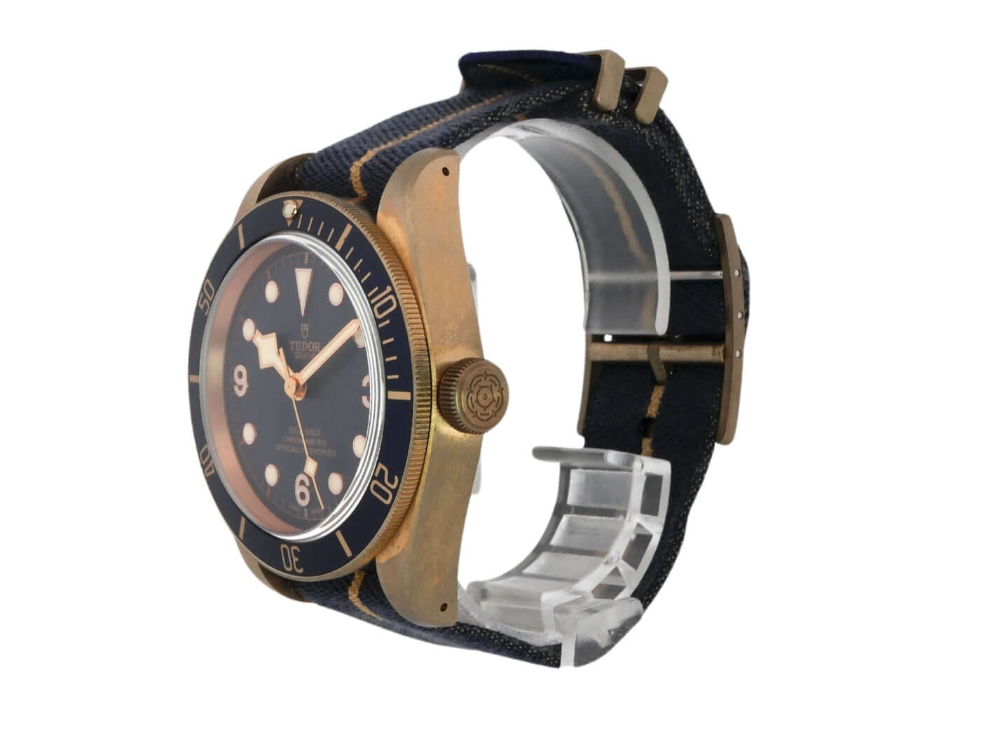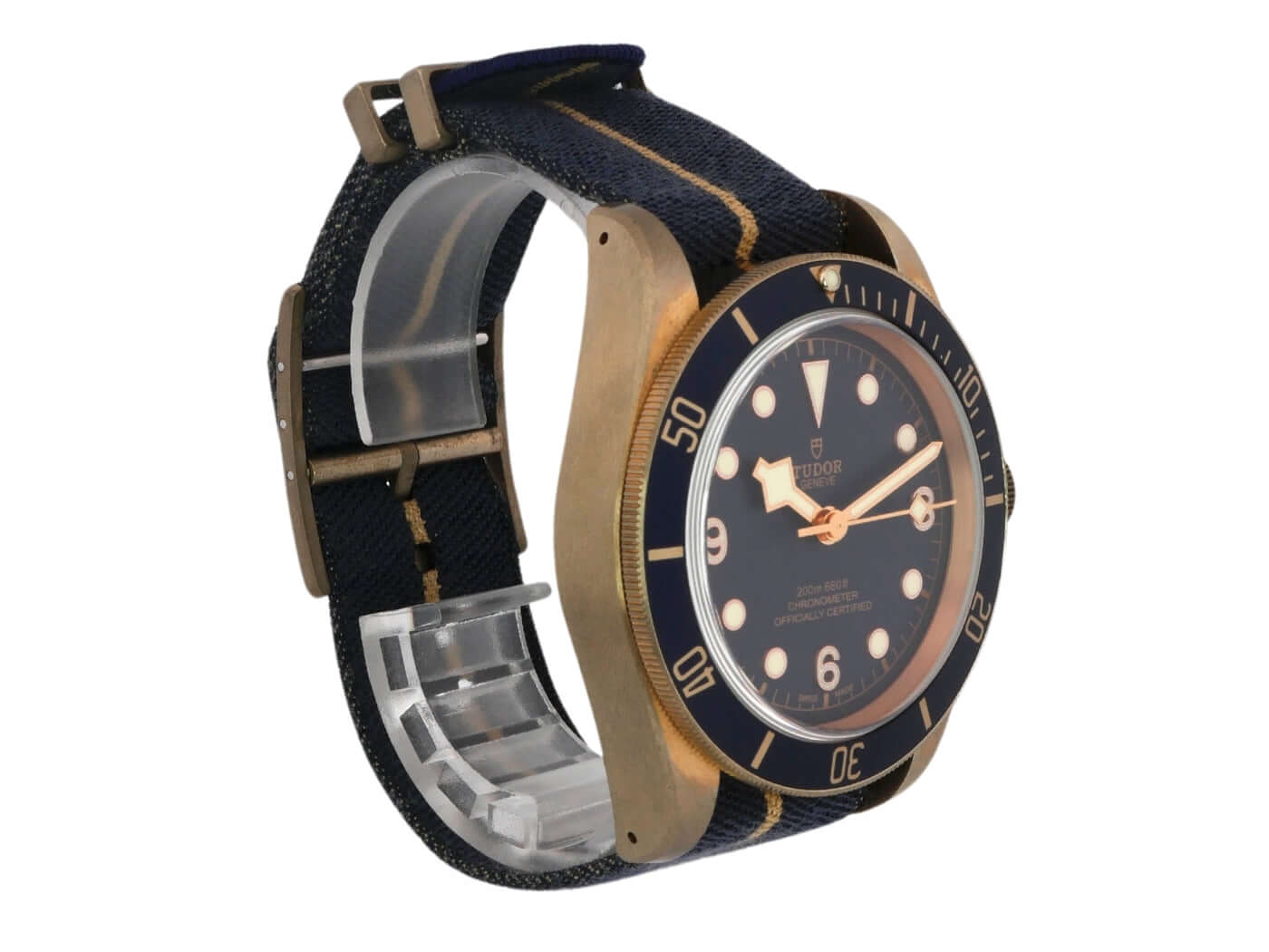 Gehäuse aus Bronze satiniert, Gehäusedurchmesser 43 mm, Bronze Lünette mit blauer Einlage, 60 Minuten Skala und Leuchtpunkt, einseitig drehbar, blaues Textilarmband mit Dornschließe, blaues Zifferblatt mit aufgesetzten roségoldenen Leuchtindizes, roségoldene Leuchtzeiger, Automatik, Manufakturwerk TUDOR MT5601, Saphirglas, verschraubte Krone, Gehäuseboden aus bronzefarbenen PVD-beschichtetem Edelstahl, Wasserdicht bis zu 20 bar.